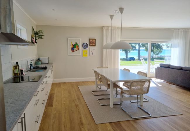 Open living room with kitchen and dining area, which opens onto the large terrace. Here you can enjoy the panoramic view of the lake, have breakfast in the morning sun or have long barbecue evenings with family and friends