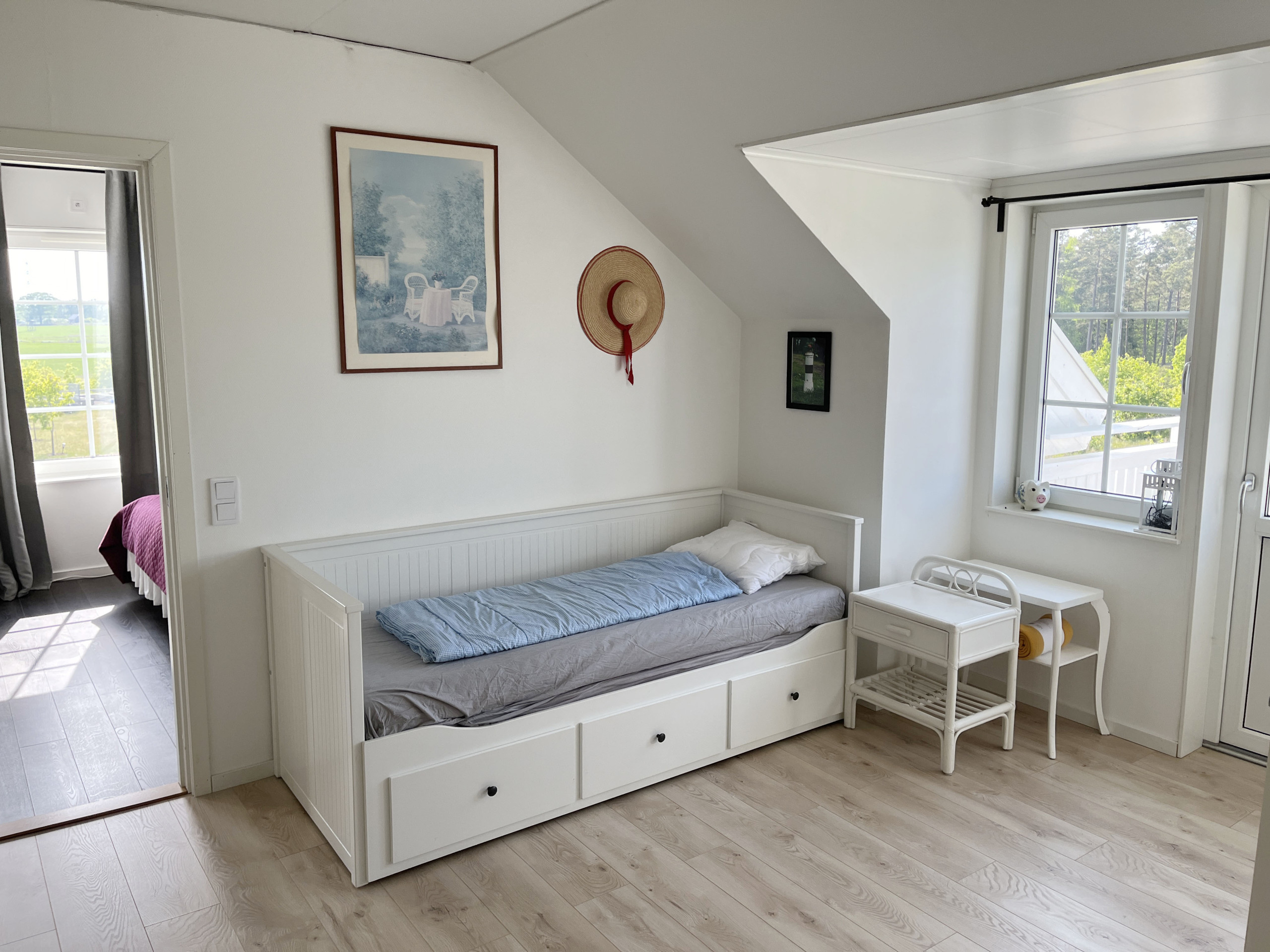 The upper floor has a spacious hall with a sofa bed for two people and access to a balcony, where you can enjoy your morning coffee in the sun. An elegant bathroom with a bathtub offers relaxing moments. There are two bedrooms on this level. One bedroom has a double bed and a single bed, perfect for the family, while the other bedroom has two single beds.