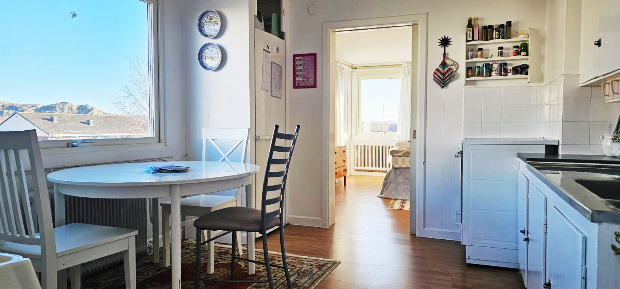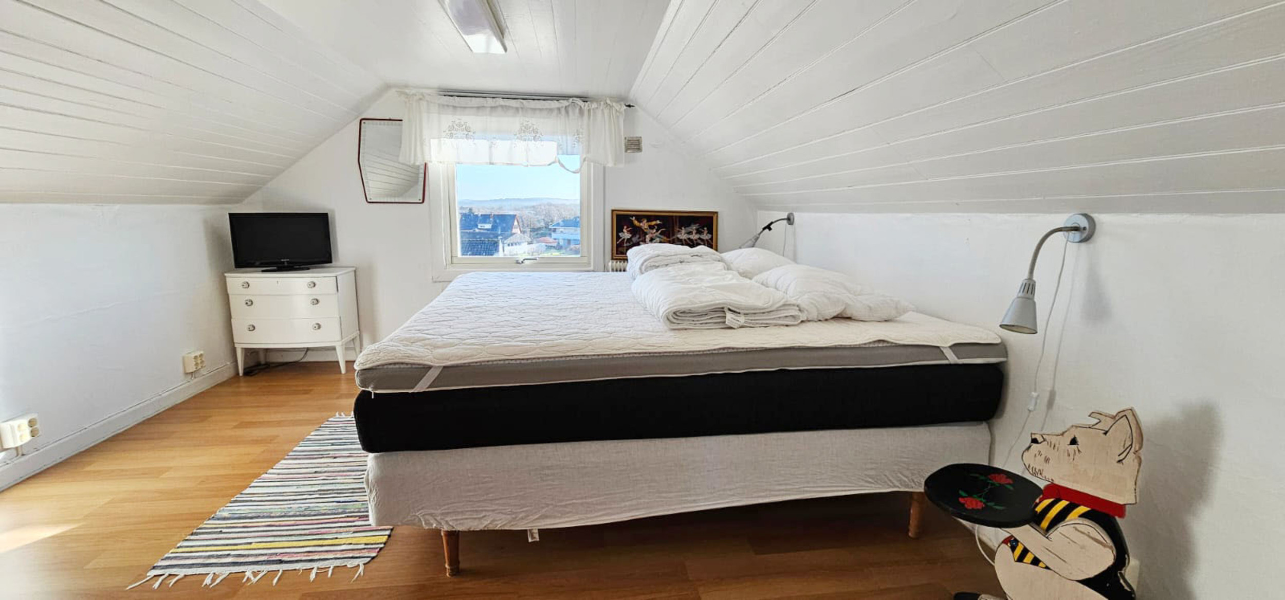 This homely accommodation in central Skärhamn consists of two separate apartments that together offer five bedrooms spread over three floors and a total of twelve regular beds. One of the bedrooms functions as a walk-through room and is furnished with five single beds. The accommodation has two bathrooms with showers and a simple but functional interior that brings to mind classic summer house life with older charm. If you want to make maximum use of all the beds and can imagine sleeping two people in a 140 cm wide bed, there is the possibility of accommodating up to thirteen guests. Here you live close to the sea and the life of the harbor, while you can enjoy the quiet pace of a quiet area. Electricity is included, and pets are welcome upon request, making it a nice option for four-legged family members as well.