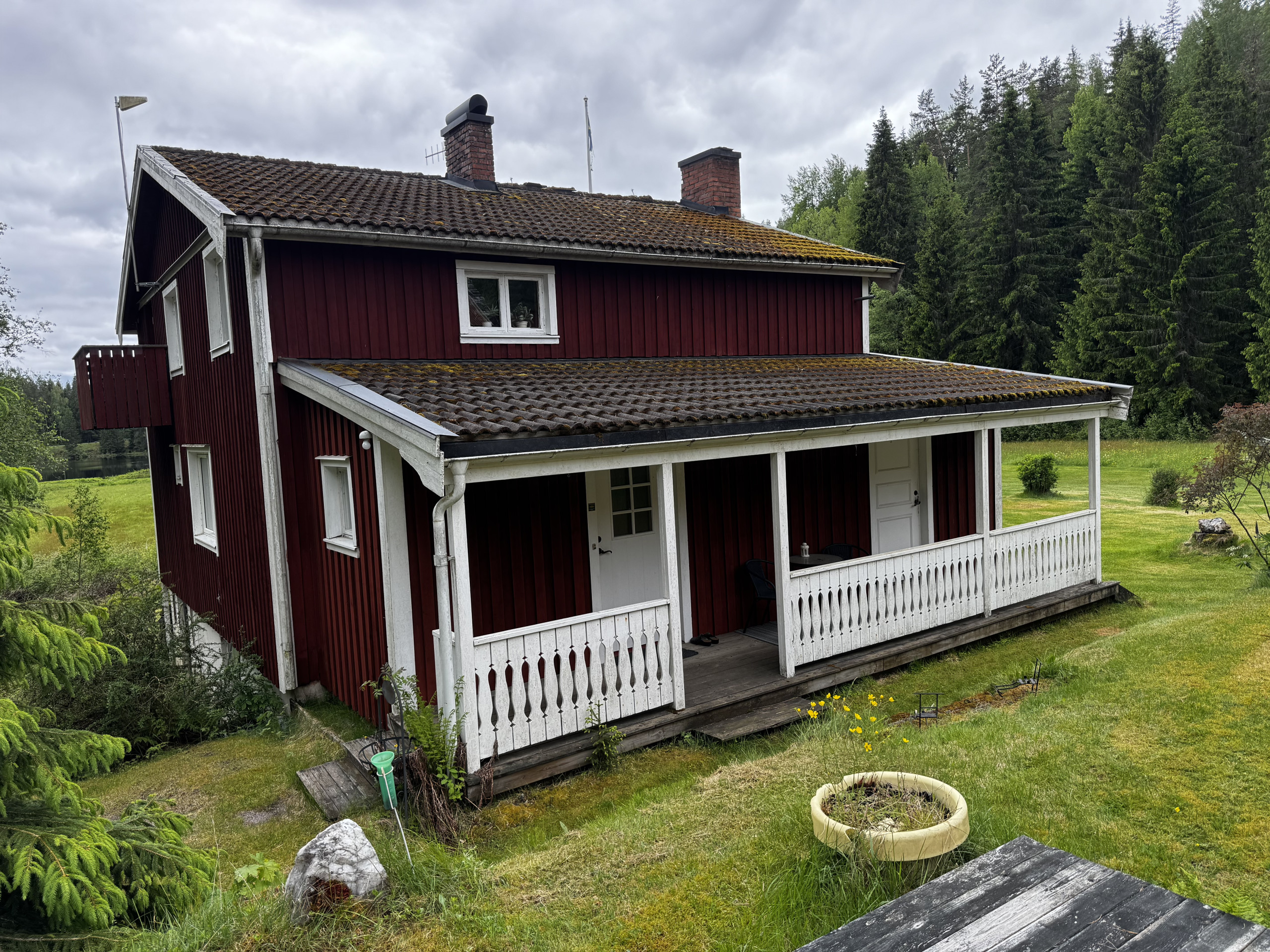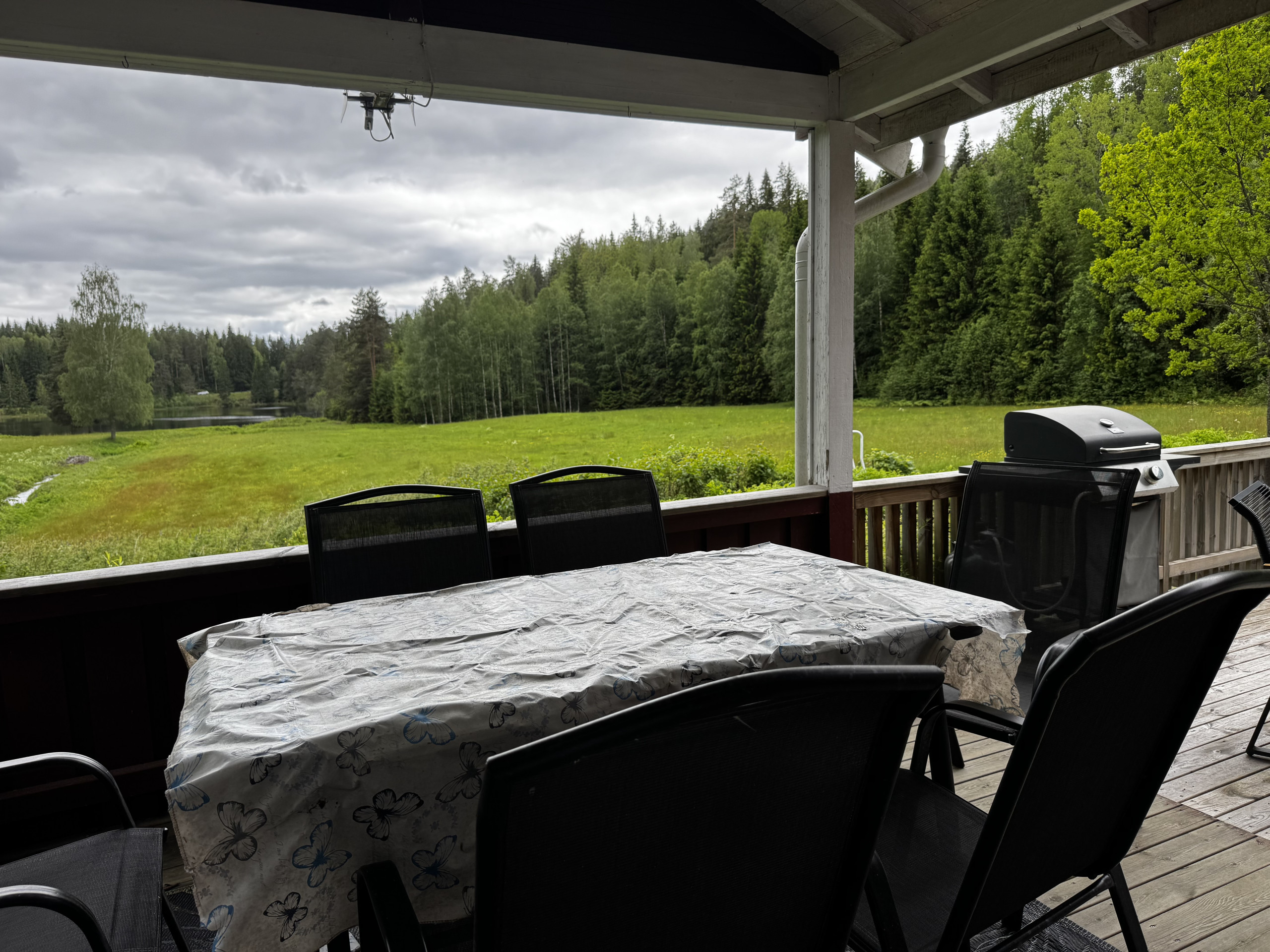 The terrace is partially covered and offers a nice view of both the lake and the forest.