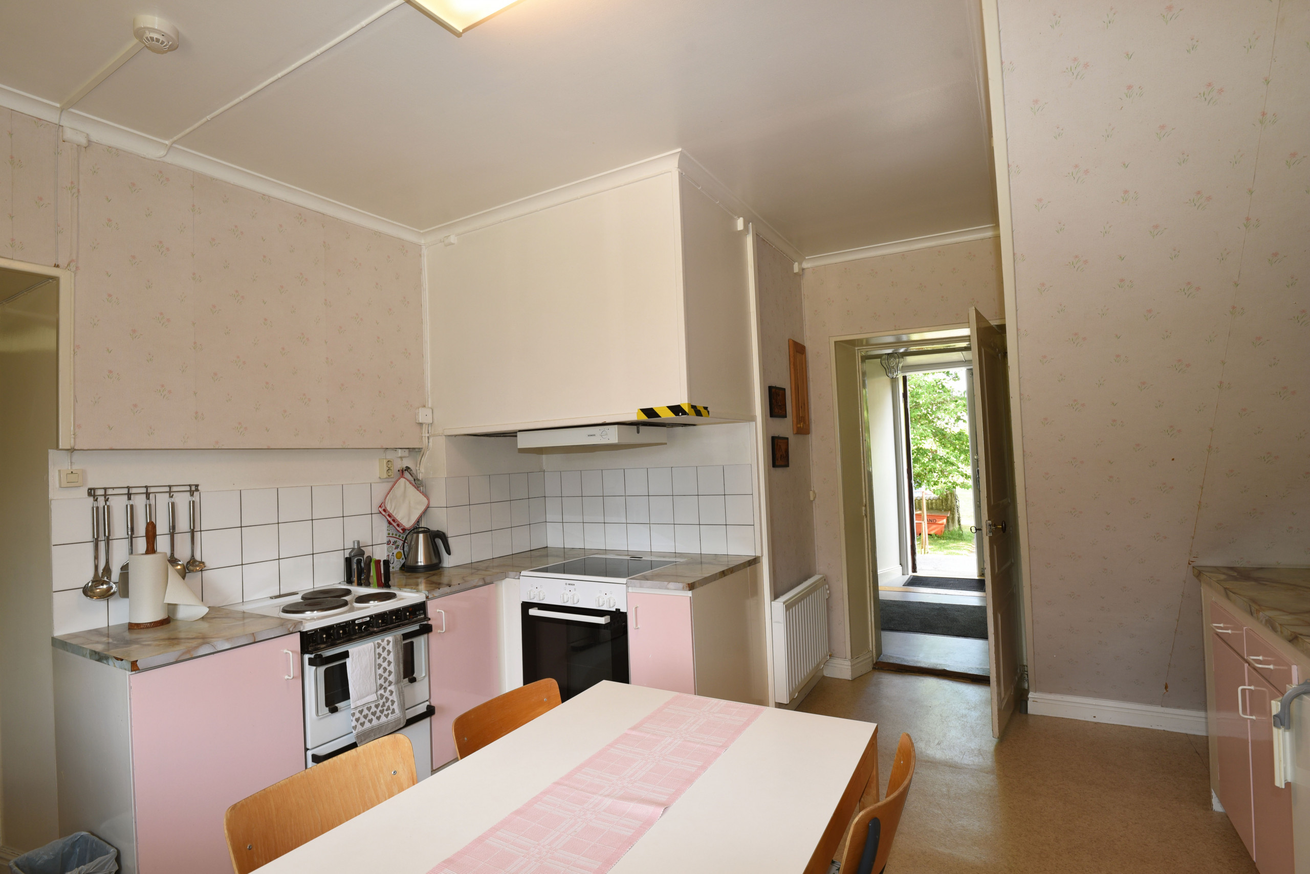 There are two bedrooms on the second floor, one with three beds and one with 5 beds. On the first floor there is a large living room, a well-equipped kitchen with dishwasher and two stoves as well as generous workspaces where you can all cook together. The bathroom is fresh and fully tiled, with a washing machine and also WC.