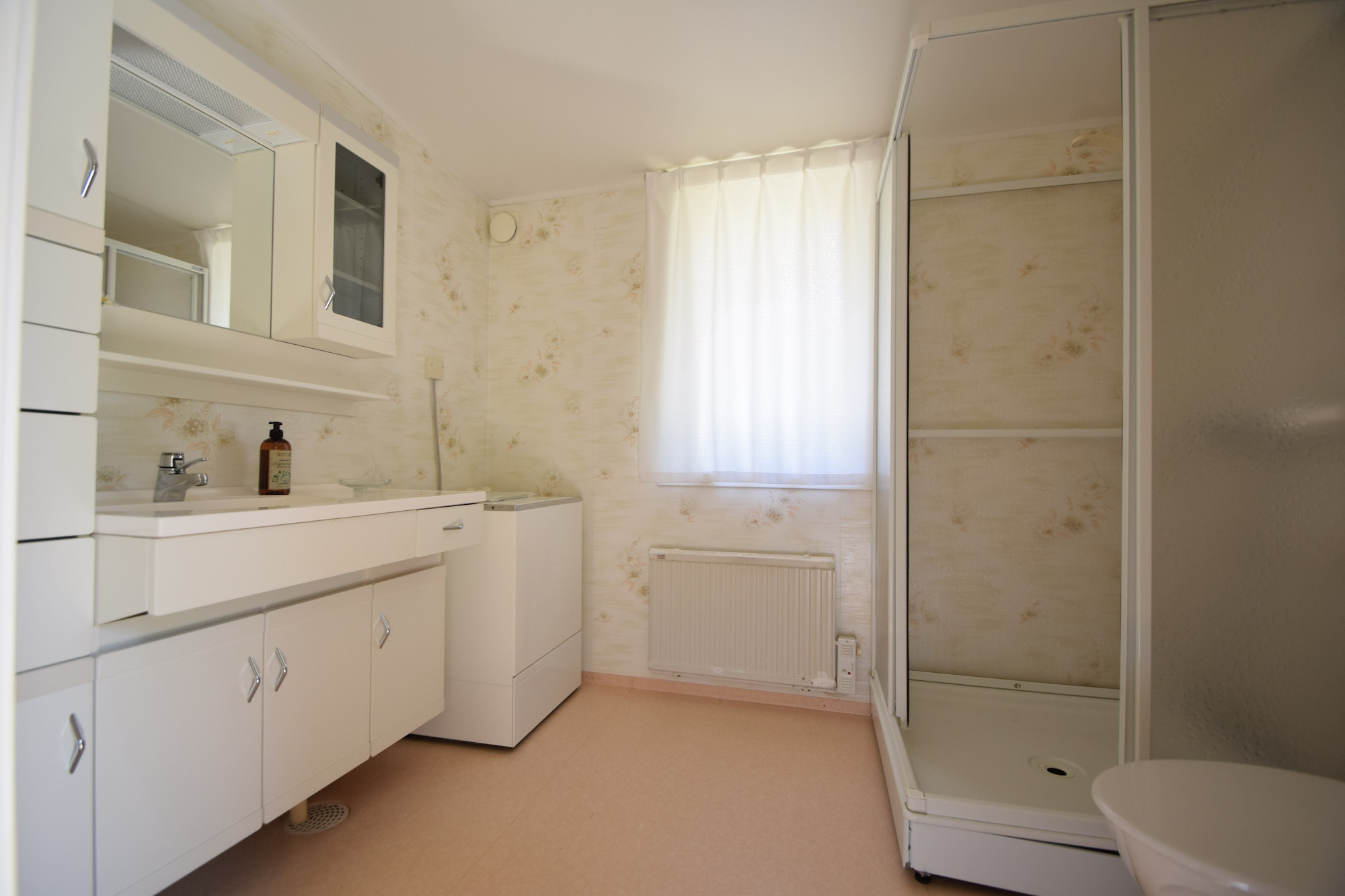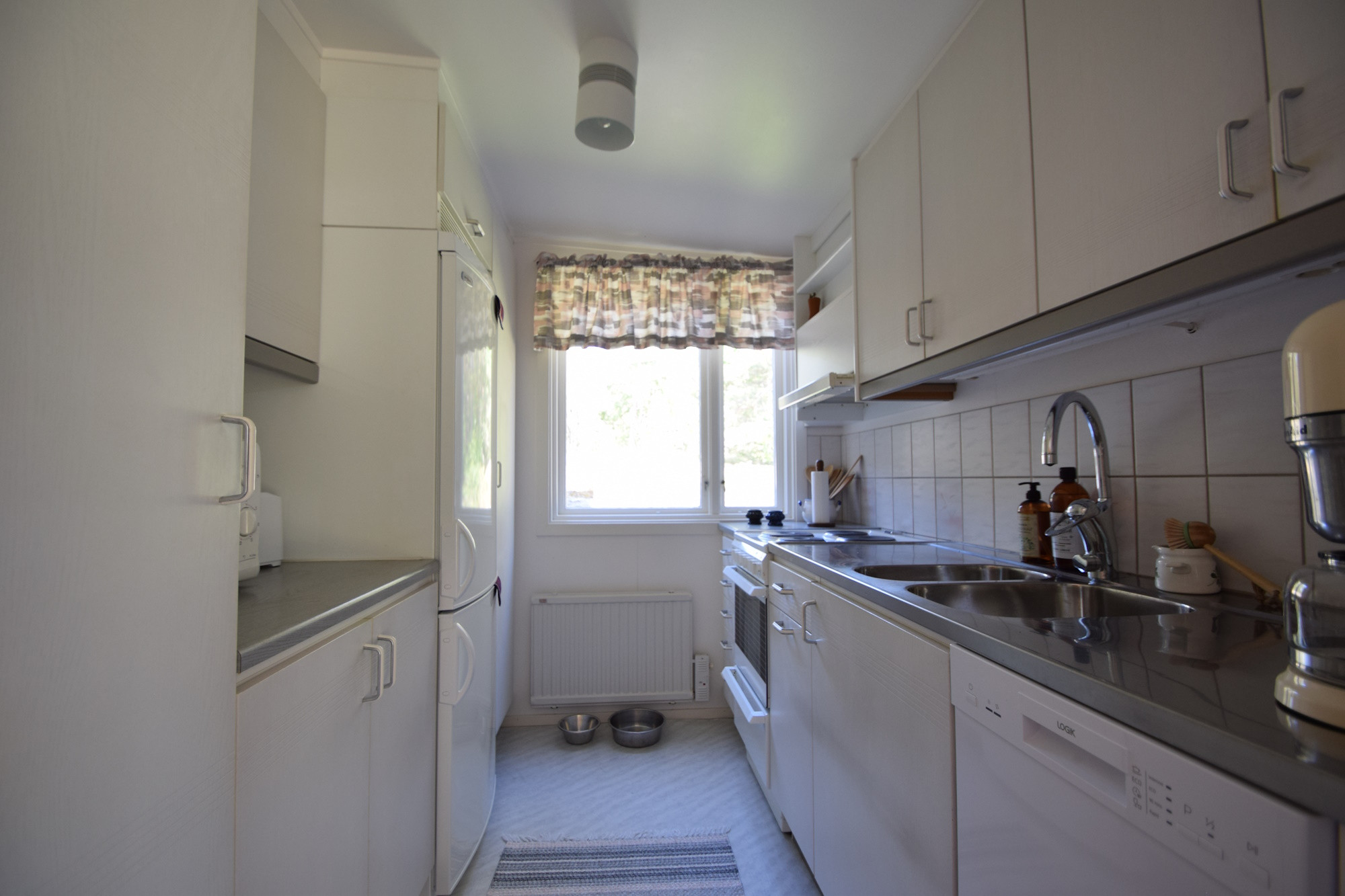 The bright kitchen is fully equipped with fridge, freezer, oven, microwave, fan and dishwasher. Adjacent to the kitchen is the dining area with large windows overlooking the garden. The bathroom is fresh with shower, toilet, sink and washing machine.