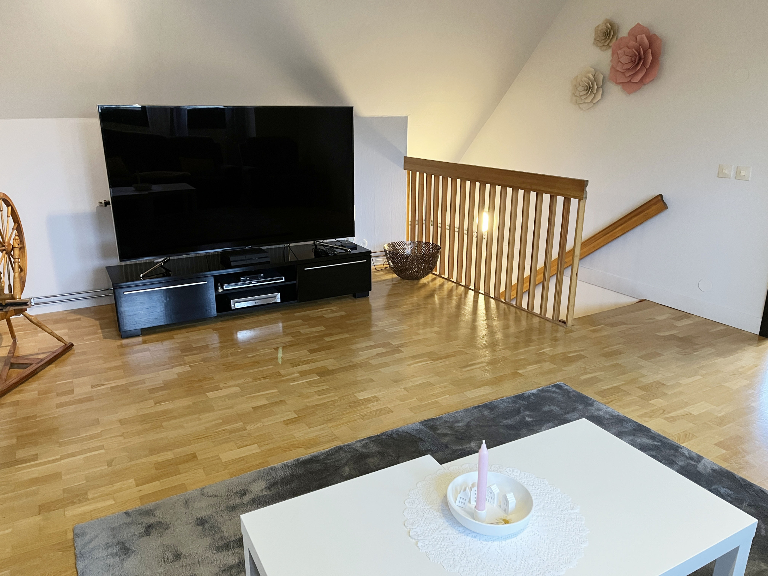 On the upper floor there is a large living room, furnished with a sofa, two armchairs and a large TV - an ideal gathering place for cozy evenings. There are also two bedrooms here; one with a double bed (140 cm) and a single bed, and the other with a sofa bed for two people. A fresh, fully tiled bathroom with shower is also on this floor.