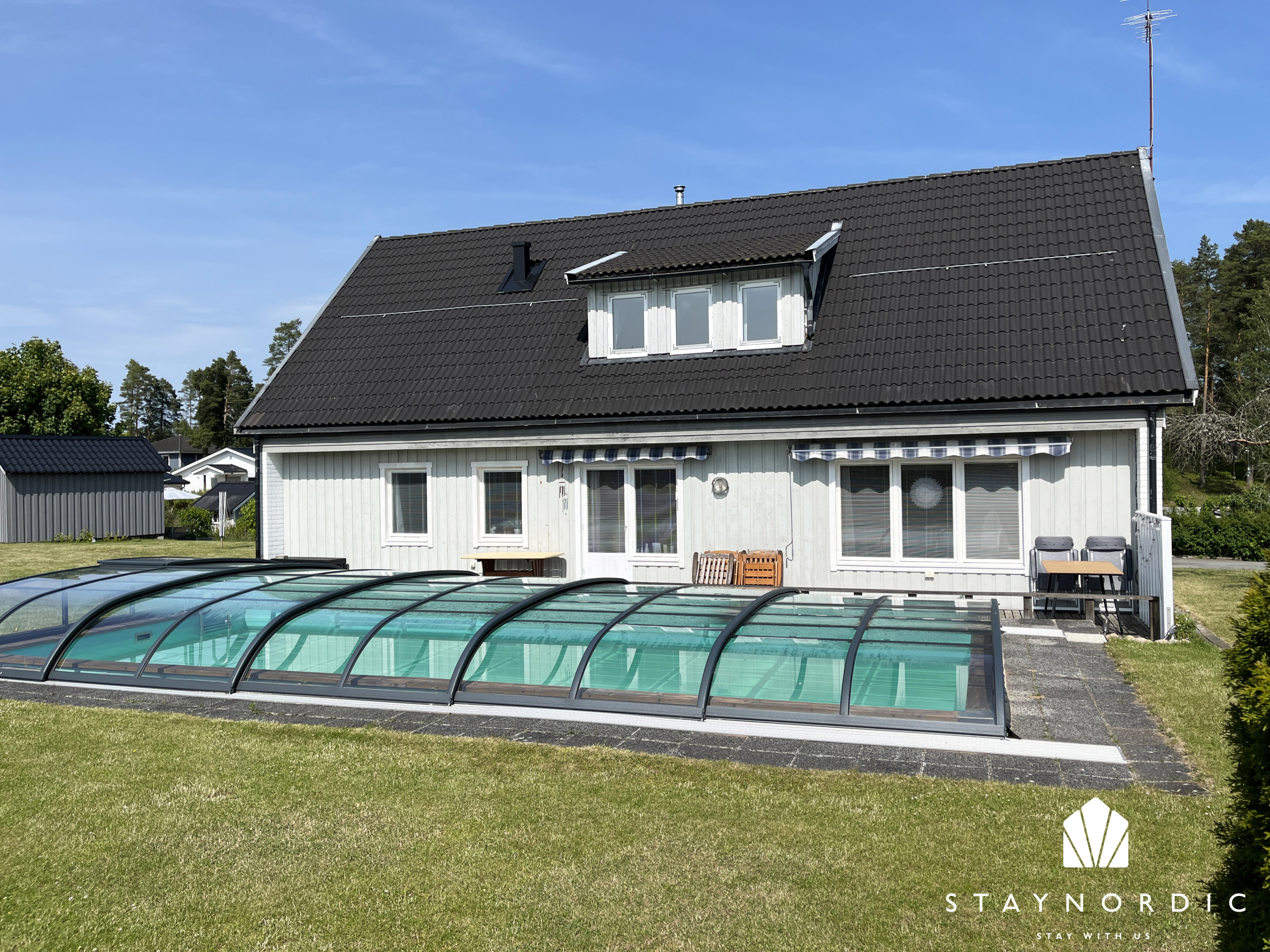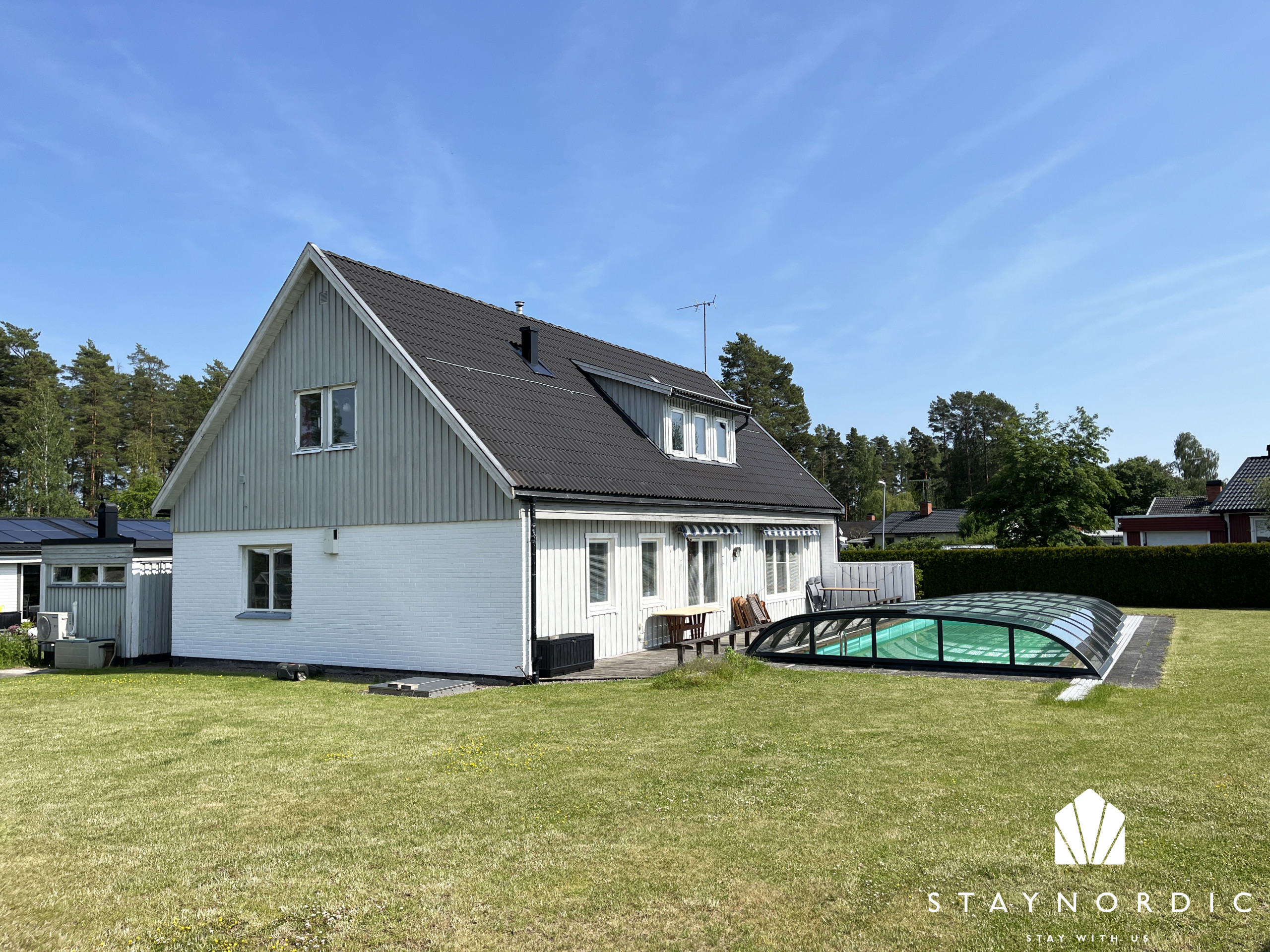 The large plot offers plenty of space for ball games and other outdoor activities. The pool, which is 10 meters long, provides a wonderful opportunity to cool off on hot days (not heated).