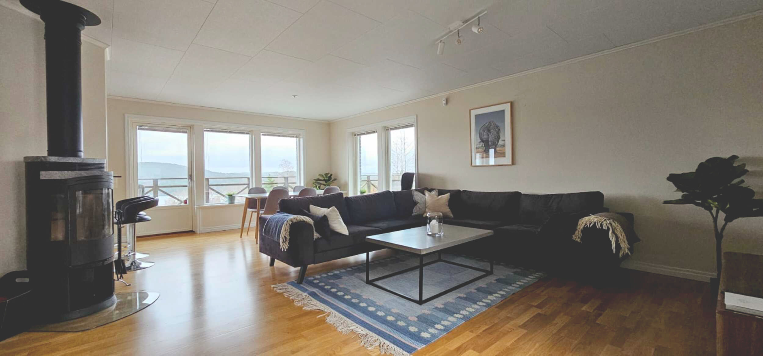 Welcome to this spacious house with a lovely view of the fjord, just 400 metres from the sea and a family-friendly bathing area. The house is situated high on a slope at the end of a quiet cul-de-sac – perfect for families and friends seeking relaxation, nature and proximity to local amenities. The house offers comfortable accommodation for up to 10 guests on 170 m² across two floors, with several social areas and flexible sleeping arrangements.