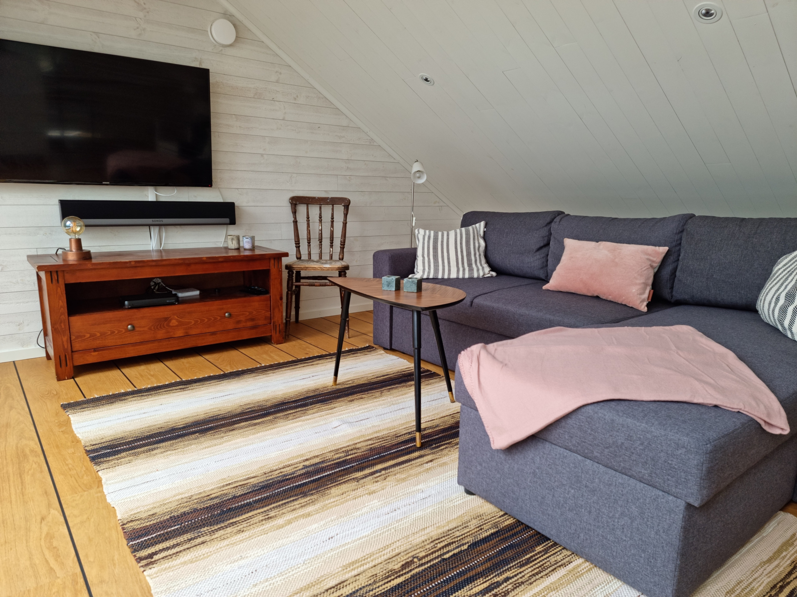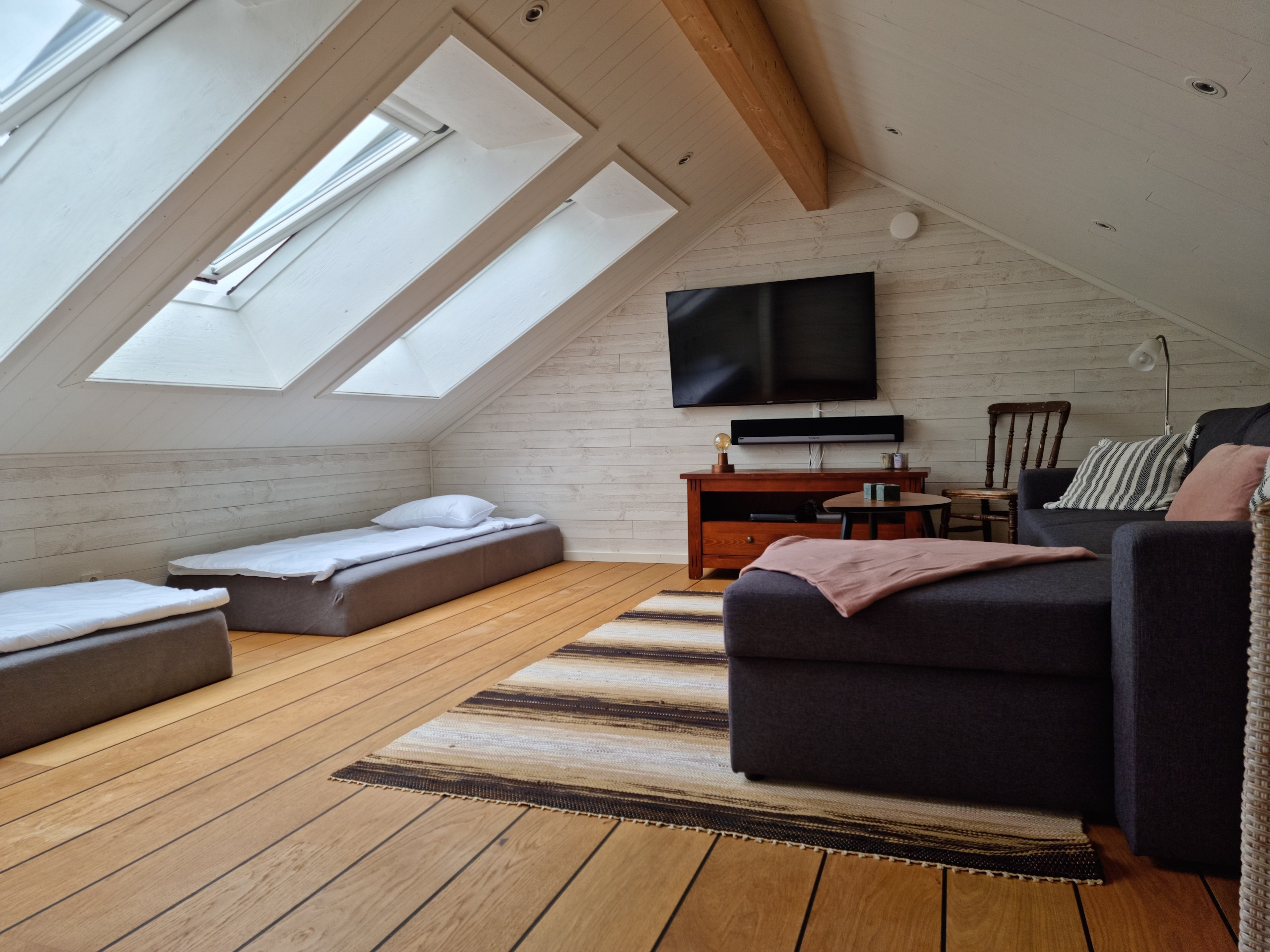 There is a fresh bathroom with shower and toilet. There is also a washing machine and dryer, which makes the accommodation practical even for longer stays. Electricity is included in the rent and the house is heated with electricity and a heat pump.