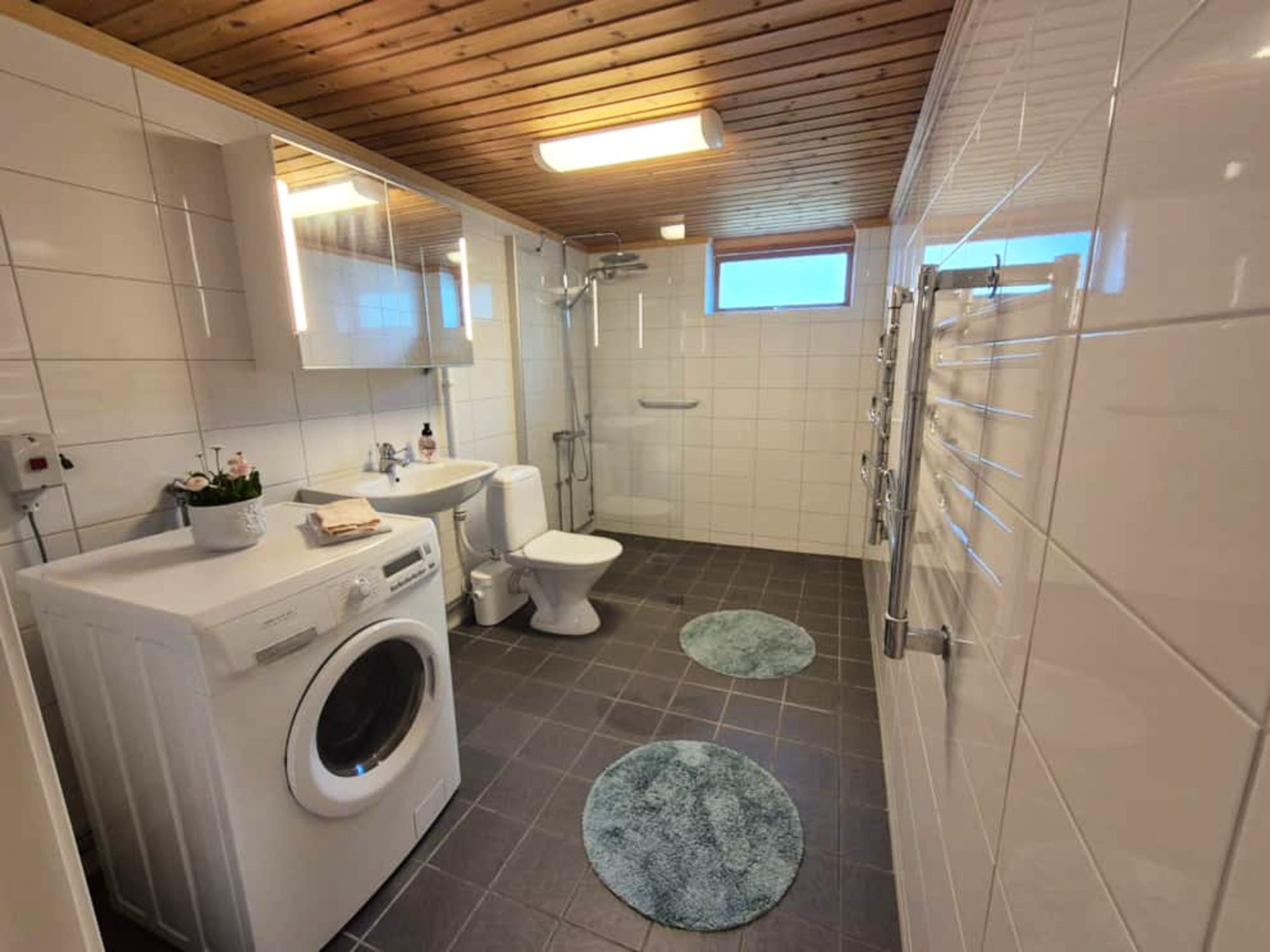 There is a fresh bathroom with shower and toilet. There is also a washing machine and dryer, which makes the accommodation practical even for longer stays. Electricity is included in the rent and the house is heated with electricity and a heat pump.