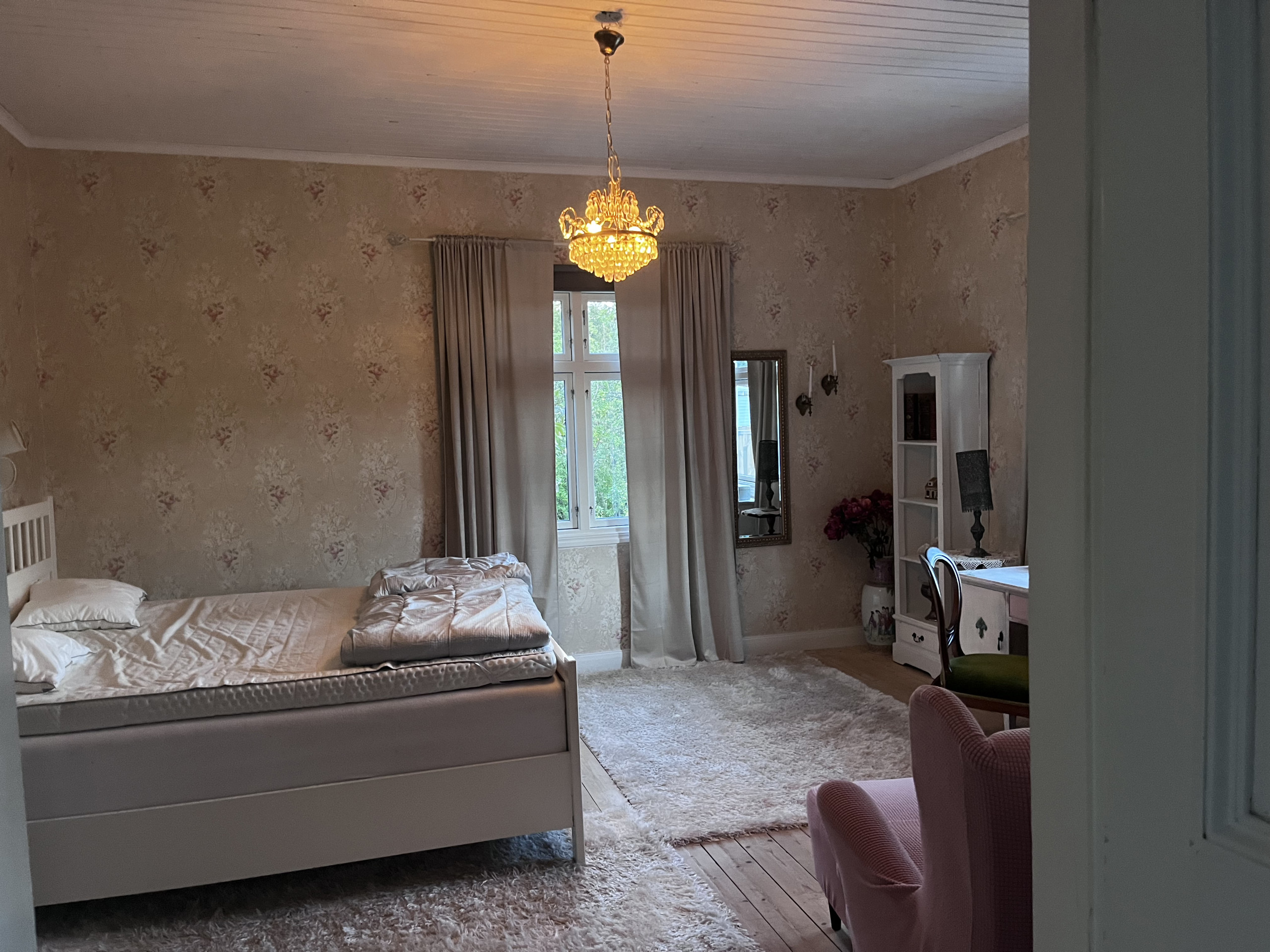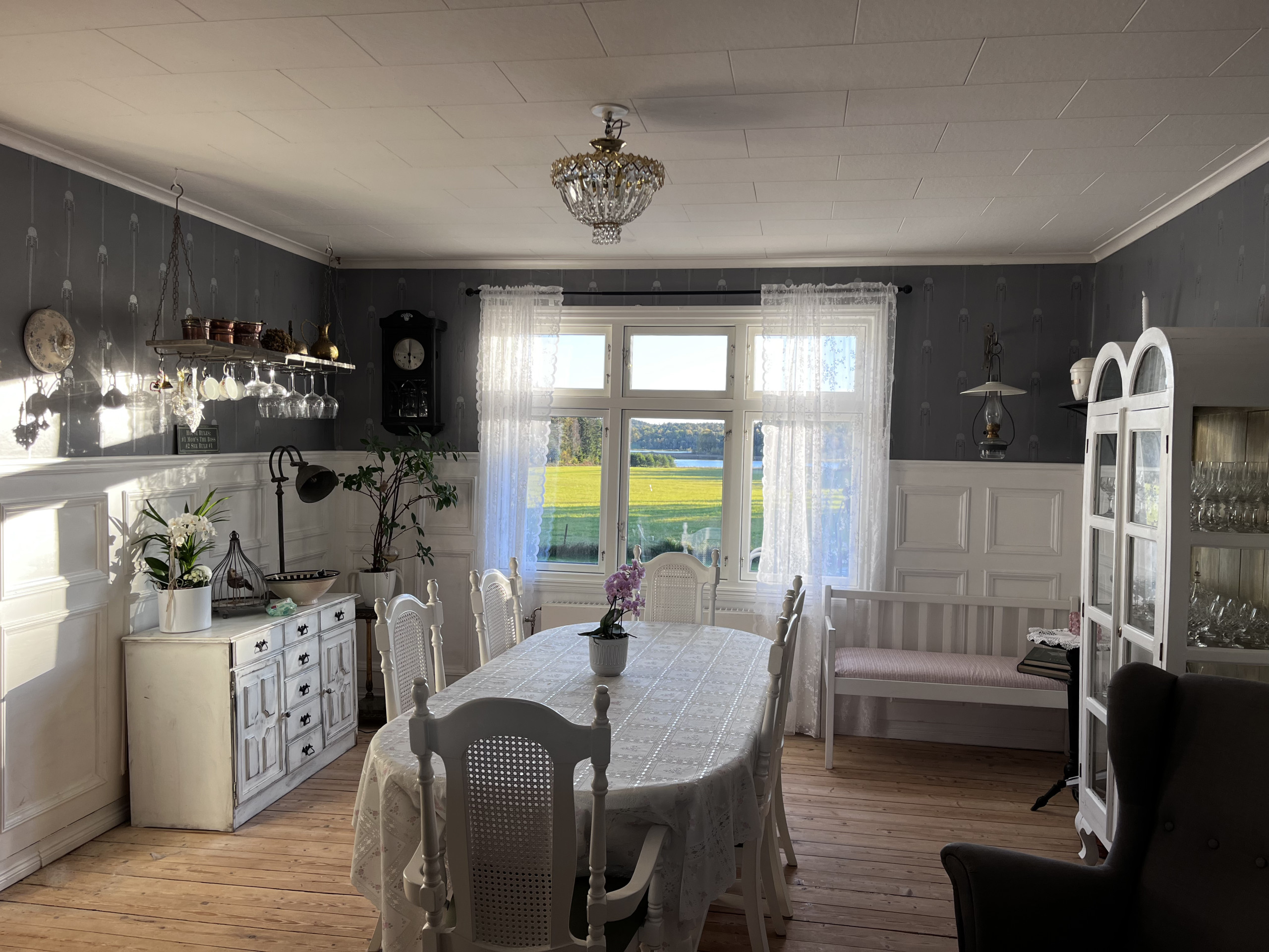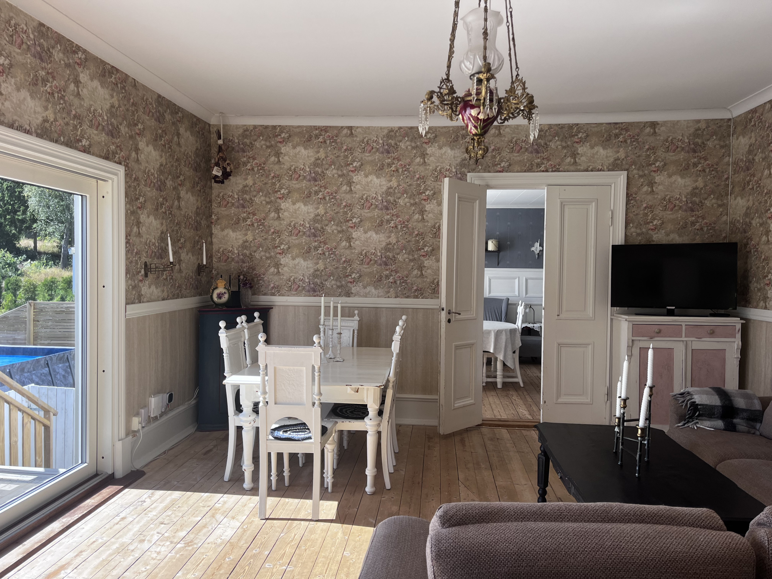 Welcome to Sjölunda, a charming and spacious house with 17 beds, perfect for large families or several groups traveling together. Built in 1901, this house radiates classic Swedish charm with tiled stoves, wooden floors and beautiful period details – a true “Madicken house” in the idyllic countryside of Orust. There is plenty of space for socializing, both indoors and outdoors. The house has two floors with seven bedrooms, three toilets, one bath and one shower. The kitchen is fully equipped, and the dining room seats 10–12 people. Several living rooms feature TVs with Chromecast, and Wi-Fi is available throughout the house. Outside, you’ll find a heated above-ground pool – perfect for sunny summer days – as well as swings, a slide, a playhouse, lounge furniture and both a charcoal and a gas grill. The fenced lawn makes it safe for children to play freely. From the terrace, you can enjoy panoramic views of meadows, forests and Lake Kollungeröd – a peaceful setting surrounded by nature.
