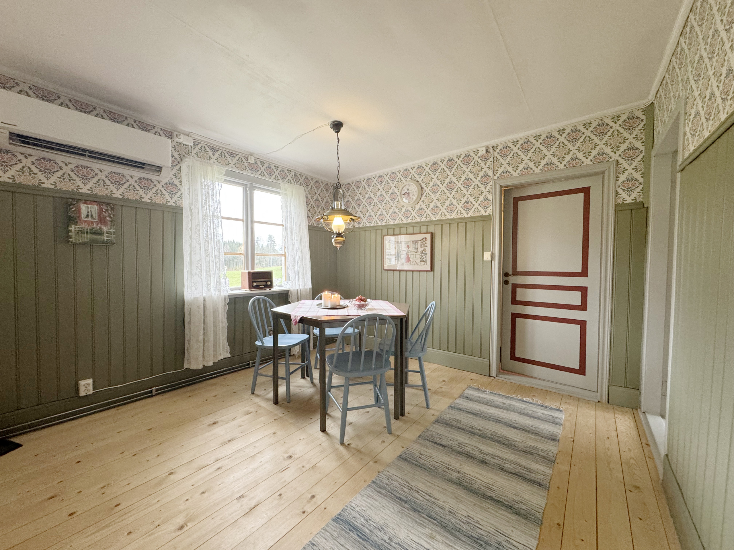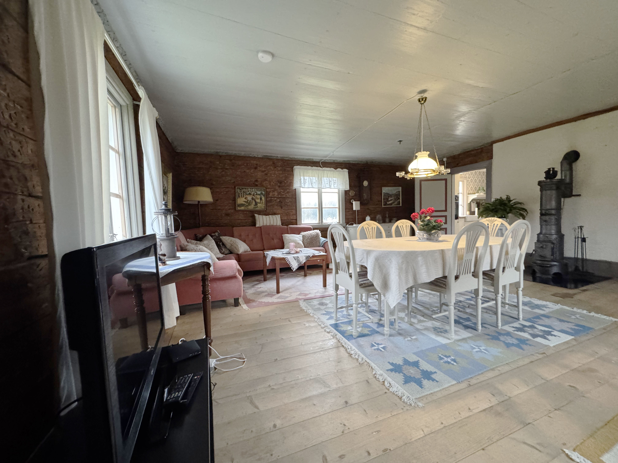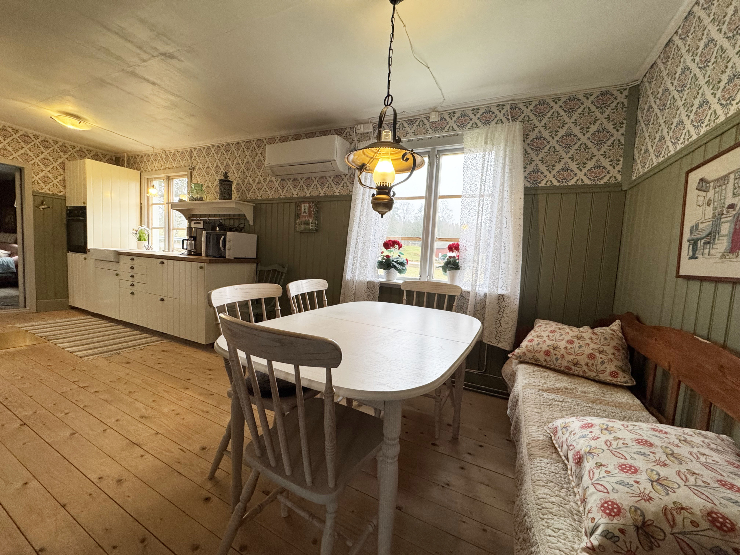 Beautiful house that has been carefully renovated to a modern standard. On the first floor you will find one of the bedrooms with two single beds for adults and a single bed for a child under 12 years. Here is also the bathroom with shower and washing machine. Functional kitchen with dining area and a giant old beautiful brick with an iron stove where you can light a fire. The living room or the hall as it used to be called has wooden floors and contemporary furniture and here you can have cozy dinners in front of the beautiful stove. If you go up the steep stairs to the second floor, you will find two more bedrooms. One with a double bed and one with two single beds. The highlight of the house is probably the billiards room with bar. Why not challenge each other in a party one evening while enjoying the warmth of a nice fire. Here, the ceilings are high, and the room have a lovely feeling.