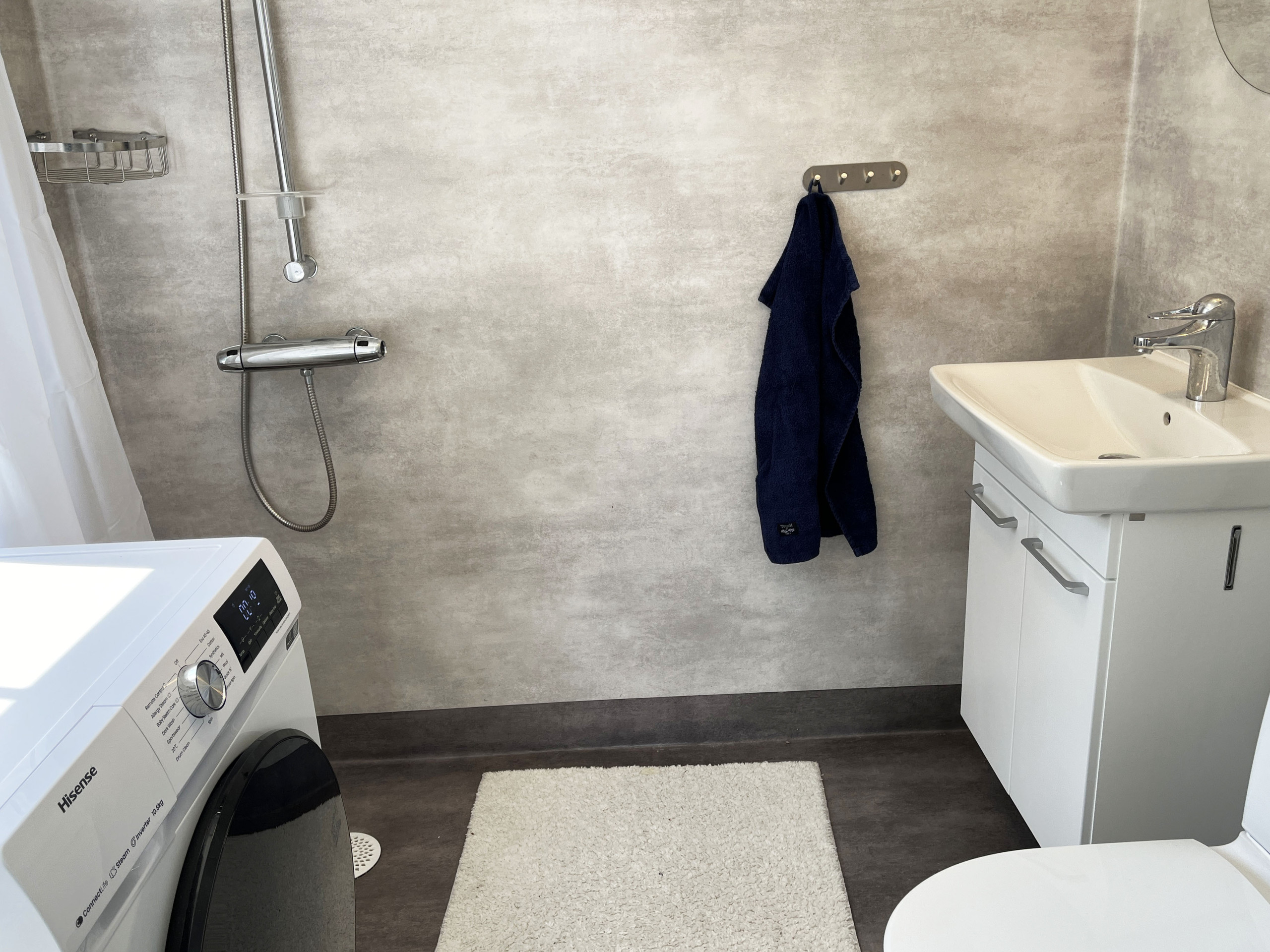 The bathroom is newly renovated and includes a shower and washing machine. The bedroom has a comfortable double bed, and the loft provides two additional beds – ideal for family or friends.