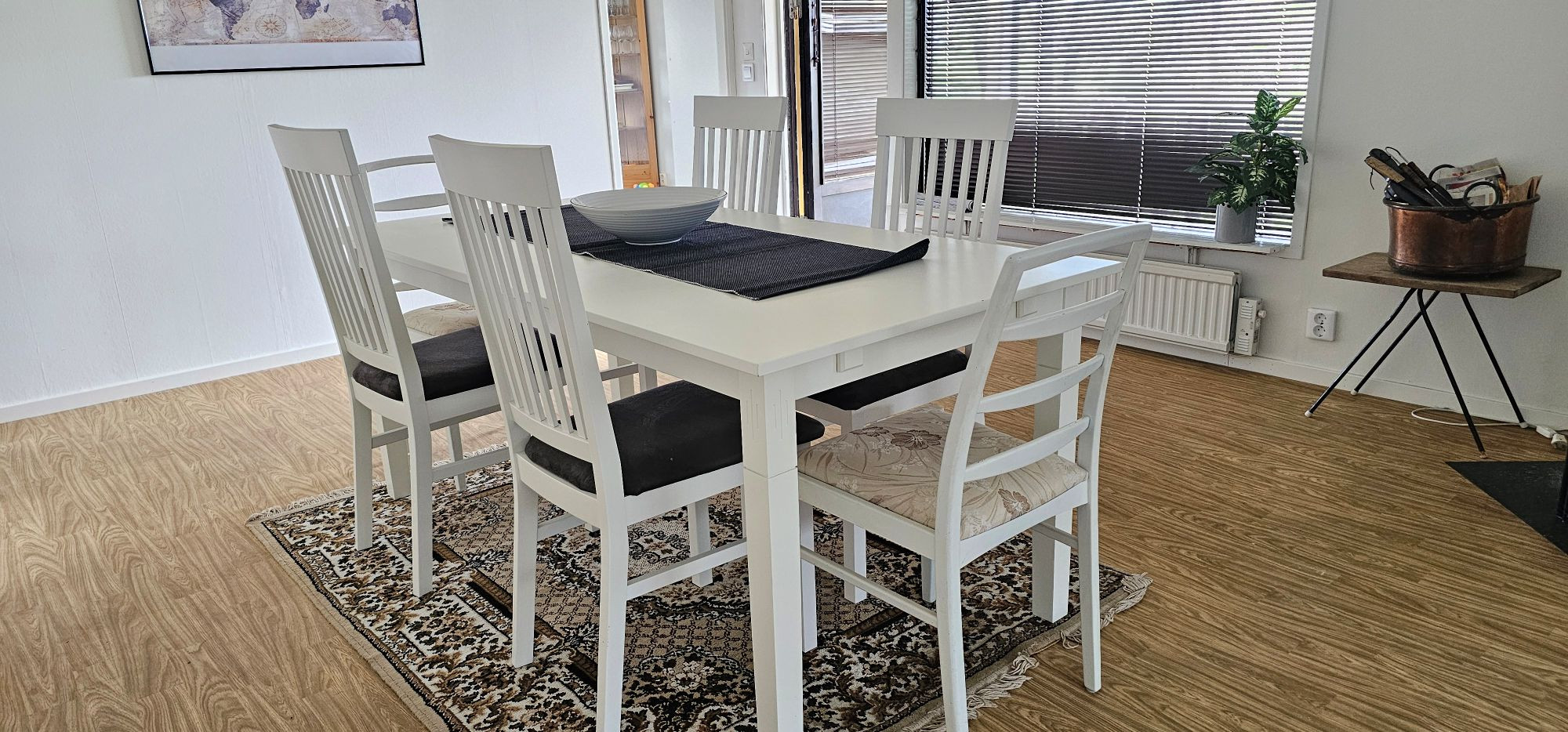 The house is 108 sqm and accommodates up to 6 guests + one baby. It features three bedrooms: one with a double bed (160 cm) and a baby cot, one with a bunk bed (2×90 cm), and a guest cottage with two single beds (90 cm). The living areas are open and bright with two dining areas, a cozy lounge with fireplace, TV with Chromecast, and a selection of games and books. The fully equipped kitchen includes a dishwasher, stove, oven, microwave, and coffee maker. The bathroom has both a shower and bathtub, and there is a separate laundry room with washing machine.