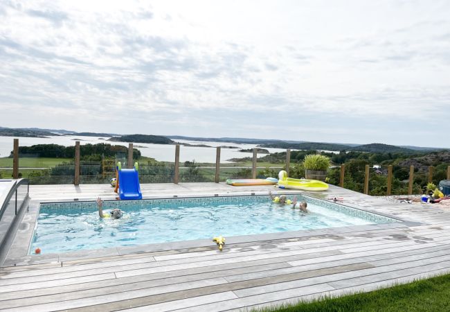 Welcome to a villa offering one of the most beautiful views on Orust. Here you stay in a modern and spacious home with three floors, a heated pool, several terraces, a gym and a playground. It is the perfect choice for two to three families looking for something extra during their holiday. The house offers 7 regular beds, spread across three bedrooms, a large family room and several social areas.