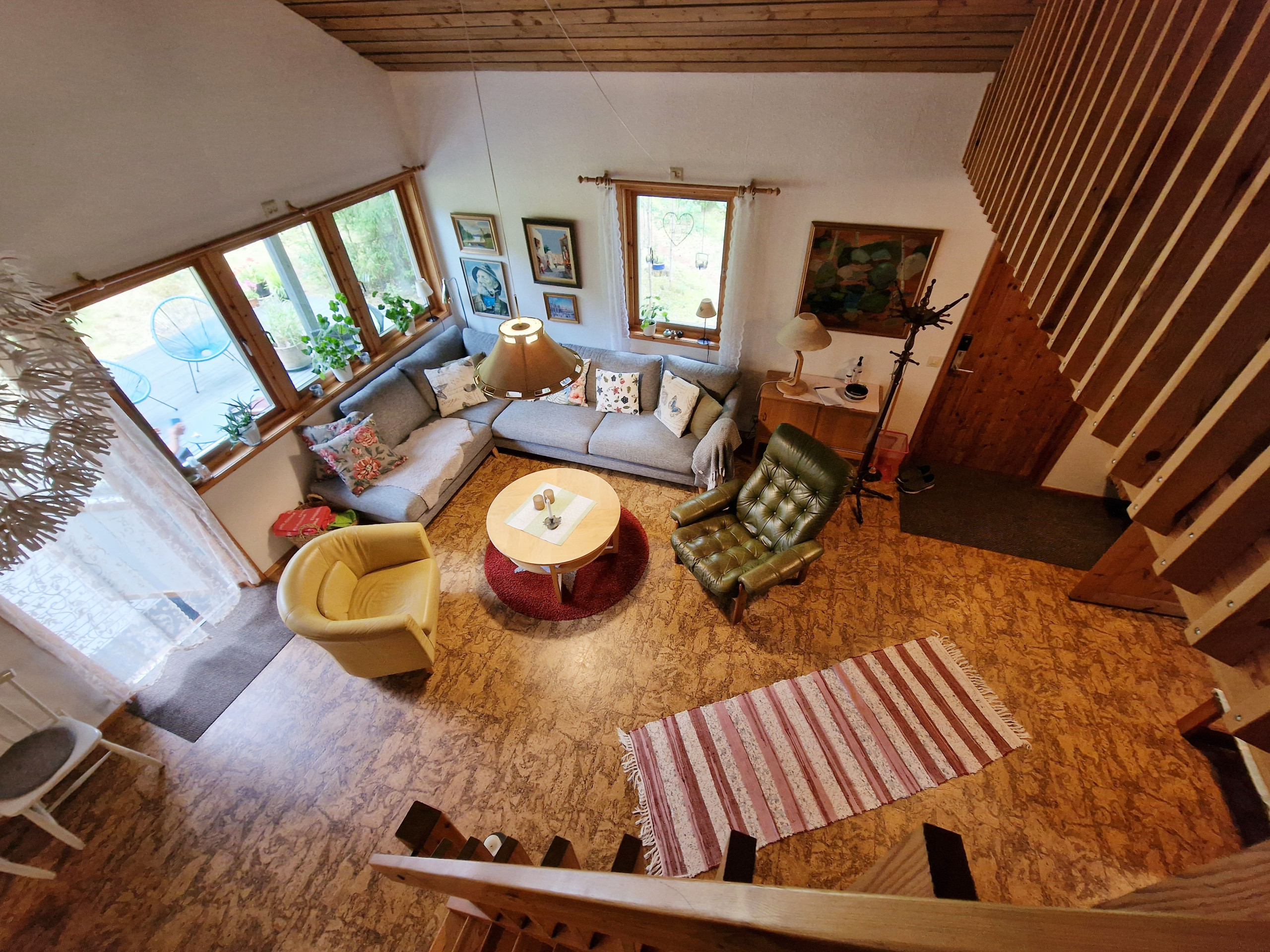 There are 3 bedrooms. One with a double bed, one with a bunk bed and one with a single bed. There is a steep staircase up to the loft and there you will find a sofa bed. Cozy kitchen with dining area in open floorplan with the living room. Patio with both sofa group and dining area.