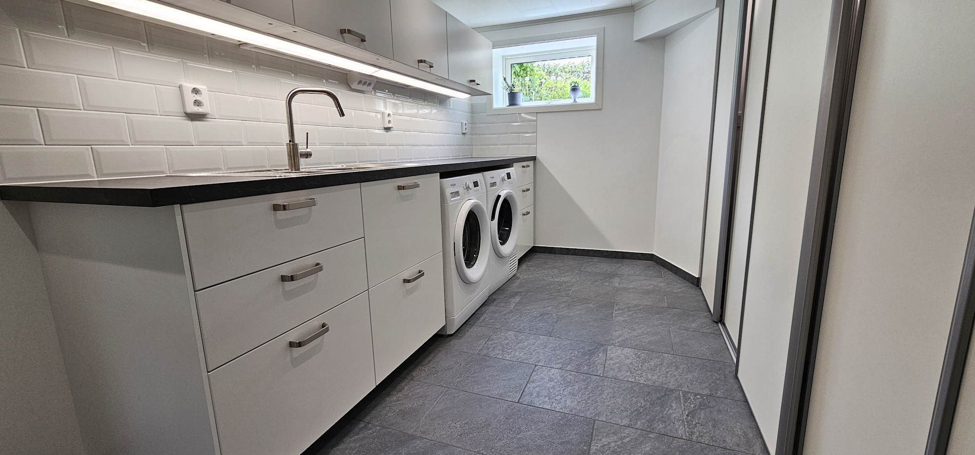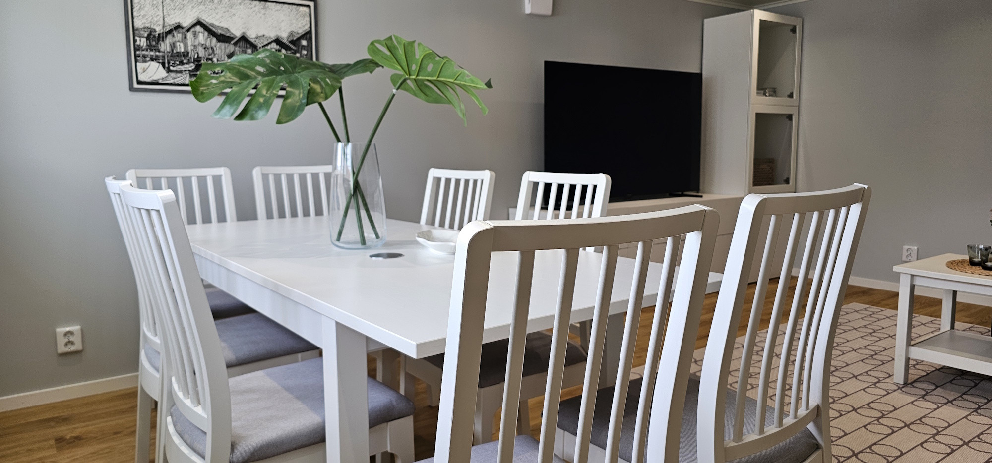 Det moderna och fullt utrustade köket med induktionshäll, diskmaskin, ugn, mikro och stor kyl/frys gör matlagningen till ett nöje. Det finns även smart-TV och fiber för snabb uppkoppling. Huset värms upp med miljövänlig bergvärme och det finns gott om plats för upp till tre bilar på uppfarten.