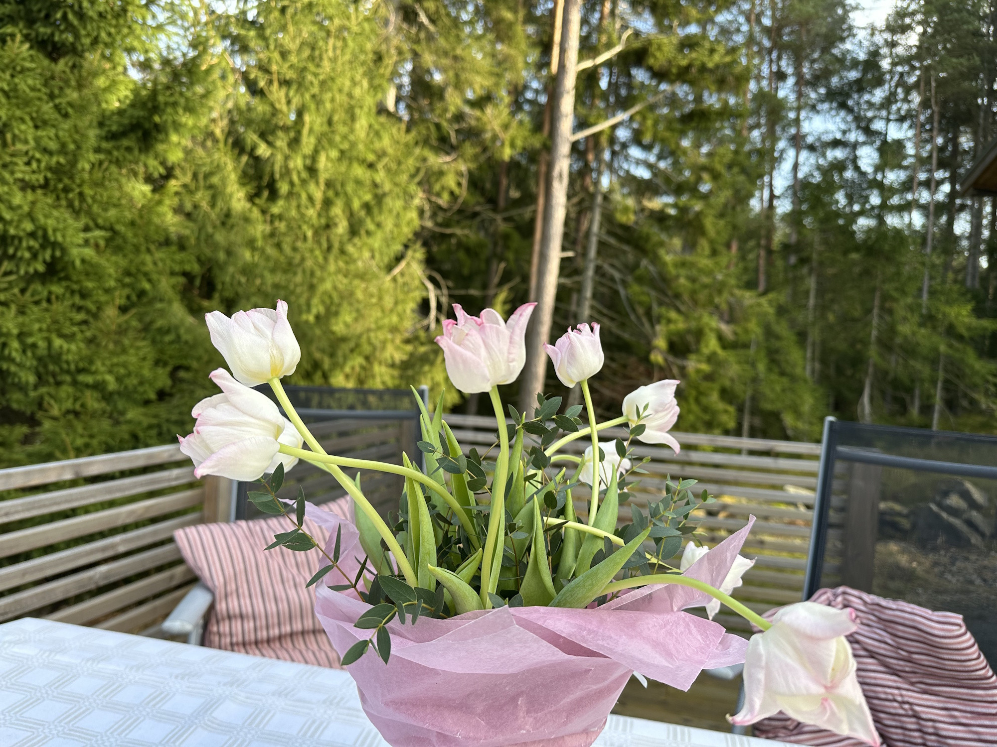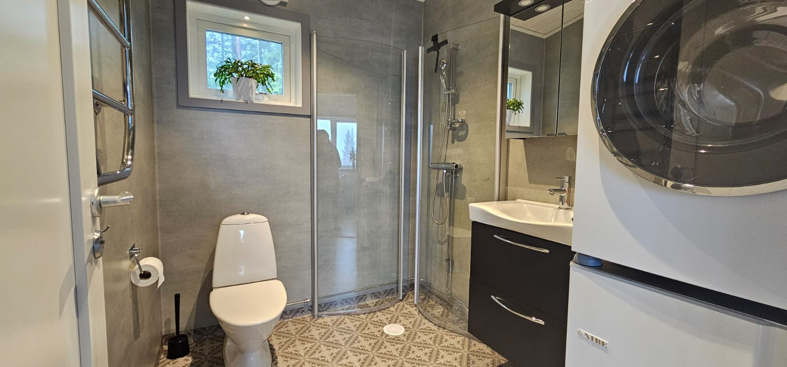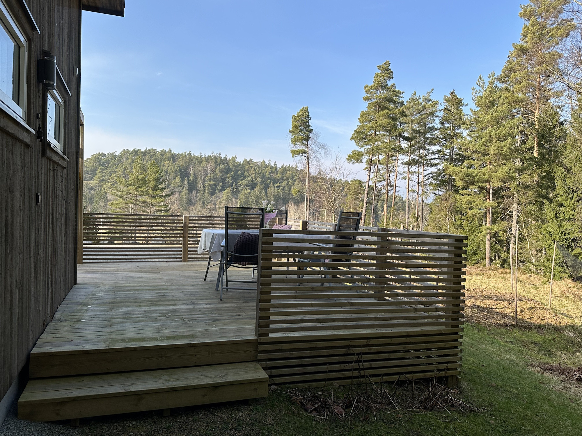 Utanför väntar en egen uteplats med utemöbler och grill – perfekt för lata sommardagar och lugna kvällar med utsikt mot naturen. Parkering finns i direkt anslutning till huset.