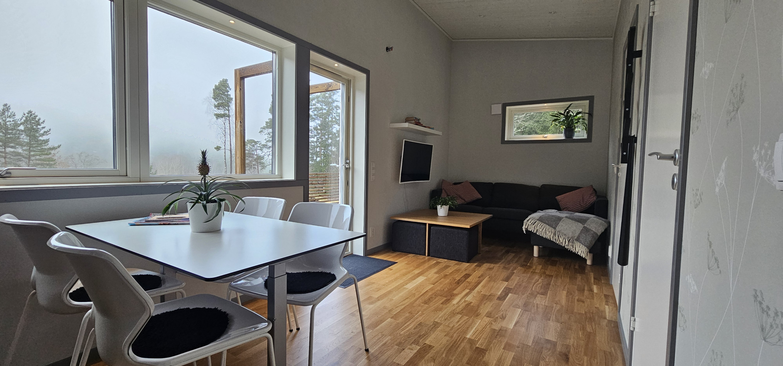 Stugan är 33 m² och passar perfekt för upp till fyra gäster. Här finns två sovrum – ett med dubbelsäng och ett med våningssäng – samt ett fräscht badrum med dusch och en tvättmaskin som installeras under sommaren 2025. Köket är fullt utrustat och ansluter till matplats och vardagsrum, där soffa och TV med Chromecast gör kvällarna bekväma. Wi-Fi och god mobiltäckning ingår. Härifrån har du naturen precis utanför dörren och bara 1,5 km till havet.