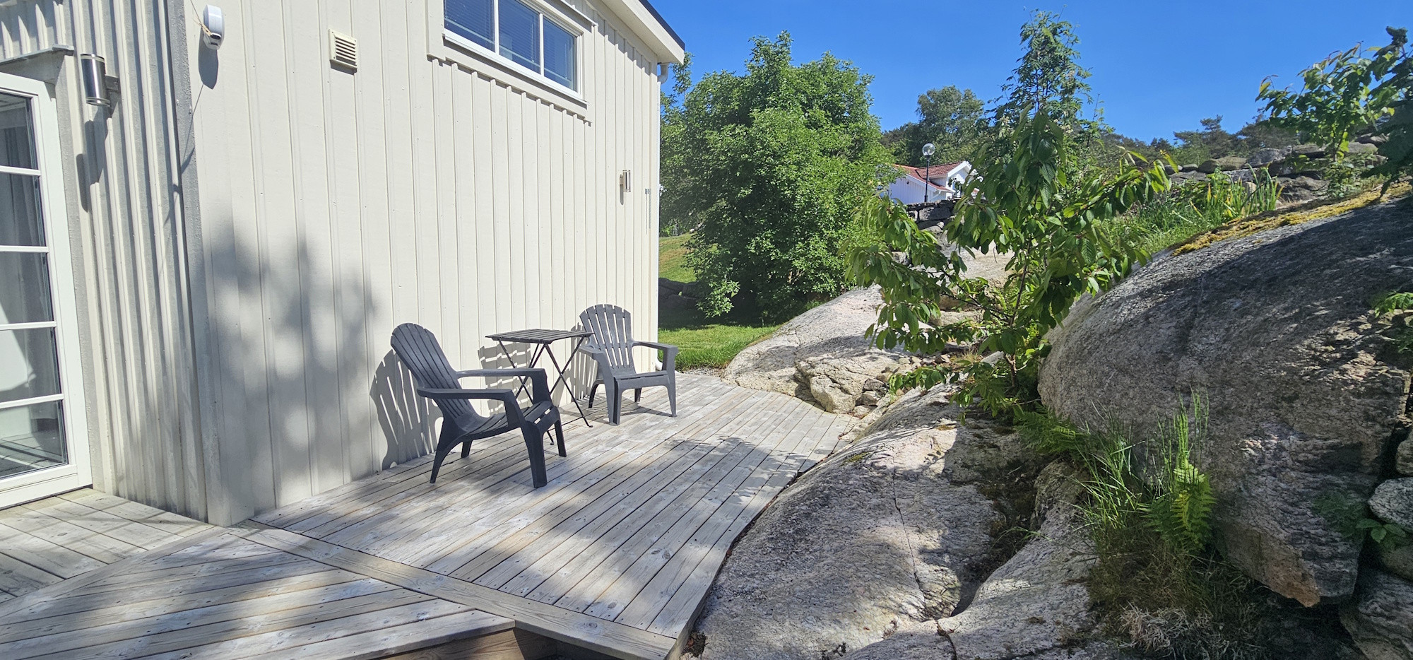 Badrummet är fräscht och har dusch, WC samt tvättmaskin. Luftkonditionering finns i hela huset och utanför väntar en generös terrass på 30 kvm med utemöbler, grill och solstolar – perfekt för lata sommardagar. Huset har också fiberuppkoppling, smart-TV med Chromecast och parkering för två bilar på tomten.