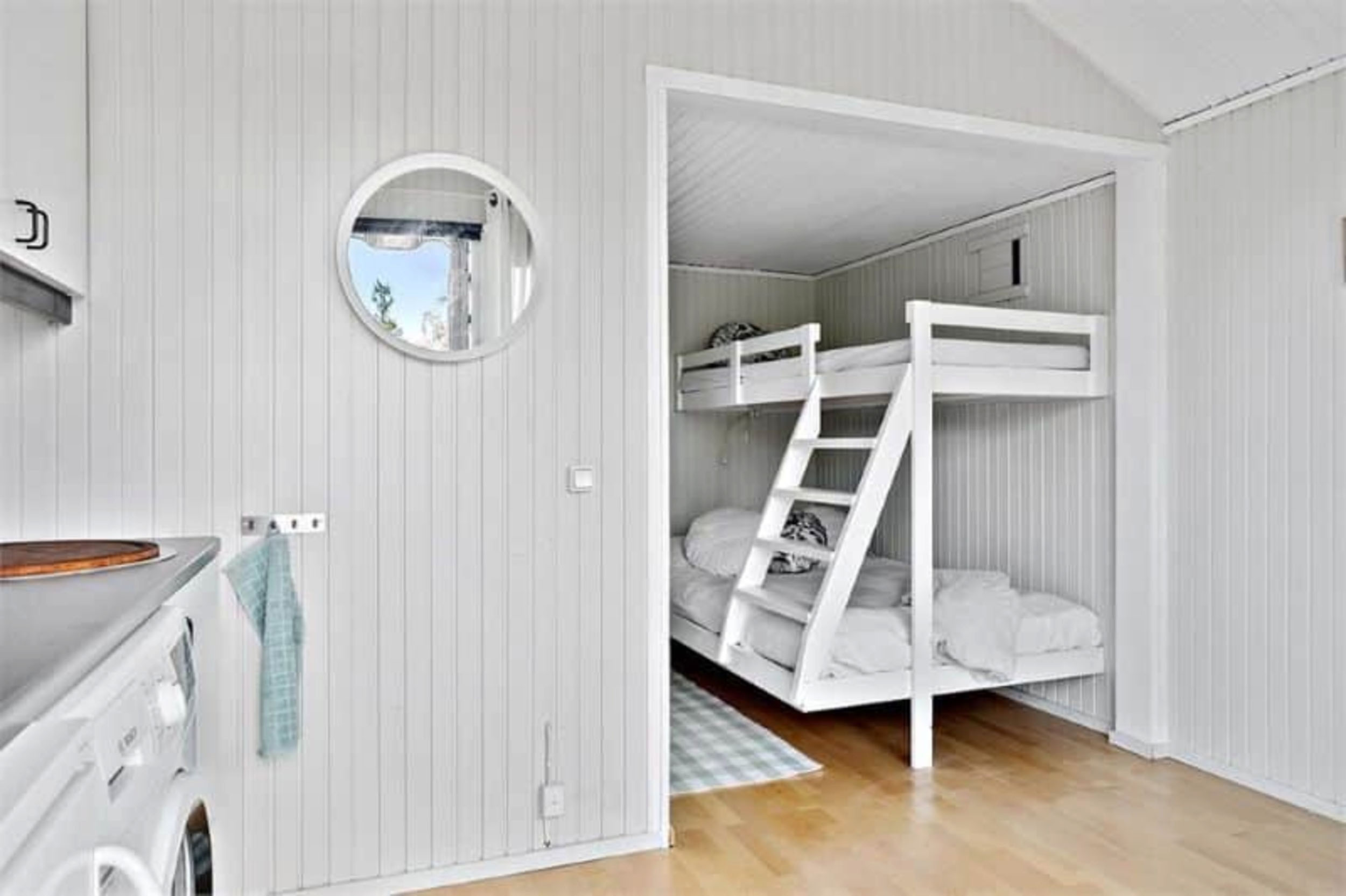 Stugan har två sovrum, två mysiga sovloft och ett stort allrum med fint kök, braskamin och inglasad matplats. I gäststugan finns ytterligare sovplatser, eget badrum och tvättmaskin, vilket gör boendet idealiskt för två familjer eller större grupper. Totalt rymmer huset sju personer.