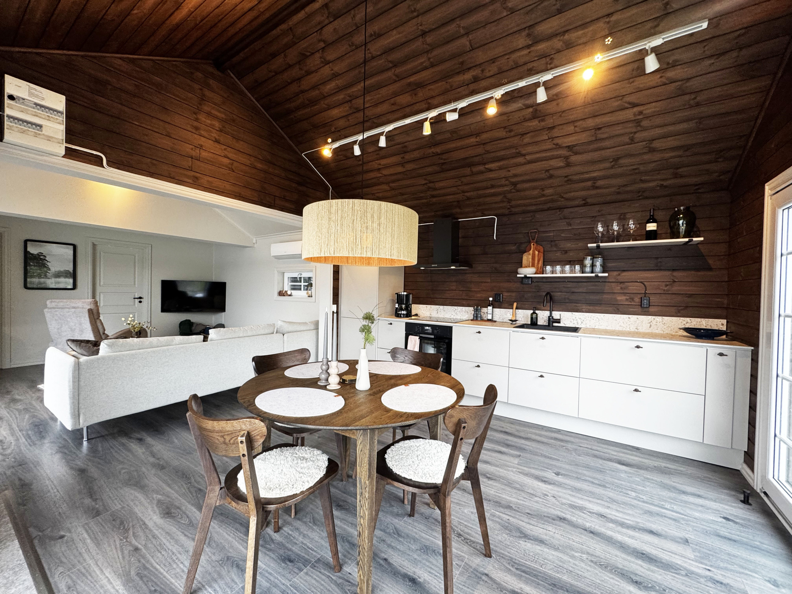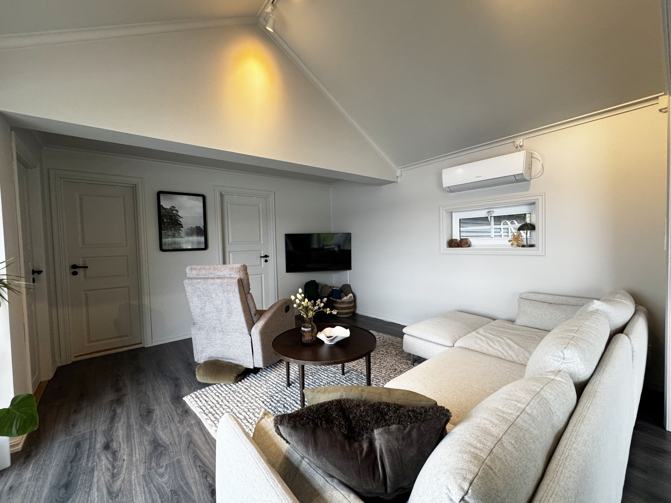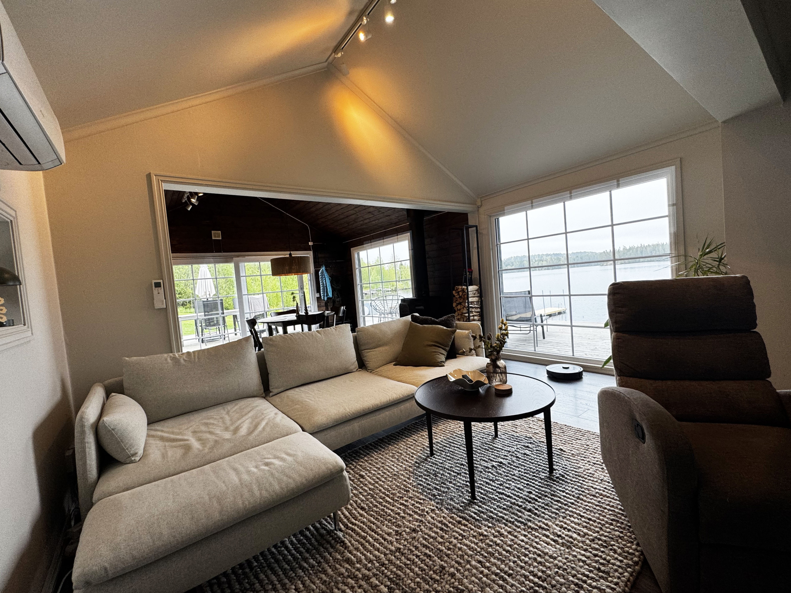 Med plats för fem personer uppdelat på två sovrum samt en extra plats i en bäddsoffa i vardagsrummet. Öppen planlösning mellan kök och vardagsrum som fylls av ljus från de stora fönster som blickar ut över sjön. Ni har även tillgång till internet via fiber. Badrummet är utrustat med dusch samt en förbränningstoalett.