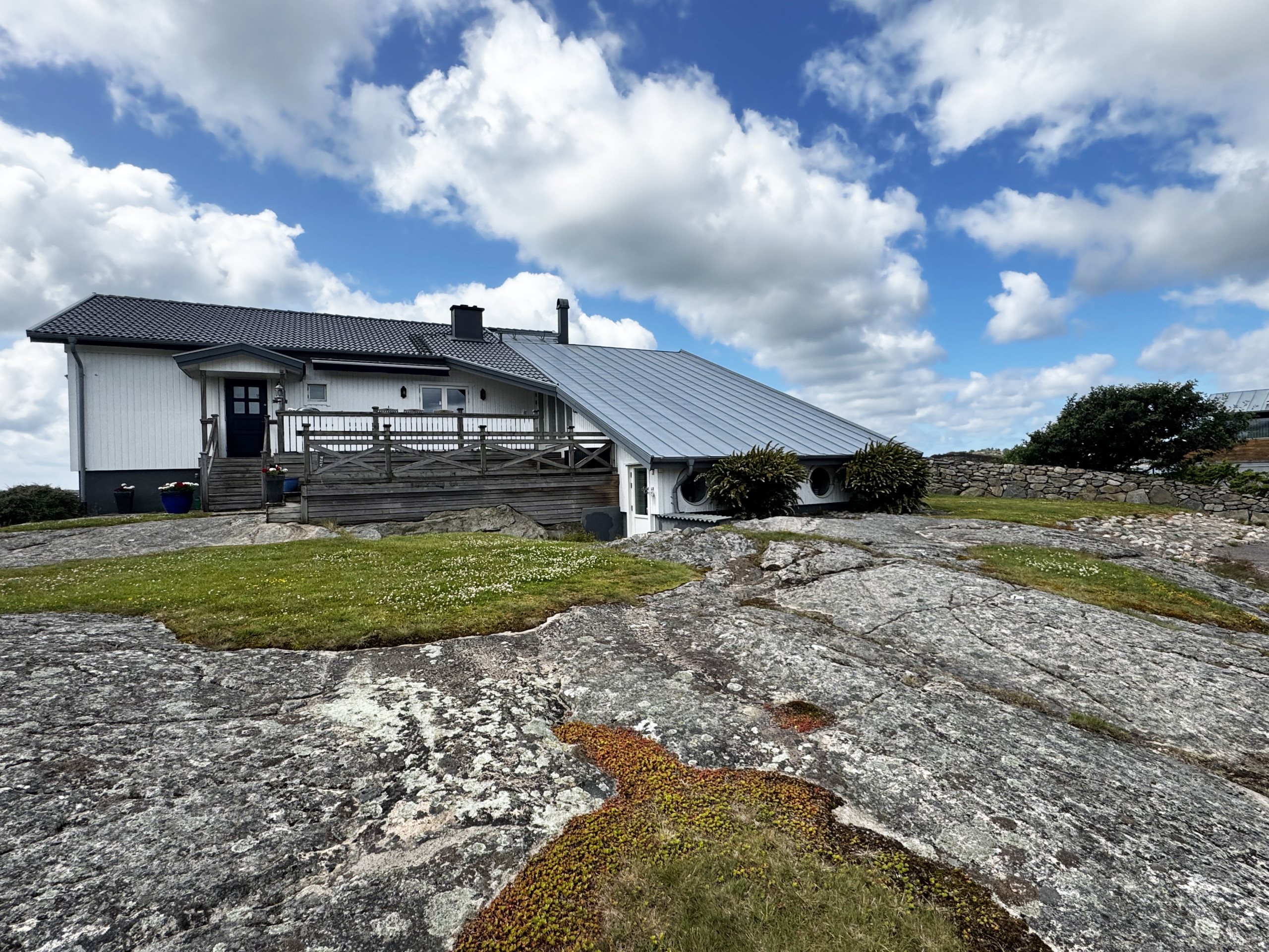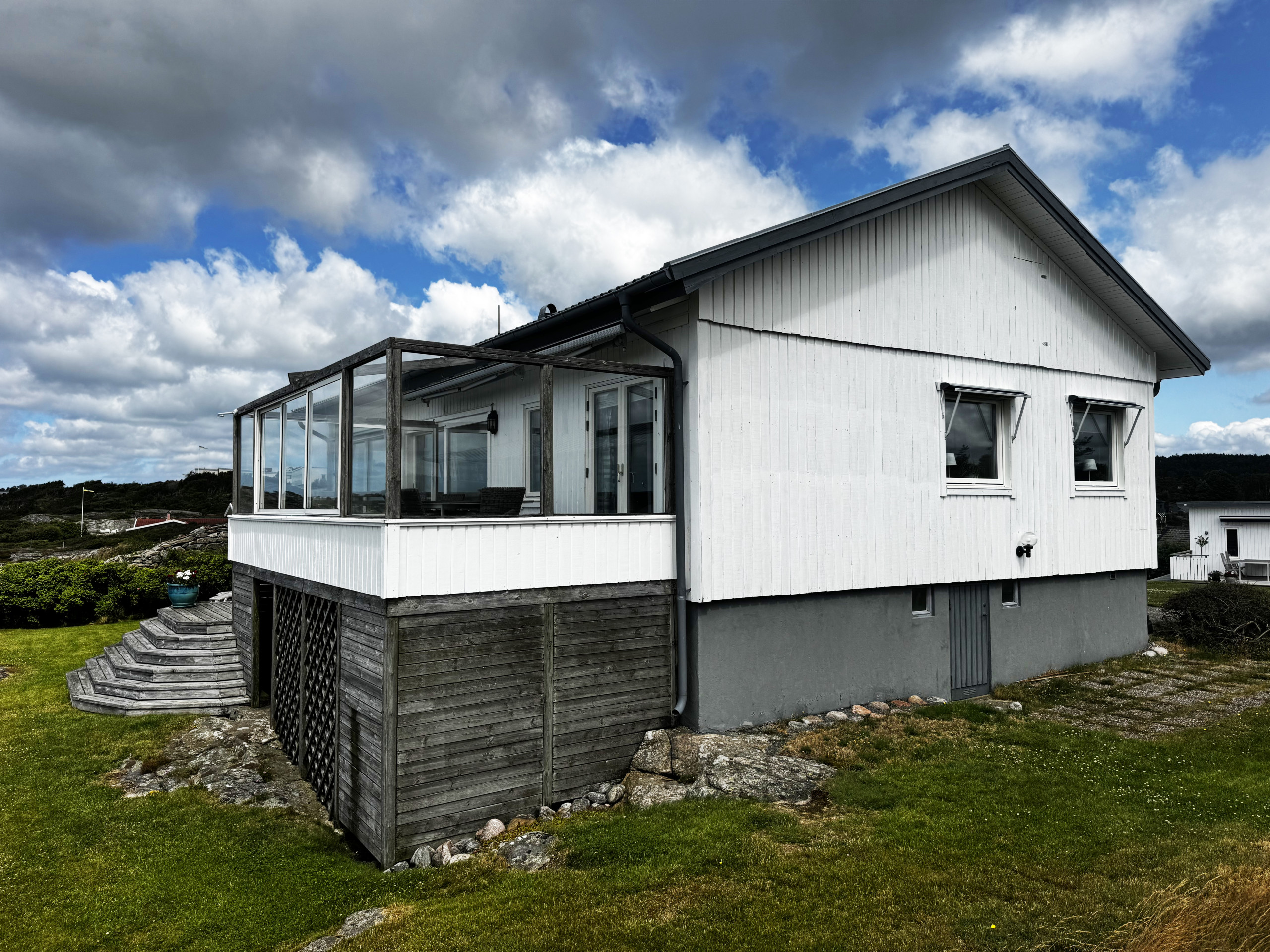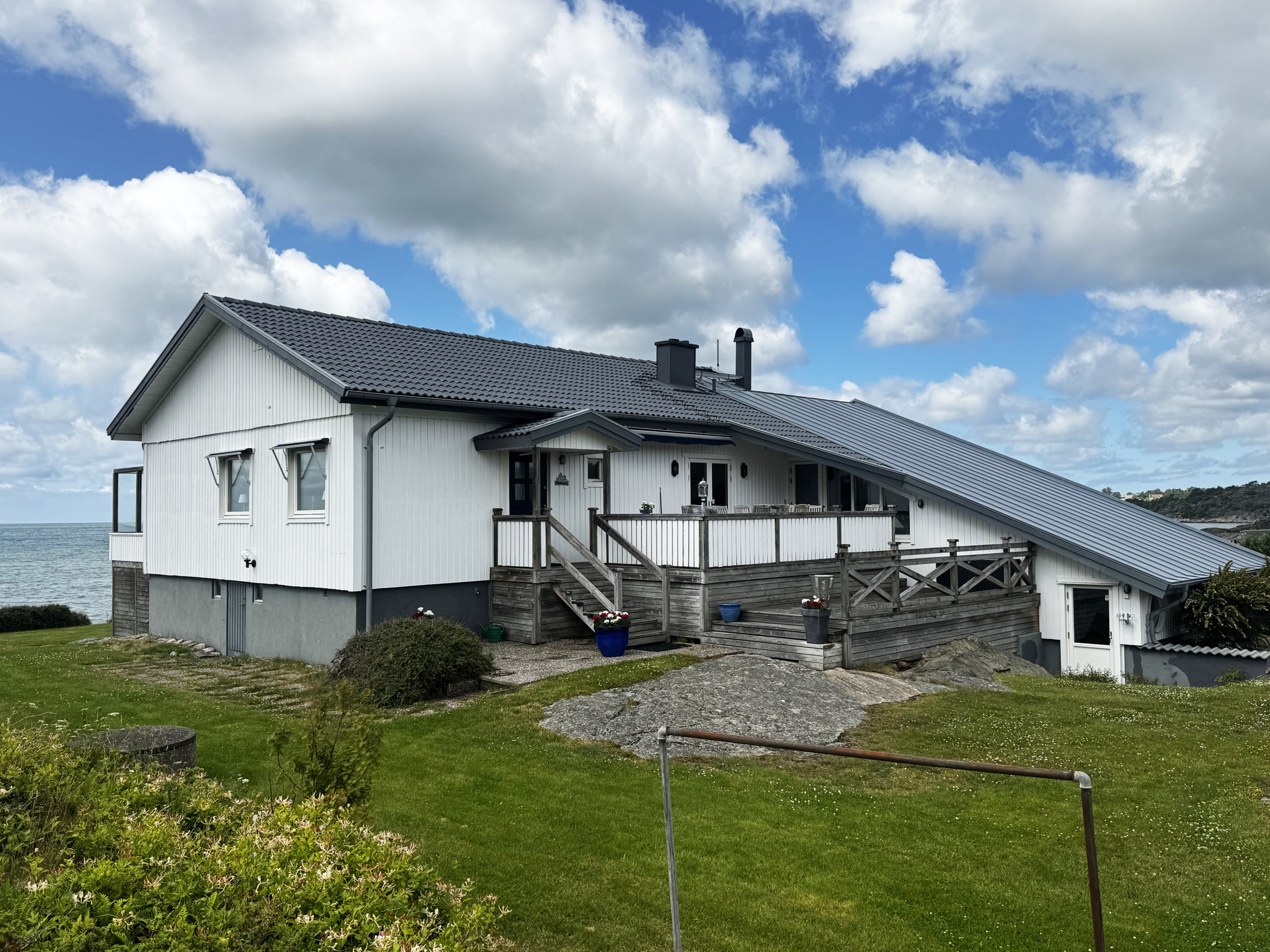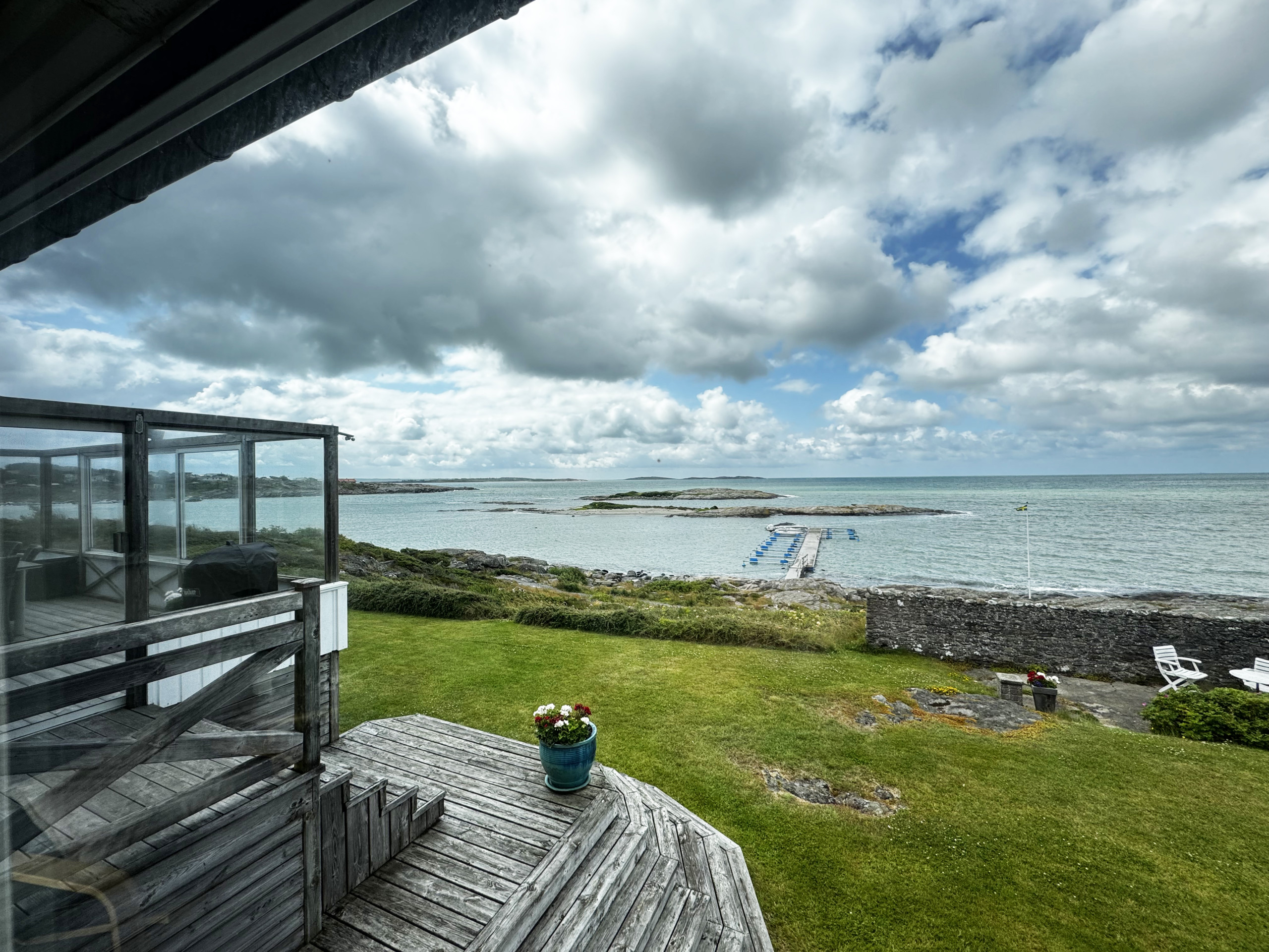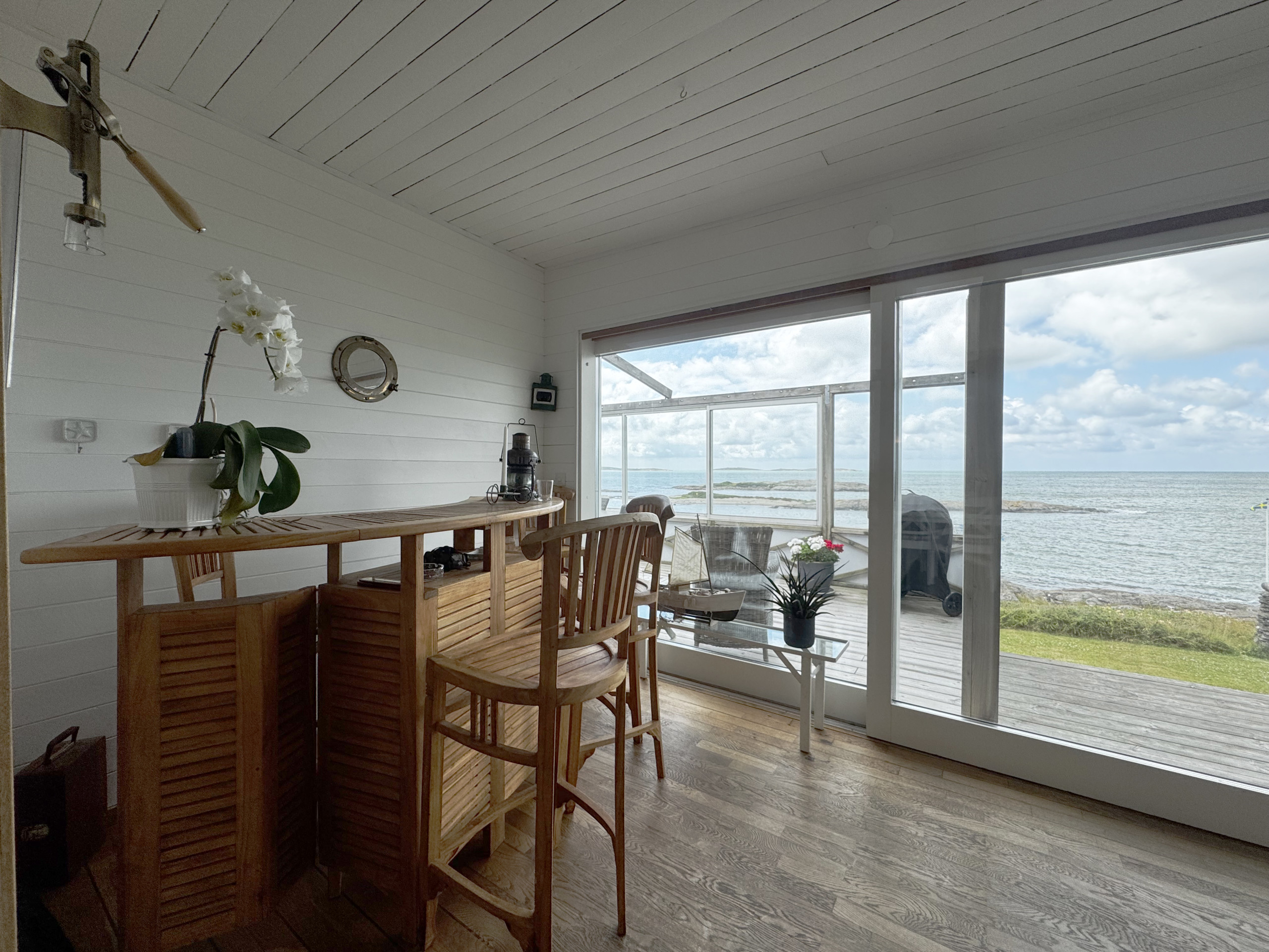 Ute finner du både inglasad och öppen terrass med grill, där du kan njuta av långa sommarkvällar med utsikt över havet.