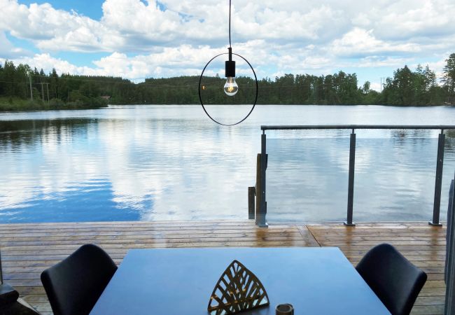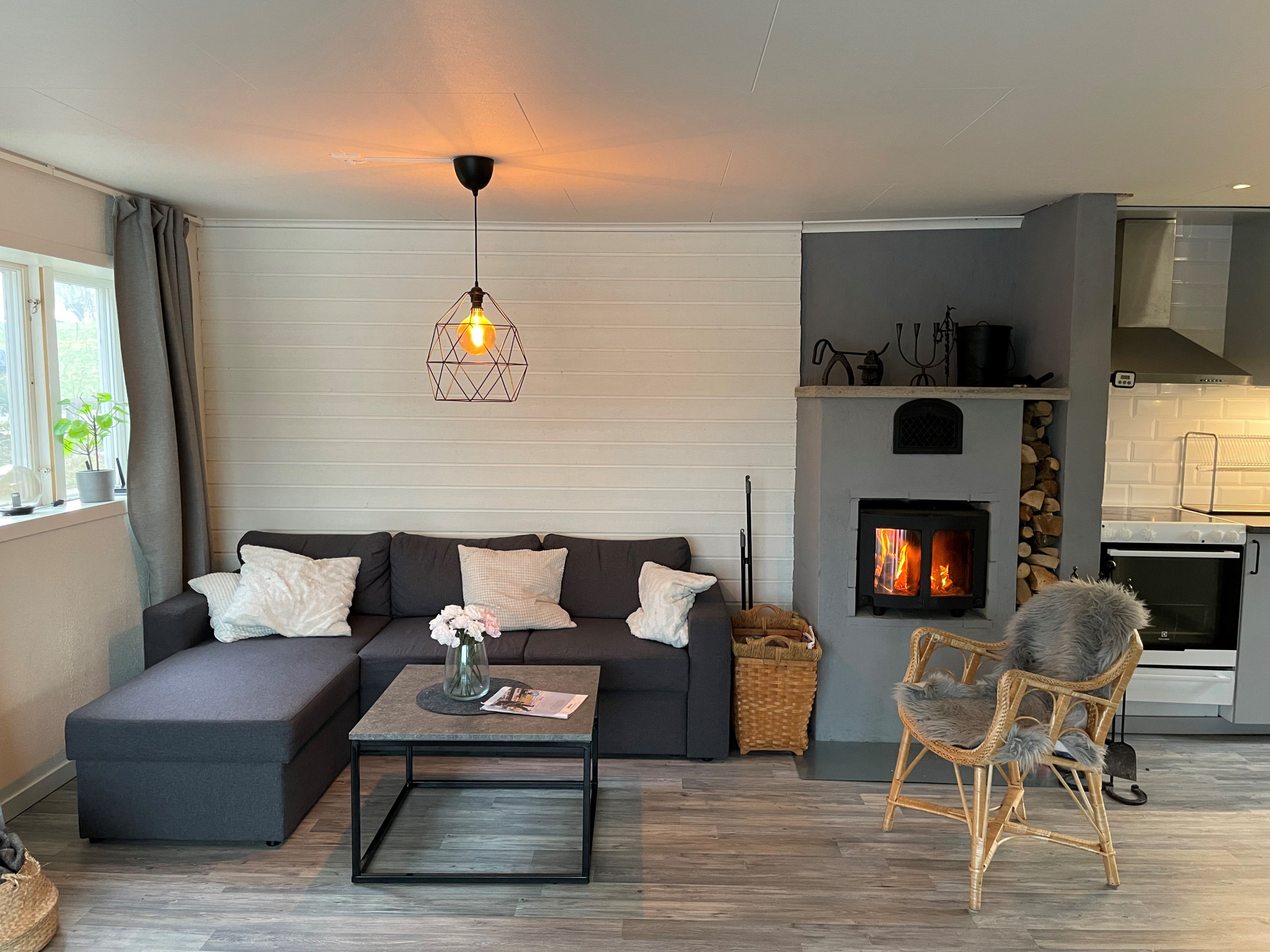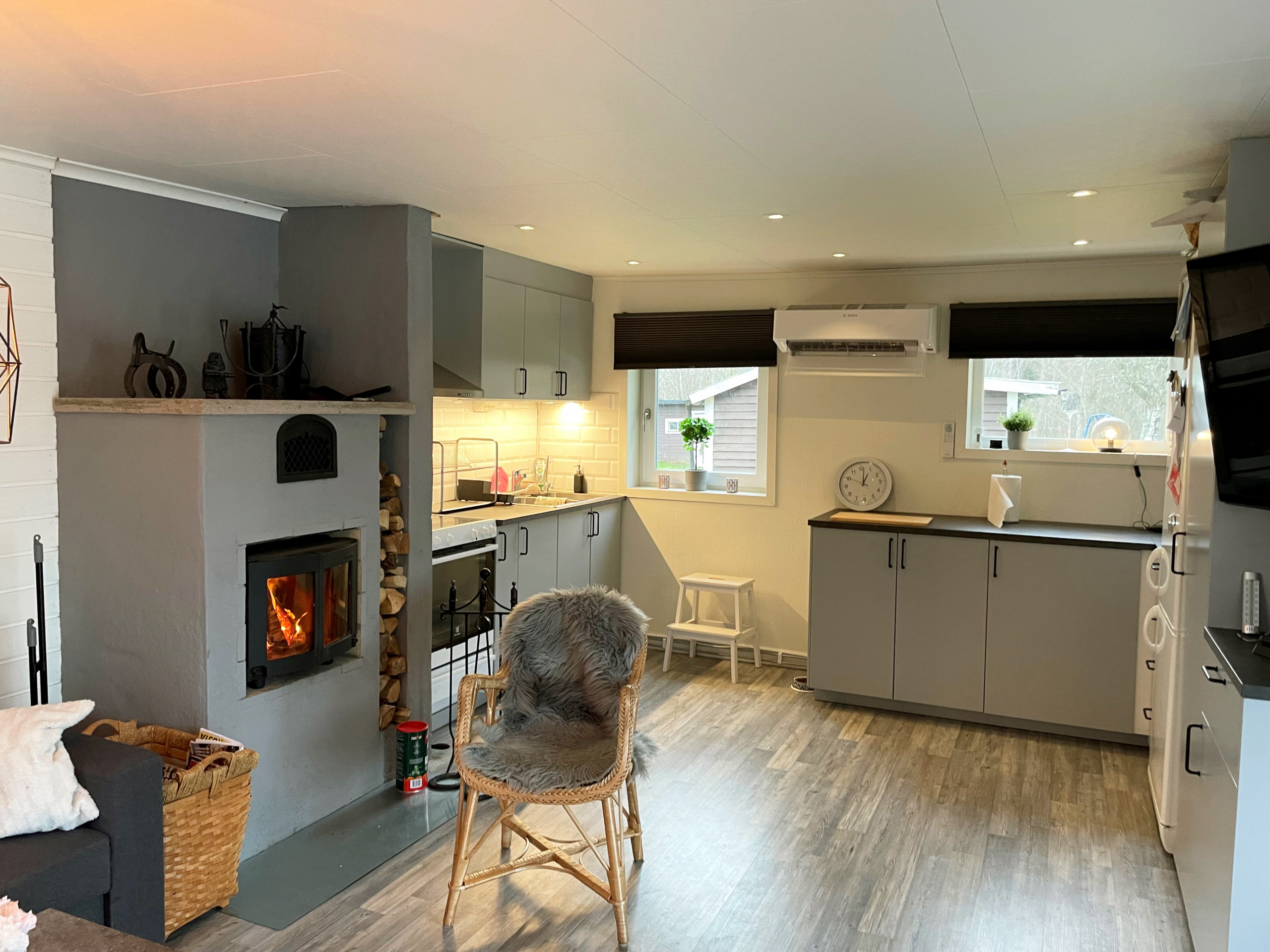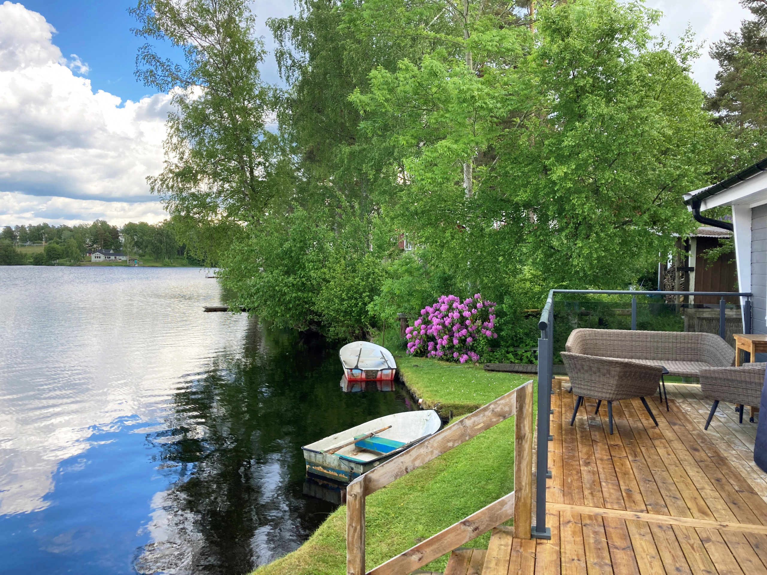 Ni bor bara 2 m från Klerebodammen och har egen sjötomt. Njut av solnedgången från den härliga terrassen som har en fantastisk utsikt. Här finns trädgårdsmöbler och gasolgrill. Vid vattnet ligger er båt (10 fot) som ingår i hyran. Det finns möjlighet att hyra till en extra båt för 700,-kr per vecka. Notera dock att fiske inte är tillåtet i sjön. Ni har ett härligt stort panoramafönster från matplatsen. Braskamin finns för kallare kvällar och ved kan köpas till. Stugan har bra standard med 1 sovrum, dubbelsäng och våningssäng samt bäddsoffa i vardagsrummet. Luftvärme med AC finns i huset. Det finns TV, Wifi, chromecast och playstation i stugan. Ni har en trevlig trädgård med gunga och fotbollsmål.