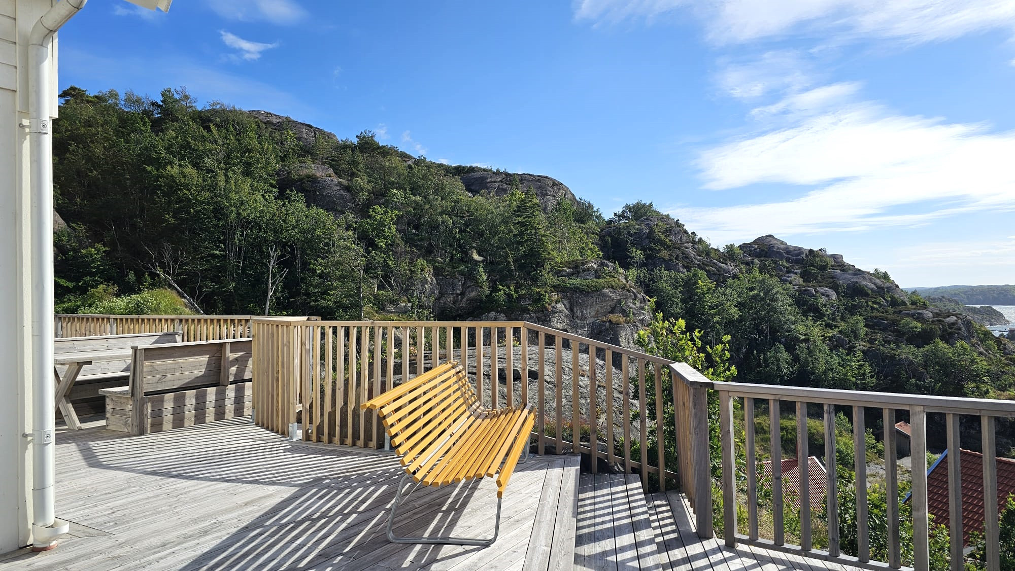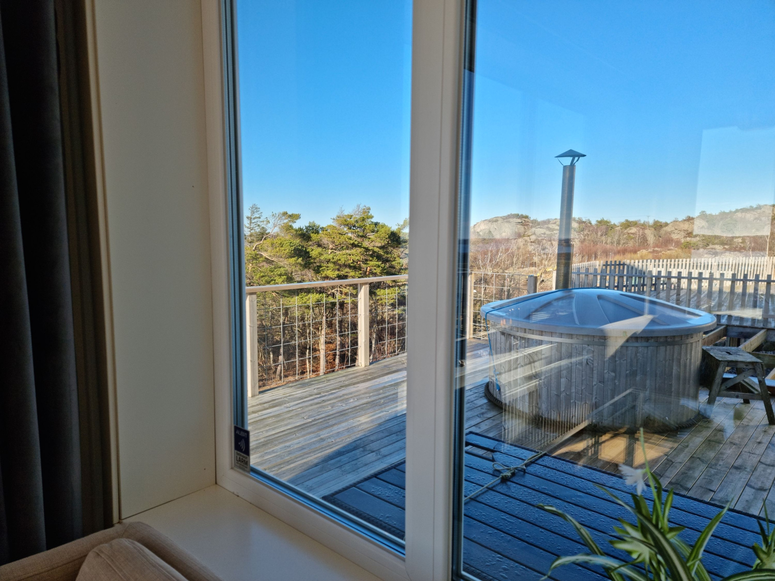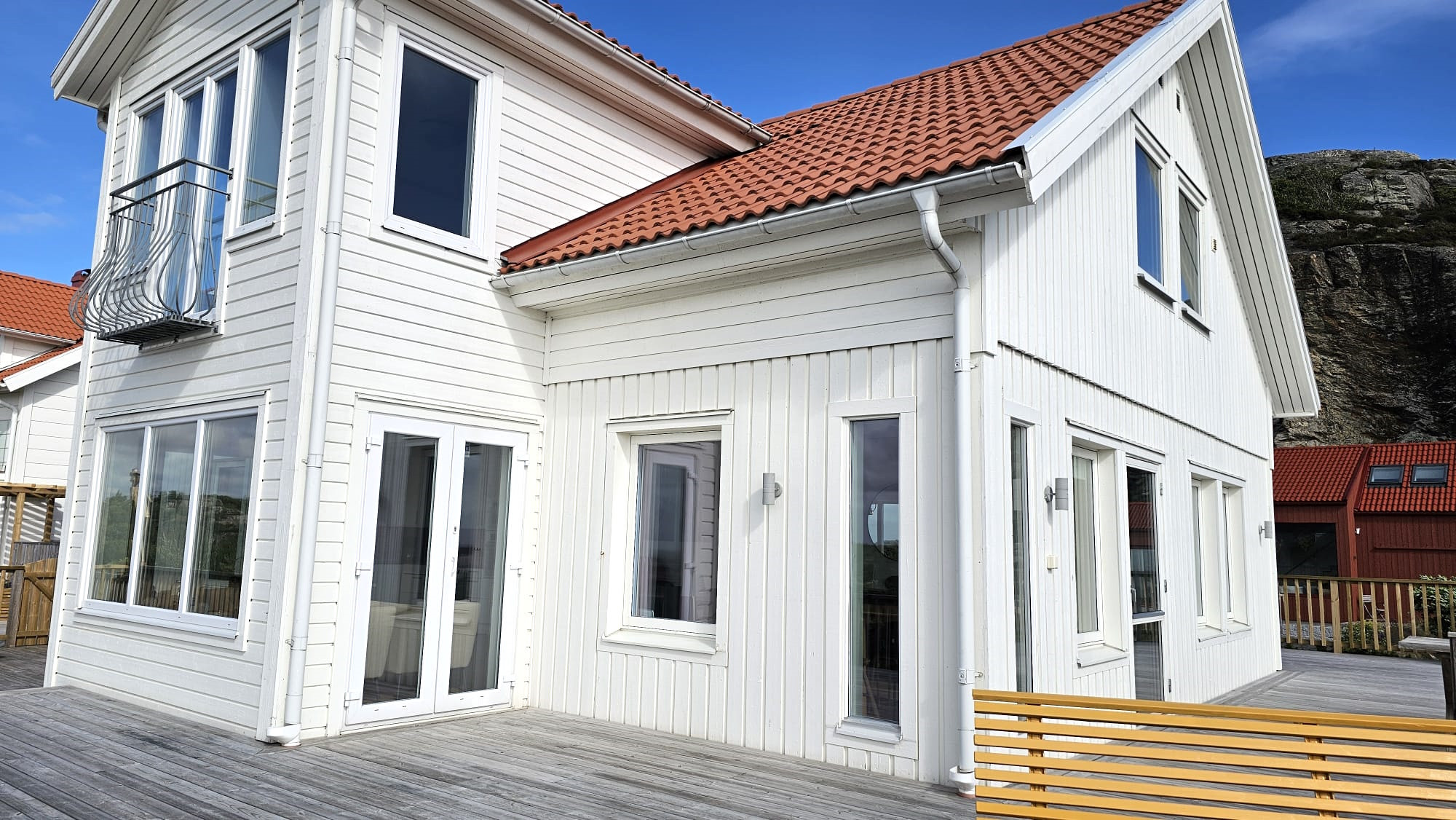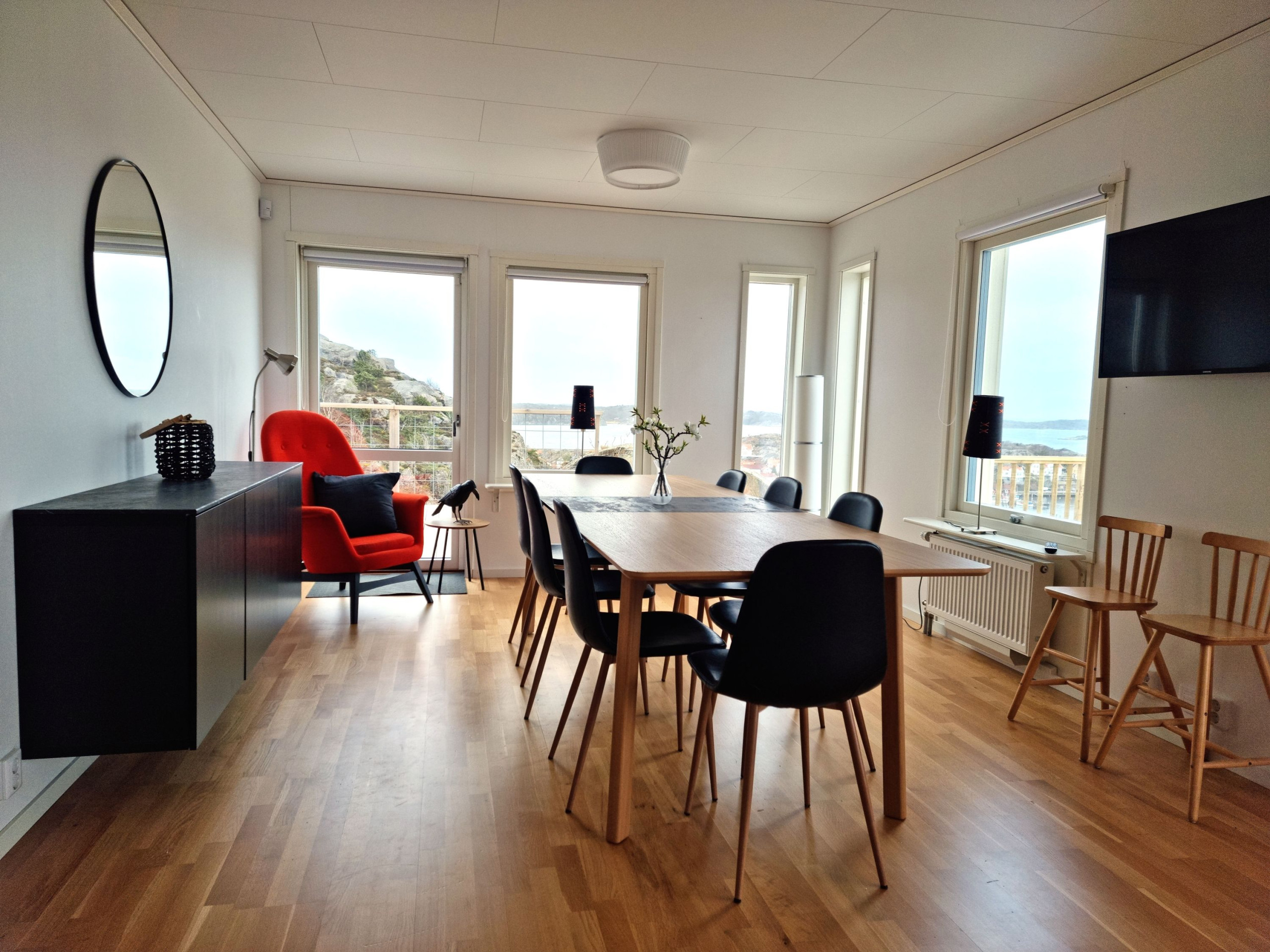 Interiören är stilren och funktionell. Köket på entréplan är fullt utrustat med spis, ugn, diskmaskin, micro, kyl/frys och matplats. Härifrån har ni direkt access till altanen som har sol hela dagen. På övervåningen finns ytterligare ett mindre kök, vardagsrum med bäddsoffa och TV samt utsikt över havet. För er bekvämlighet finns även tvättmaskin och resesäng för baby. Utomhus kan ni njuta av grillkvällar, havsbrisen och den magiska solnedgången över Bohuslän. För extra avkoppling finns möjlighet att hyra en vedeldad badtunna.