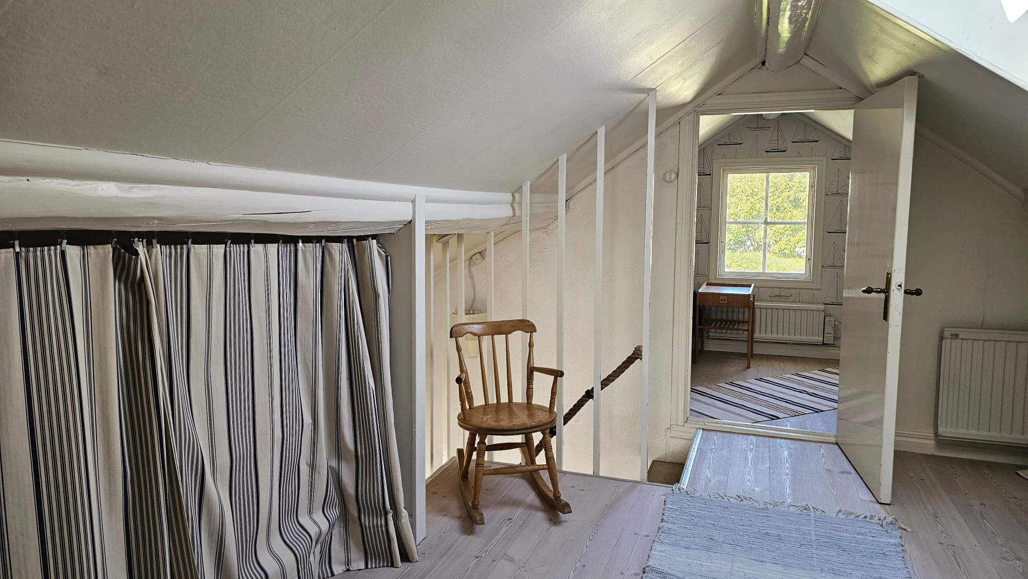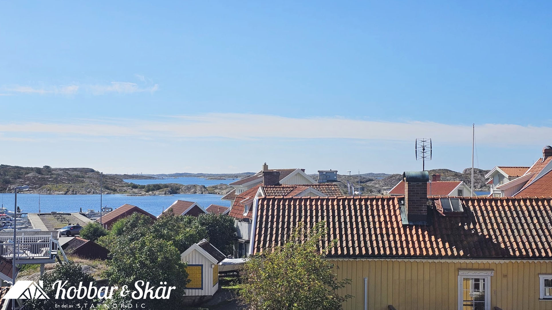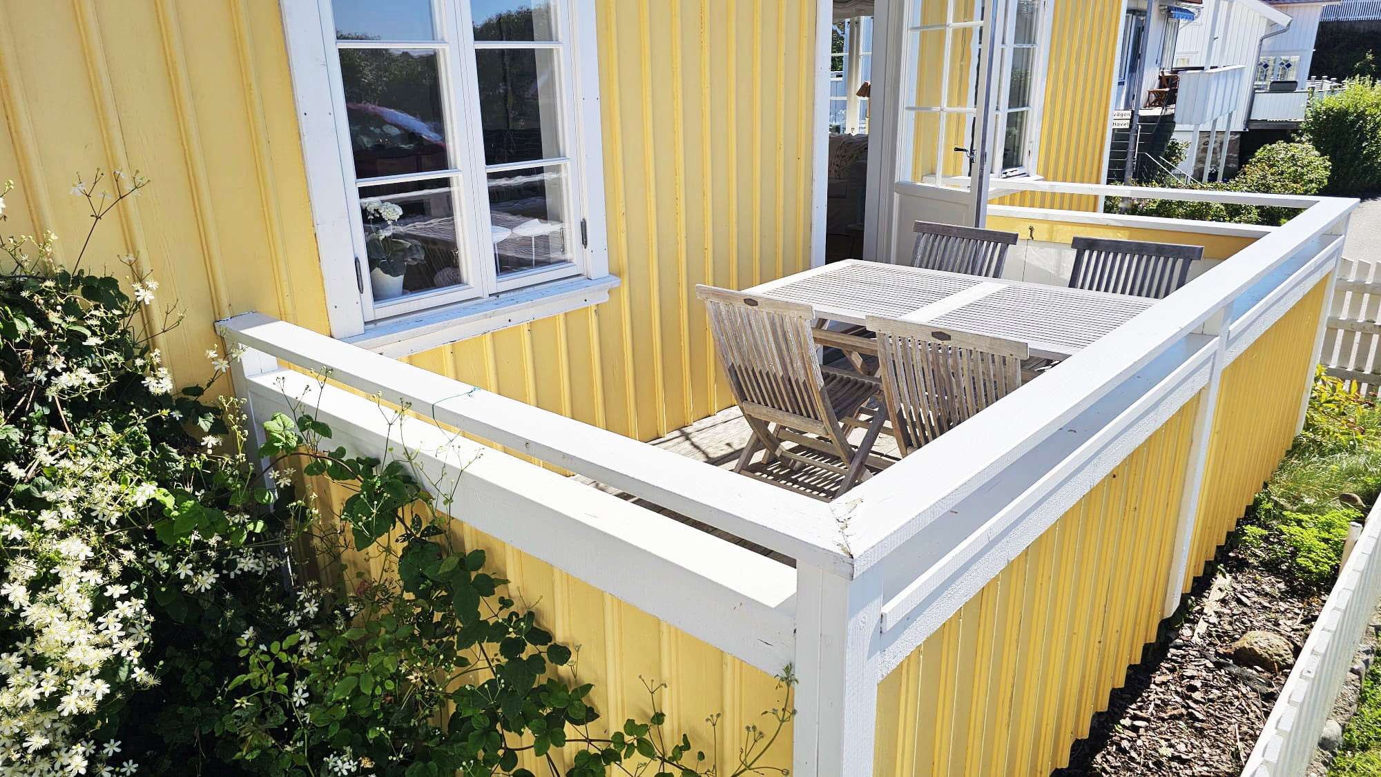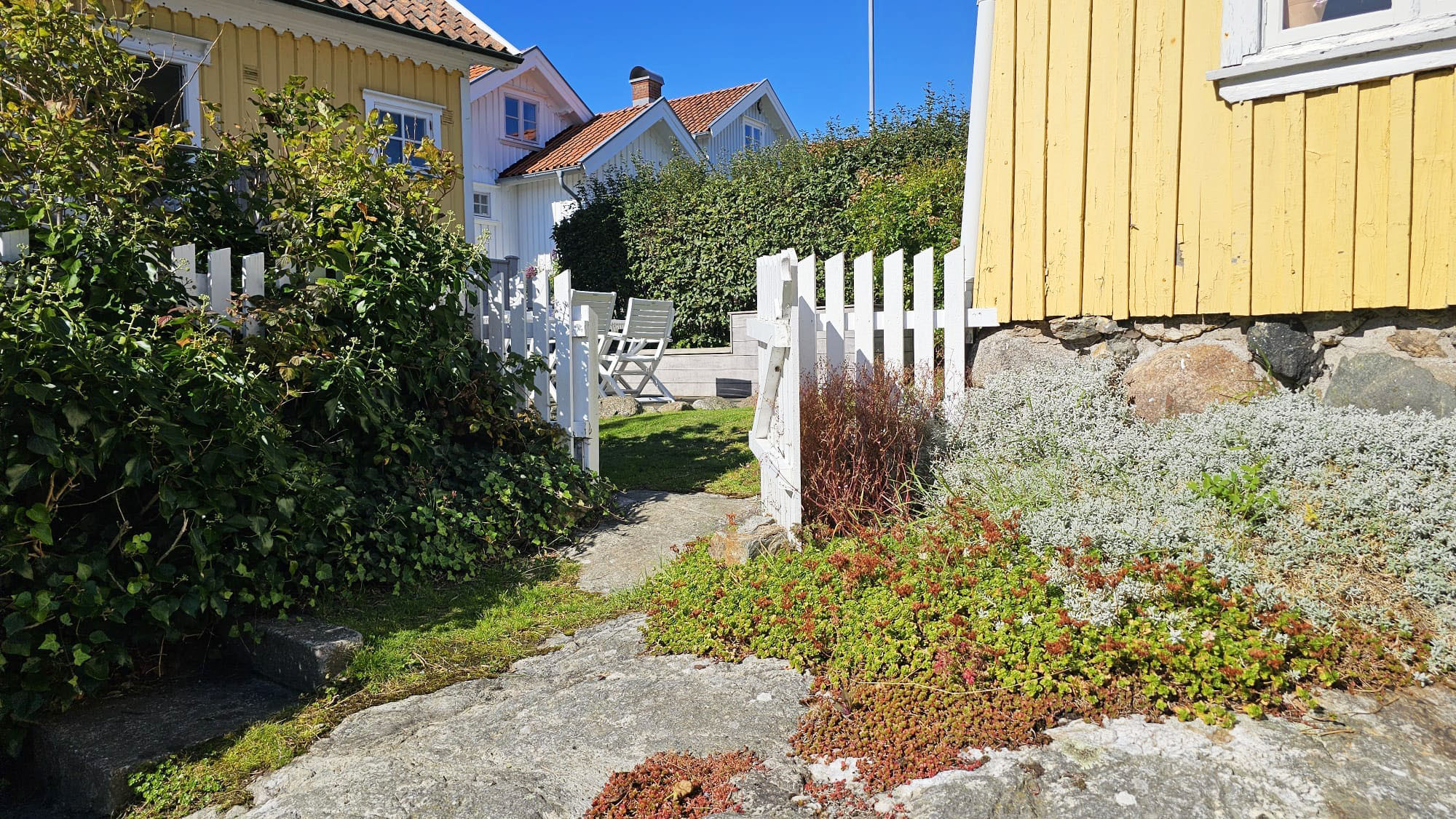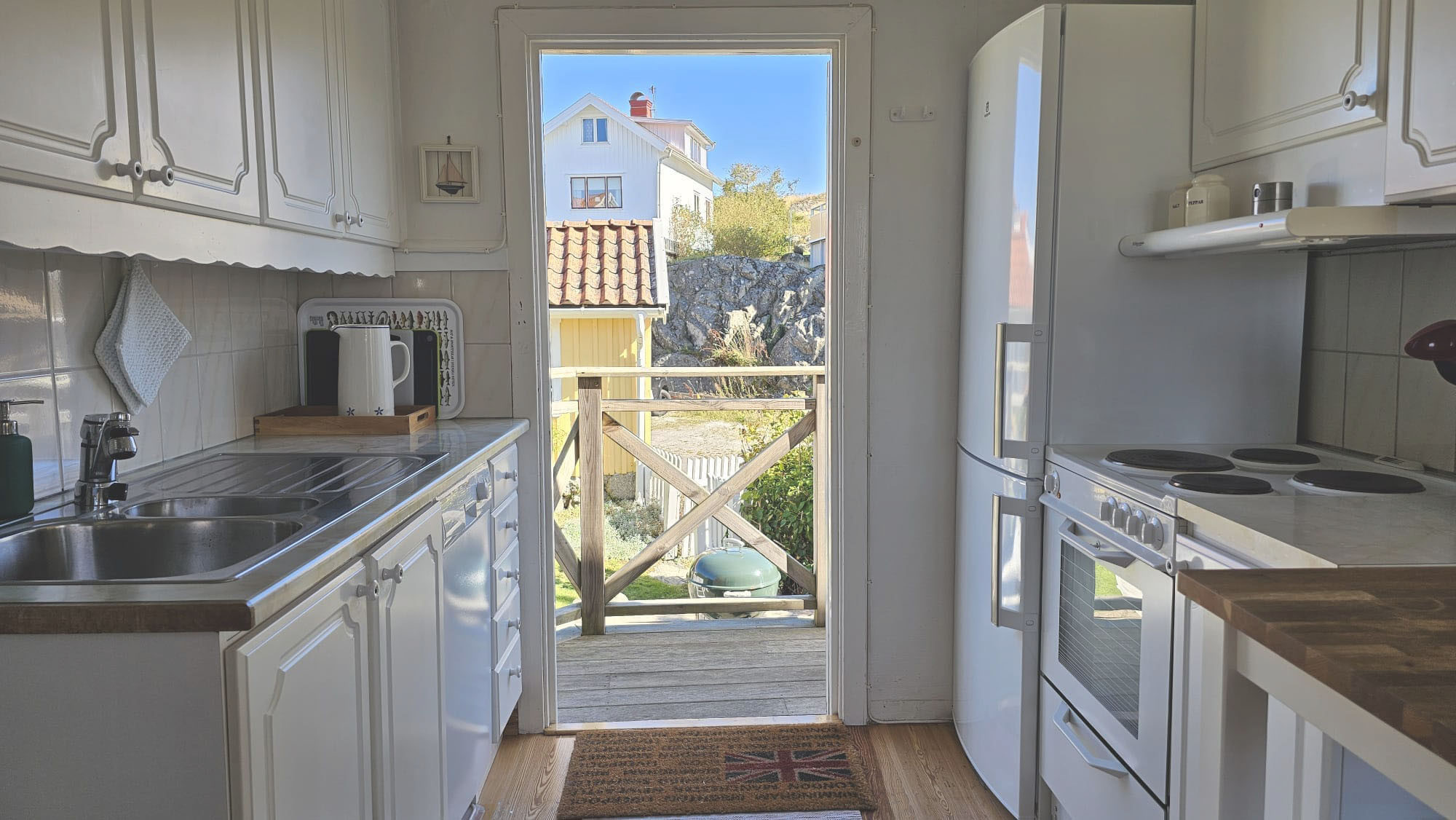Interiören är stilren och funktionell. Köket på entréplan är fullt utrustat med spis, ugn, diskmaskin, micro, kyl/frys och matplats. Härifrån har ni direkt access till altanen som har sol hela dagen. På övervåningen finns ytterligare ett mindre kök, vardagsrum med bäddsoffa och TV samt utsikt över havet. För er bekvämlighet finns även tvättmaskin och resesäng för baby. Utomhus kan ni njuta av grillkvällar, havsbrisen och den magiska solnedgången över Bohuslän. För extra avkoppling finns möjlighet att hyra en vedeldad badtunna.