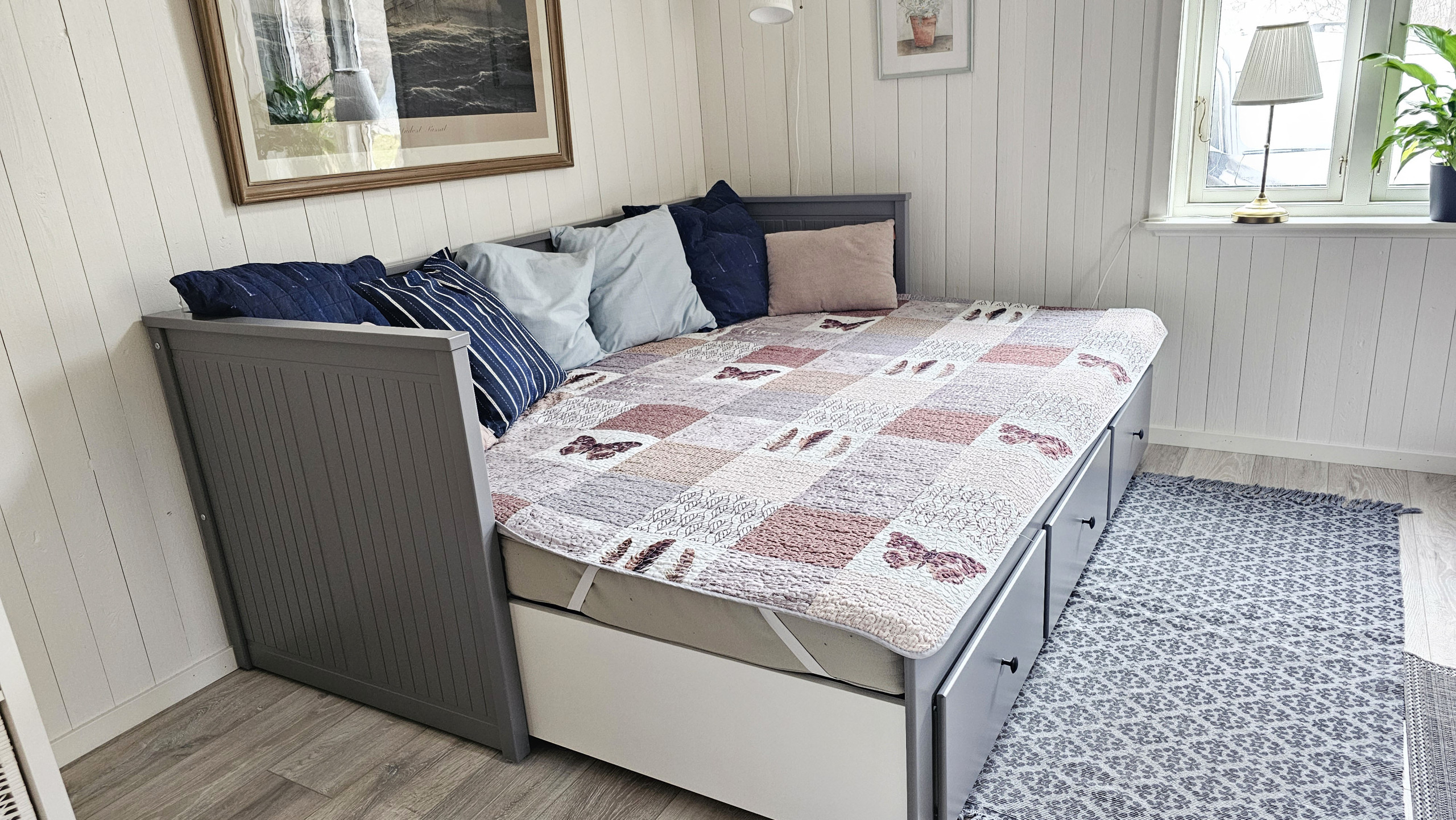 Stugan har plats för 6 personer och bjuder på en ljus och hemtrevlig atmosfär med öppen planlösning mellan kök, matplats och vardagsrum. Köket är modernt och fullt utrustat och i vardagsrummet finns en bekväm IKEA dagbädd som blir 160 centimeter bred när den bäddas ut. Sovrummet på entréplan har en ny dubbelsäng. På loftet finns bekväma resårmadresser och två små fönster med utsikt mot ladan, vilket gör det till en perfekt sovplats för större barn eller vuxna. Badrummet är utrustat med dusch, tvättmaskin och golvvärme.