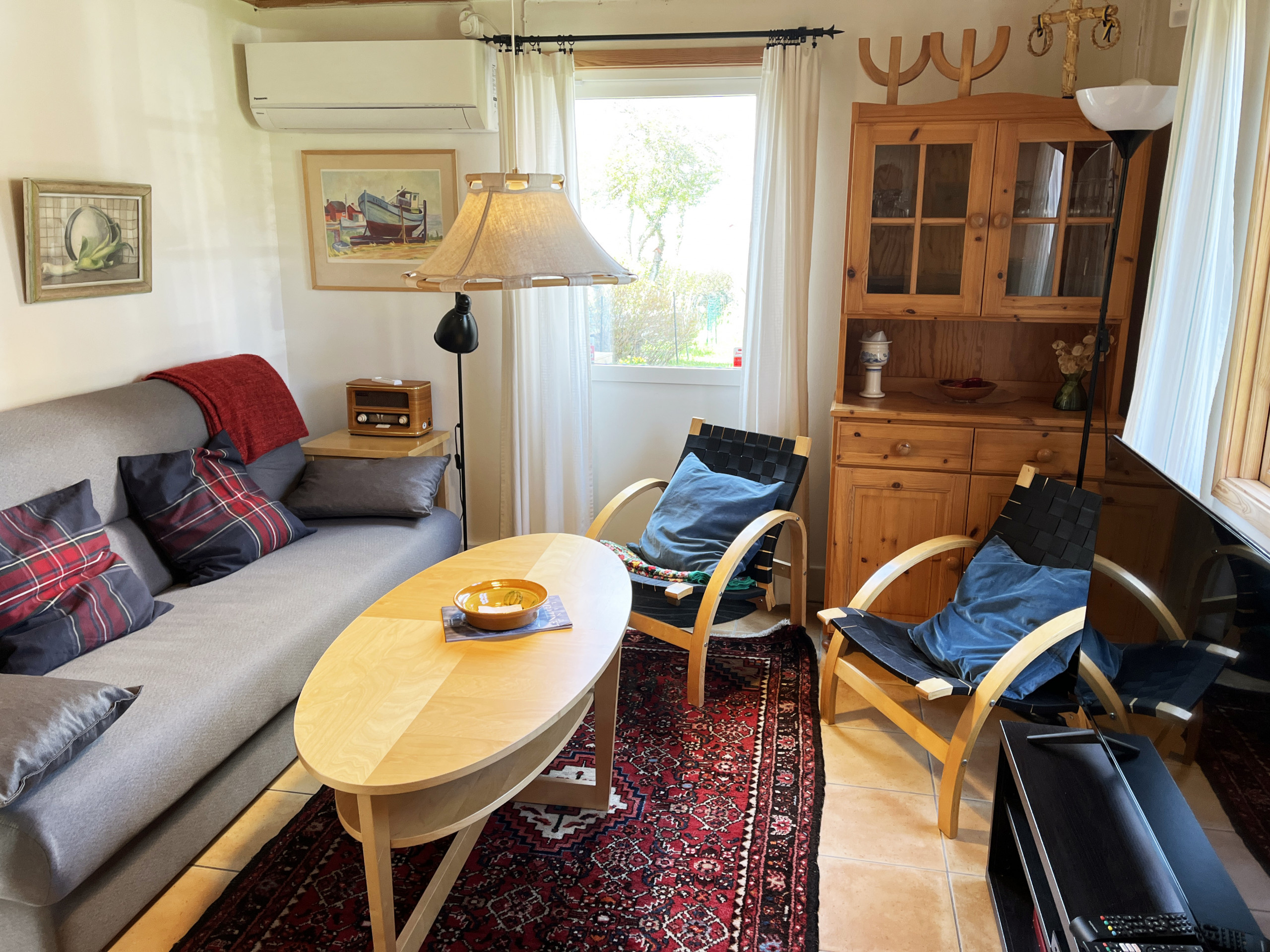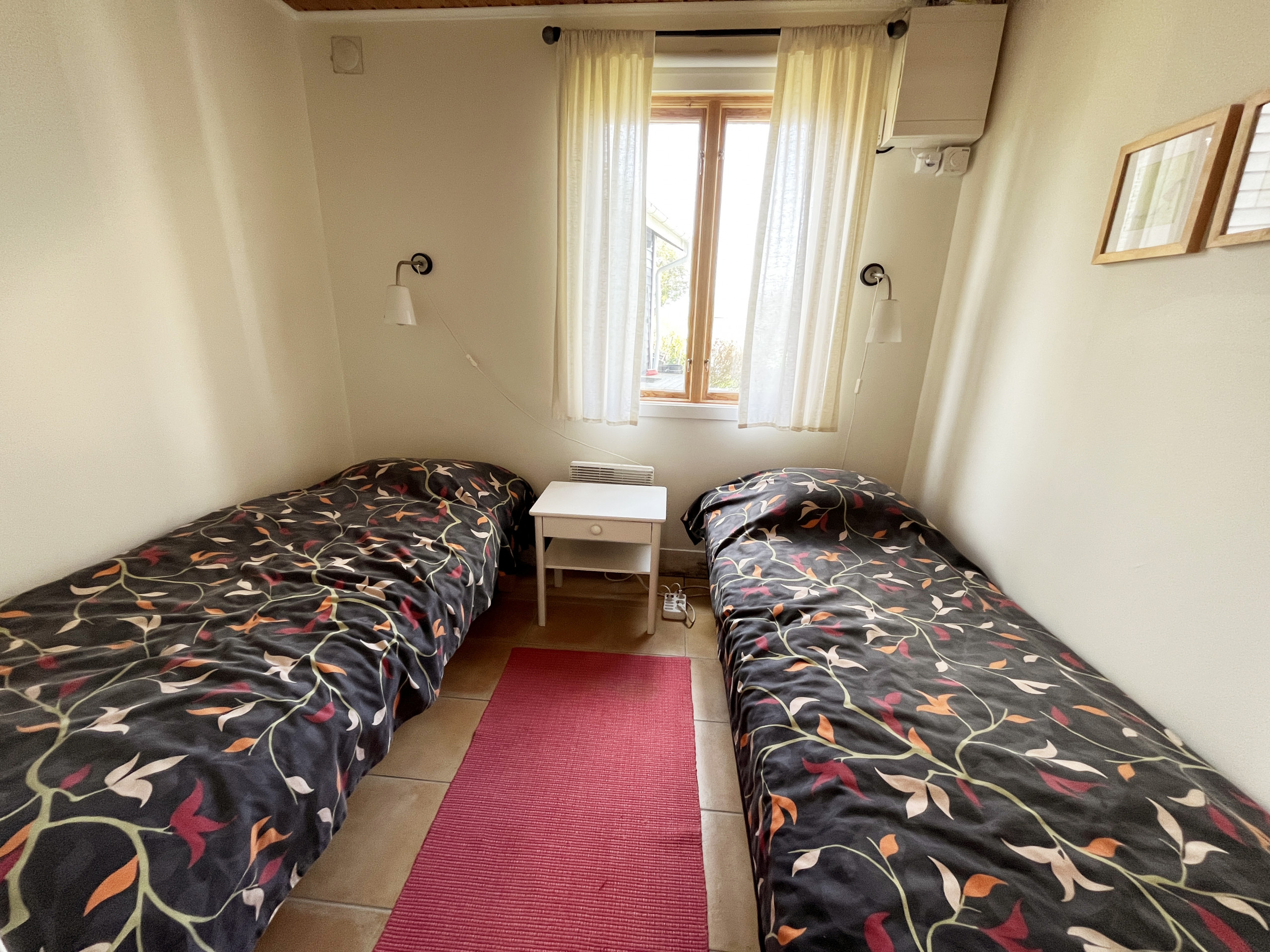 Stugan rymmer upp till fem personer och har två sovrum, vardera möblerade med två enkelsängar. Köket är fullt utrustat med spis, ugn, kyl/frys, mikrovågsugn och diskmaskin. Det finns också ett matbord med en bekväm bänk och stolar. I det ombonade luftkonditionerade vardagsrummet finns en bäddsoffa, soffbord, två fåtöljer och en Smart Tv med satellitkanaler med svenska och tyska kanaler samt en dörr ut till trädgården. Det helkaklade badrummet har både dusch och toalett. I det intilliggande uthuset finner ni bastun som har viss havsutsikt en dusch, toalett, tvättmaskin samt torktumlare.