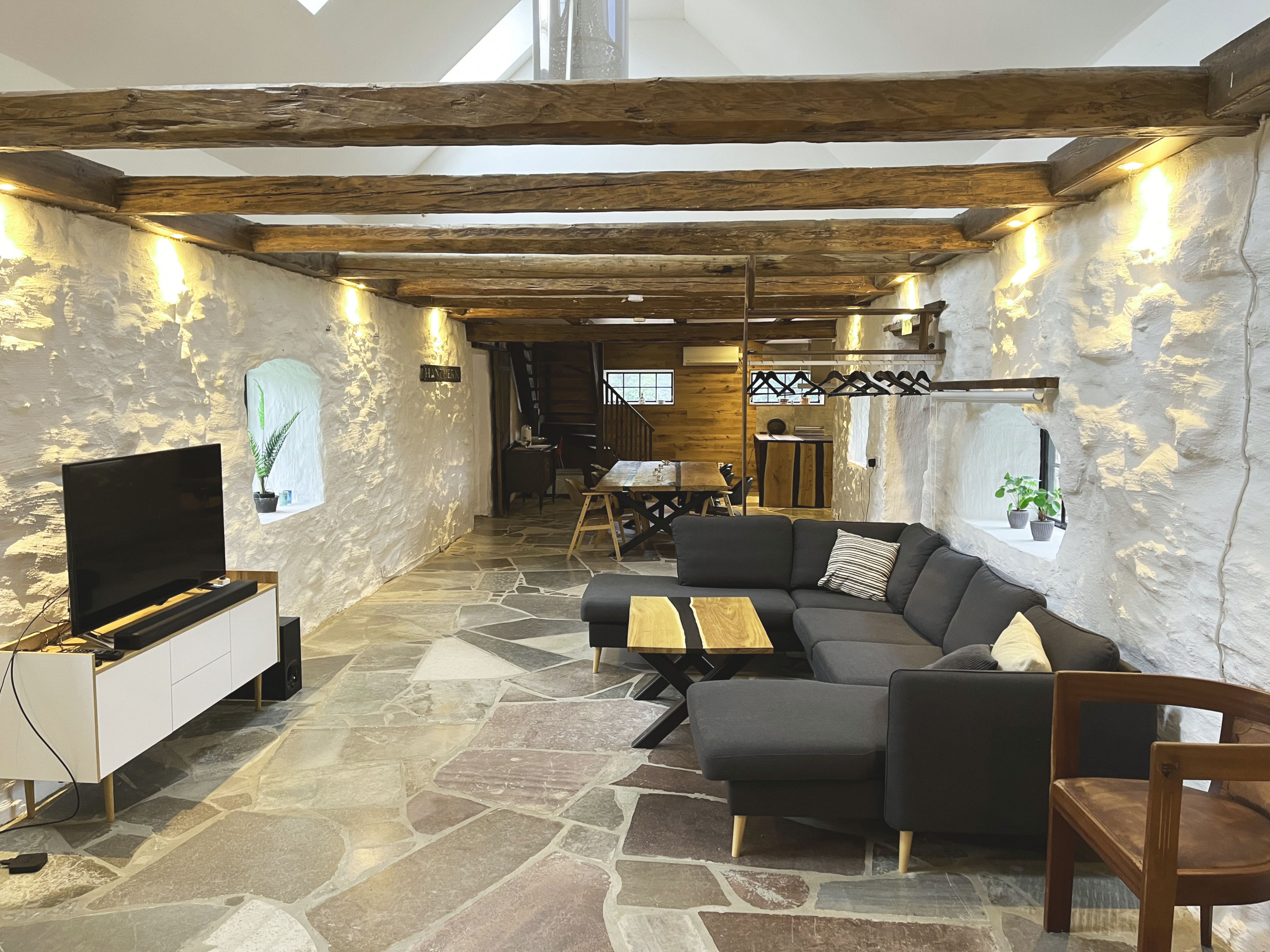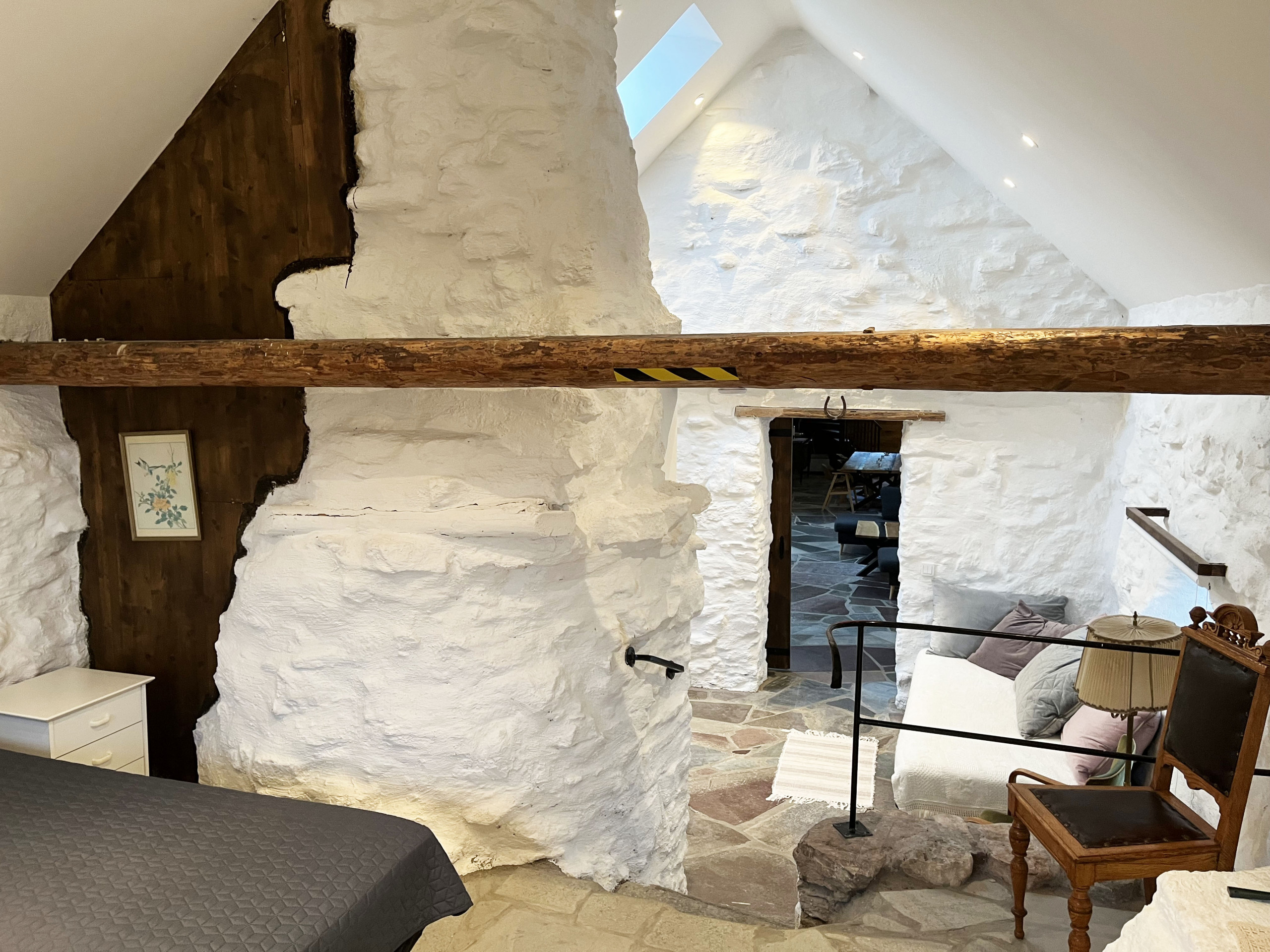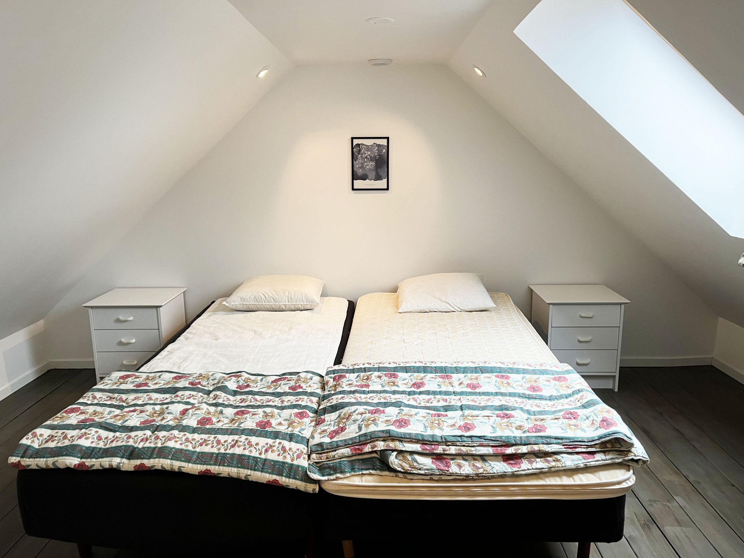 Entréplanet är ljust och rymligt med vitkalkade stenväggar och golv av kalksten. Planlösningen är öppen med synliga takbjälkar i taket och infällda dimbara spotlights. Vardagsrummet är möblerat med en soffgrupp och en Tv med chromecast. Intill finner ni matplatsen och det påkostade köket som bland annat har dubbla ångugnar. Huset har två helkaklade badrum med dusch. Via groventrén når ni den insynsskyddade baksidan som har kvällssol. I den bortre änden av huset ligger ett sovrum med dubbelsäng samt en enkelsäng på 120 cm. Övre planet har en möblerbar hall och tre sovrum med två enkelsängar i varje. Här är takhöjden lite lägre. På framsidan finns en parkering som bland annat används av den intilliggande restaurangens gäster under sommartid.