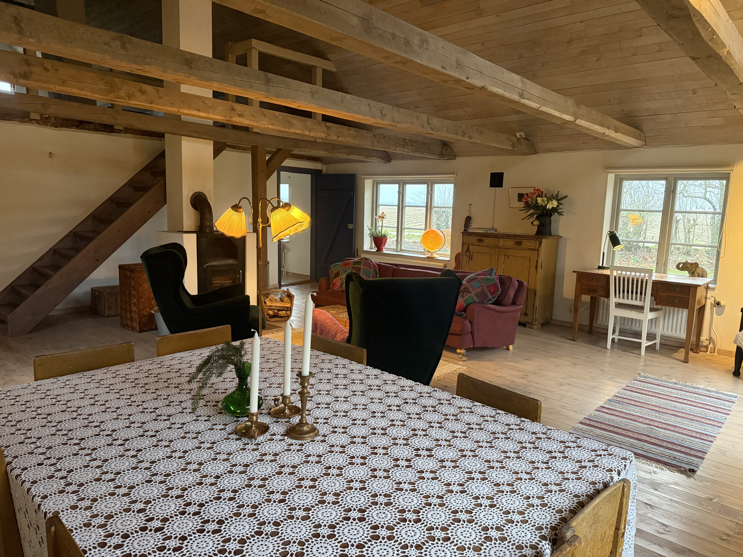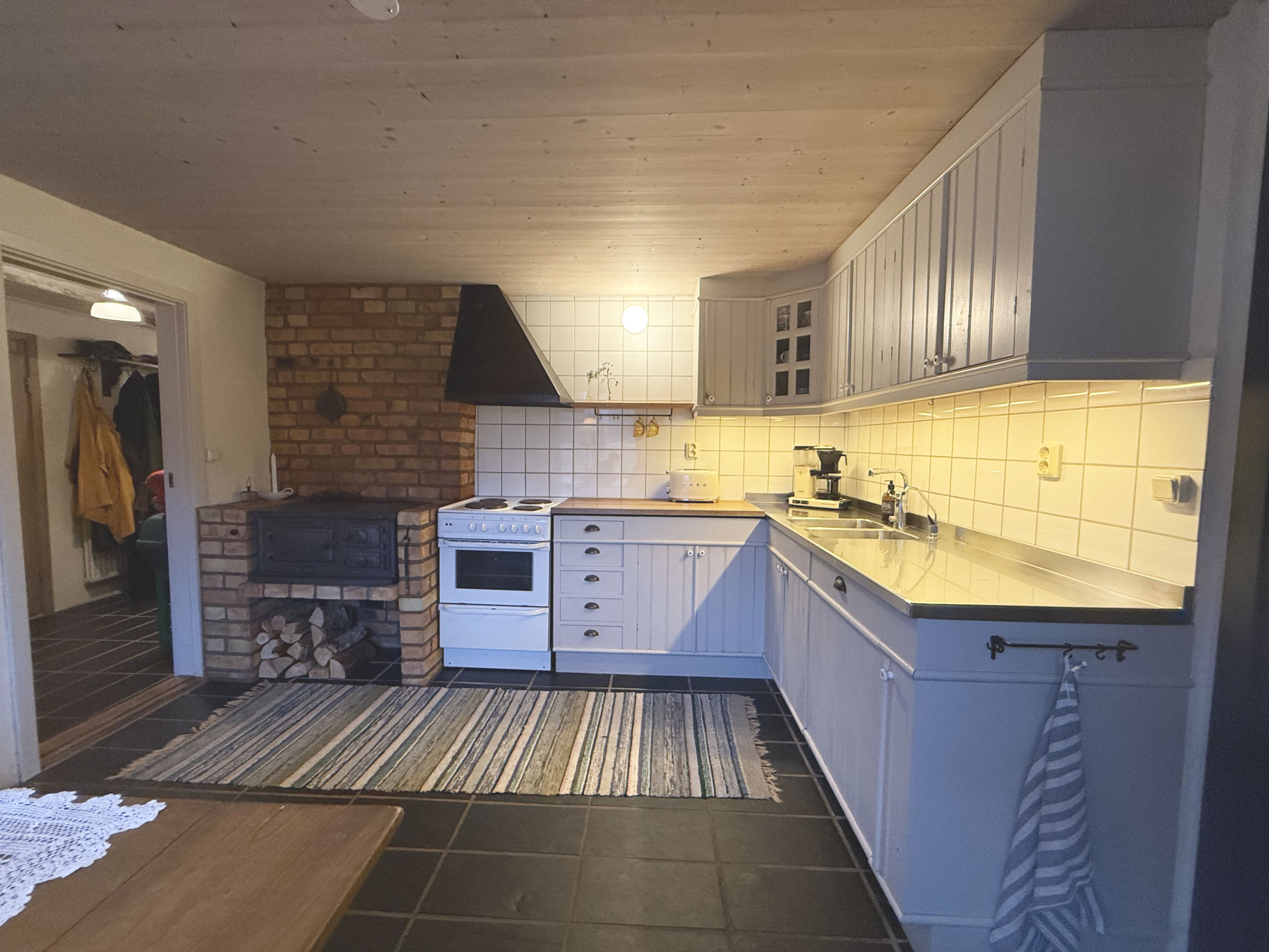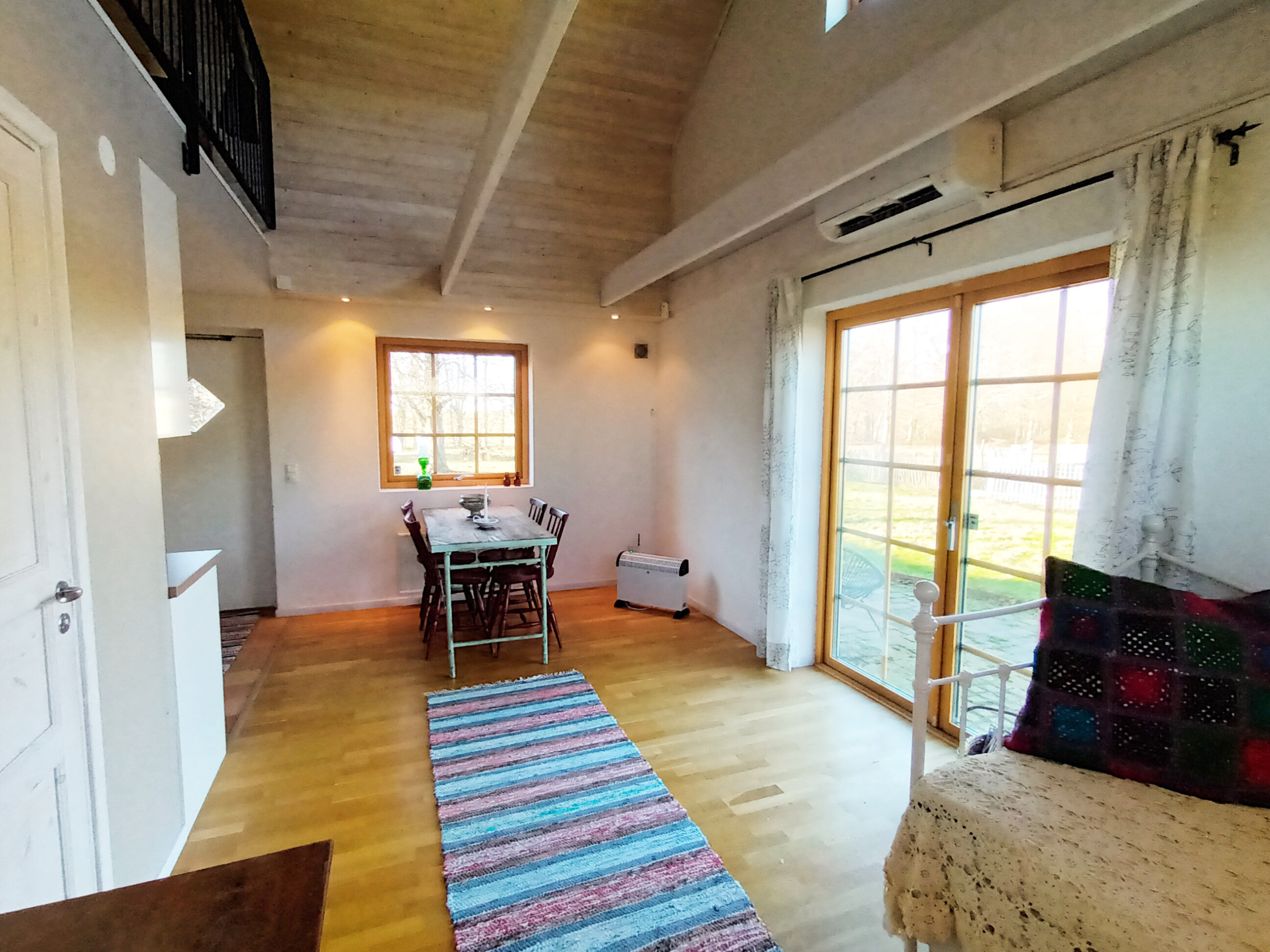 Stora huset rymmer ett sovrum med två enkelsängar samt ett sovloft med dubbelsäng, vilket gör huset väl lämpat för både familjer och mindre sällskap. Här finns också en toalett med dusch samt ett välutrustat kök som passar bra för både vardagsmat och längre middagar. Stort vardagsrum öppet upp i tak, vilket ger en härlig känsla av rymd. För kyligare dagar finns en kamin som skapar både värme och stämning.