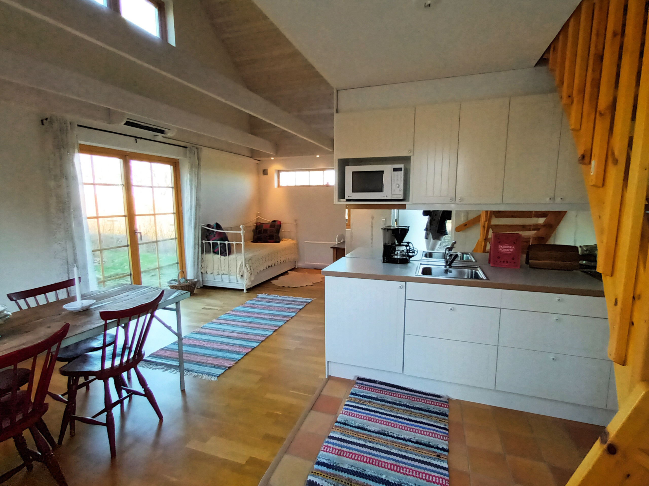 Lilla huset rymmer ett sovrum med våningssäng och ett sovloft med dubbelsäng, samt en dagbädd/enkelsäng i allrummet. Mindre kök för matlagning och toalett med dusch.