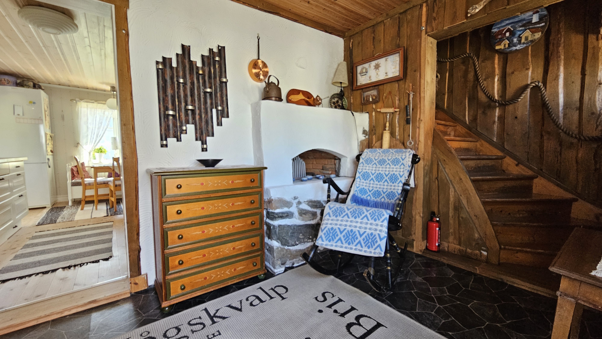 Boendet rymmer upp till 7 gäster fördelat på tre sovrum: ett på entréplan med dubbelsäng (160 cm), ett större på övervåningen med dubbelsäng (180 cm) och ett tredje med en utdragbar Ikeasäng (2×80 cm) samt en enkel 80 cm-säng. Mellan de två övervåningsrummen finns ett draperi istället för dörr, vilket ger en öppen och luftig känsla. Huset erbjuder ett badrum med dusch och WC samt ett mysigt vardagsrum med TV och DVD. Köket är utrustat med allt ni behöver – inklusive diskmaskin – och har bevarade detaljer som en gammal gjutjärnsspis (ej i bruk).