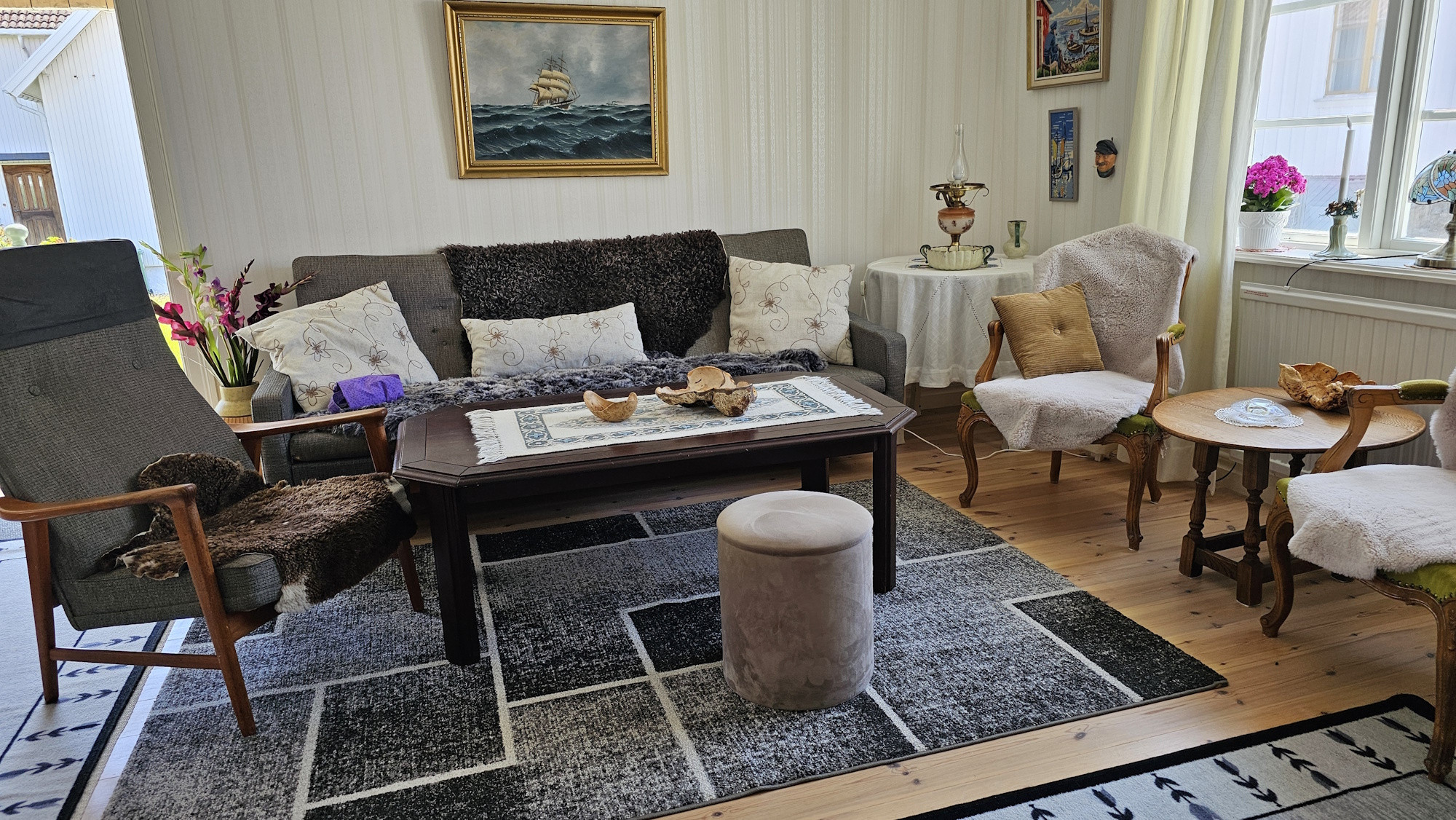 På den lilla takaltanen kan du slå dig ner med morgonkaffet och blicka ut mot havet och ända bort till Käringön. Trädgården är liten men charmig, med utemöbler, parasoll och kolgrill. Här finns även en båtplats som kan lånas vid förfrågan – perfekt för dig som vill ta dig ut bland kobbar och skär. Ett mindre husdjur är tillåtet.
