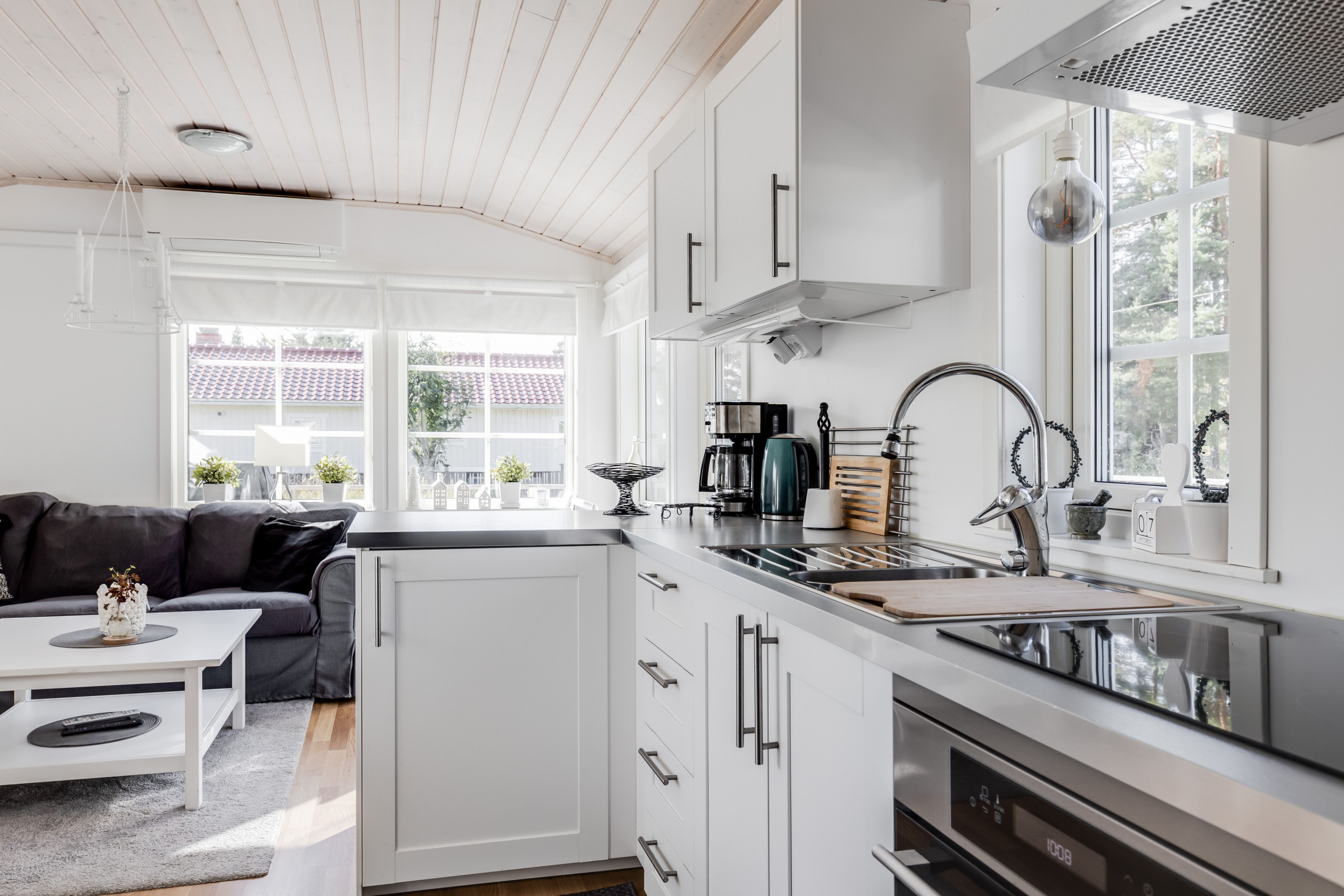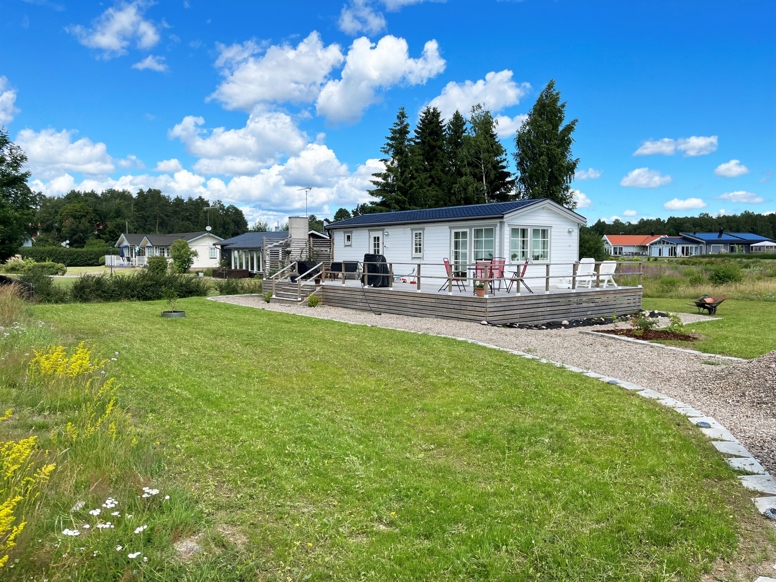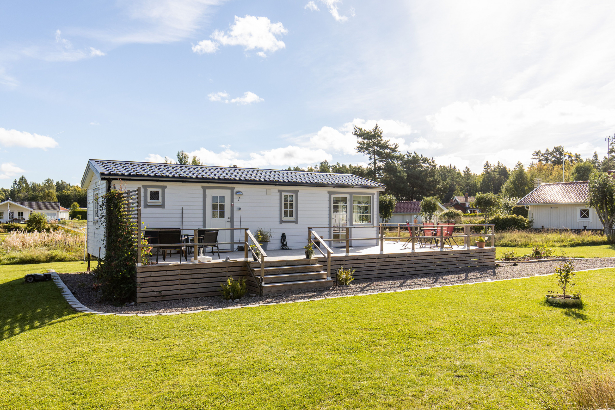 Fin villavagn som har två sovrum med plats för fyra personer, två i varje. Det finns badrum med dusch, toalett och en tvättmaskin med inbyggd torktumlare. Köket är öppet mot vardagsrummet som har en TV med svenska, engelska och tyska kanaler. Terrassen är väldigt stor och utrustad med flera utemöbler, både för att sola och äta sommarmiddagar. För det sistnämnda finns även en grill.