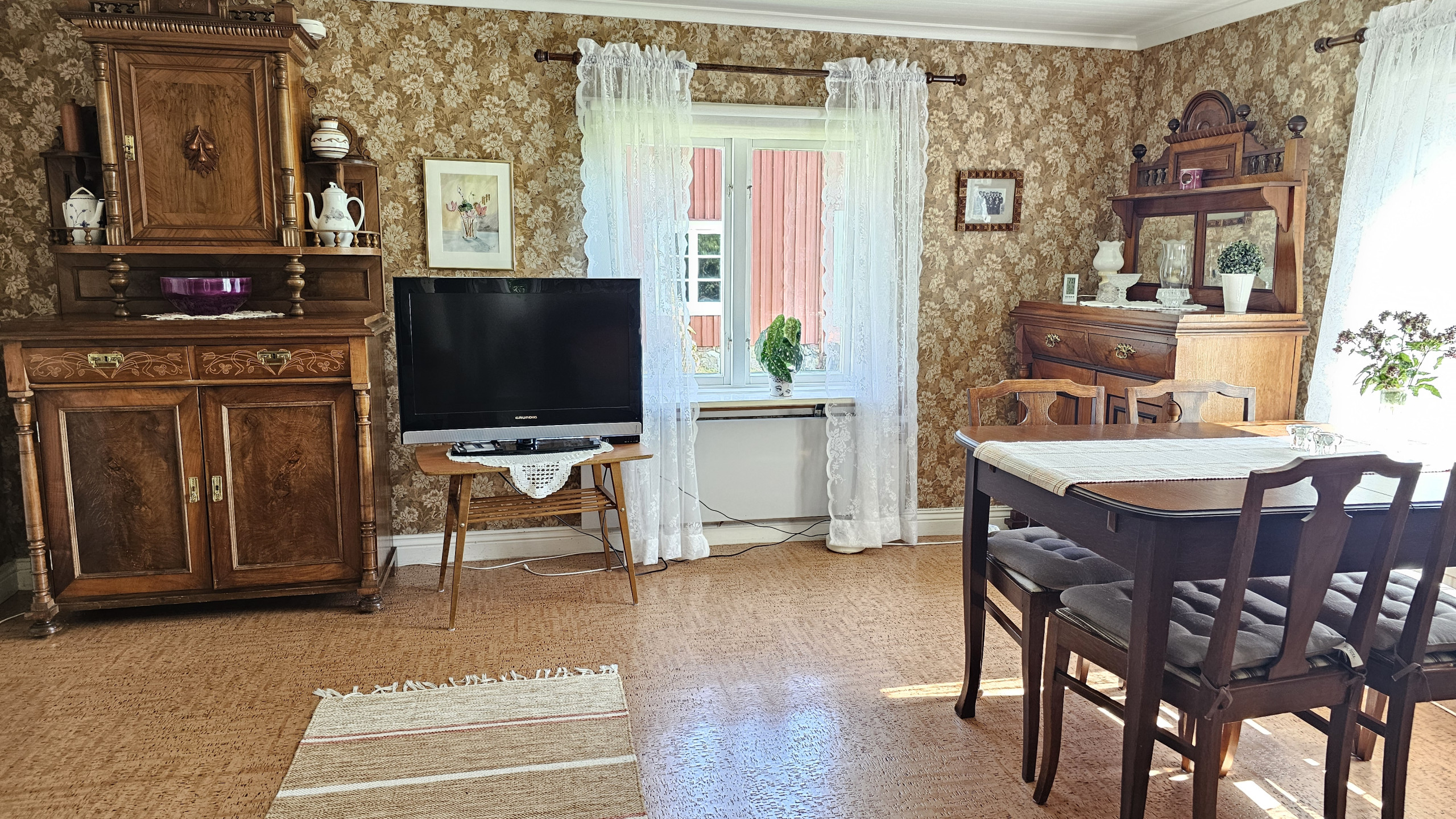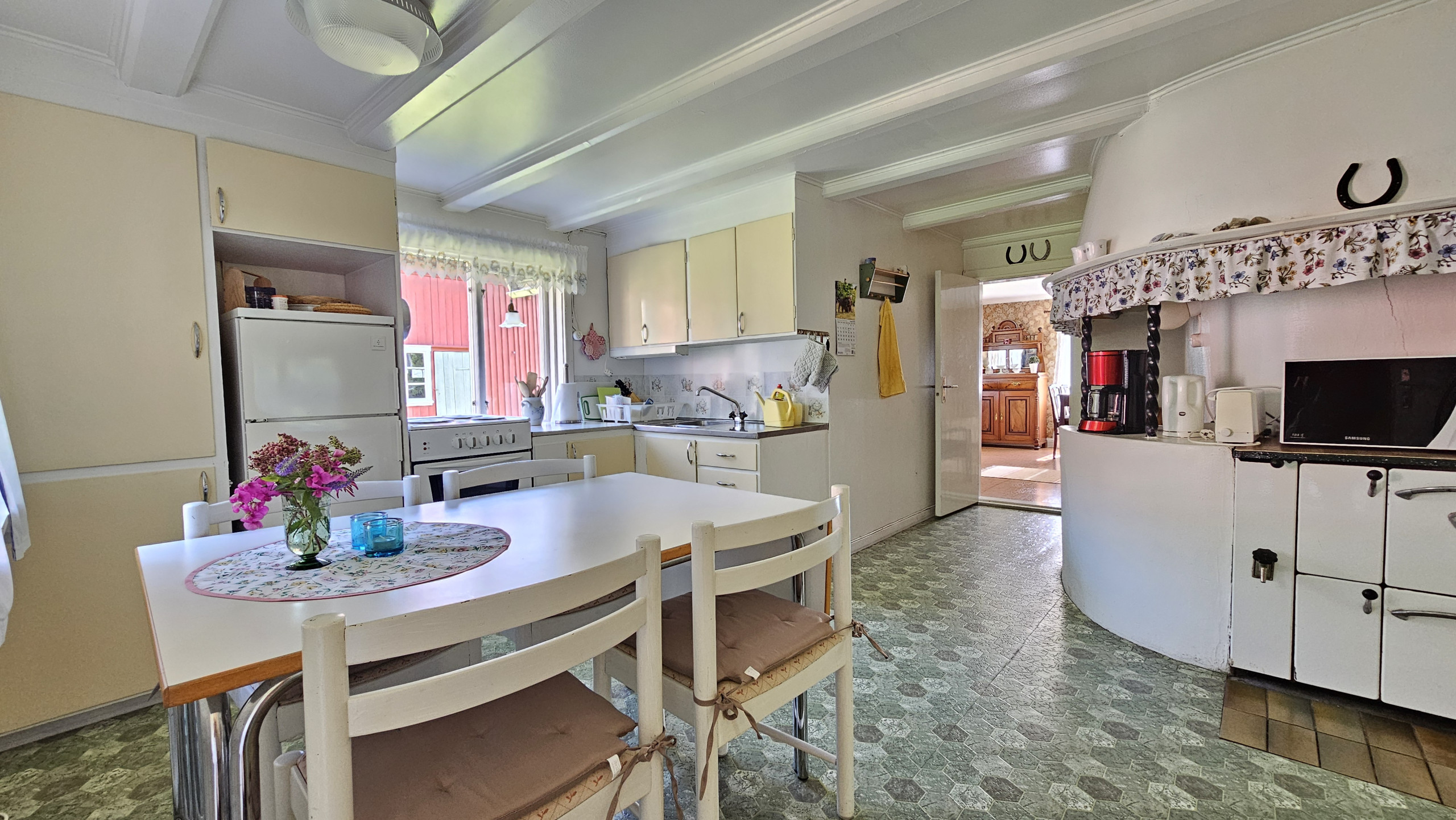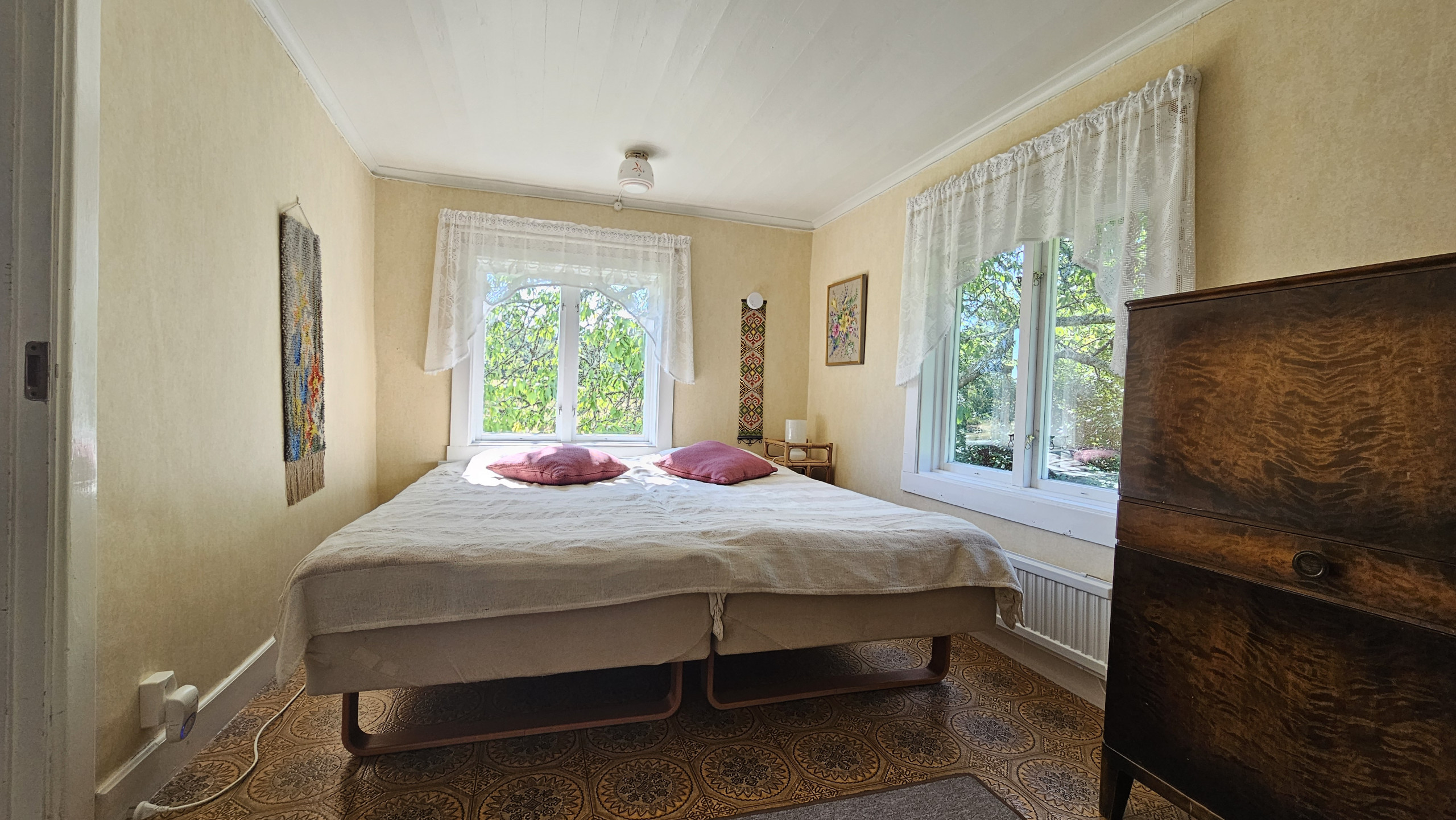 Huset rymmer upp till 5 personer fördelat på två sovrum med vardera två enkelsängar, varav ett med lågt i tak (ca 190 cm). Här finns ett charmigt kök med matplats och den gamla vedspisen som inredningsdetalj, vardagsrum med soffa, matsalsmöbel och TV, samt badrum med dusch och WC. Från den lilla verandan med korgmöbler blickar ni ut över trädgården.