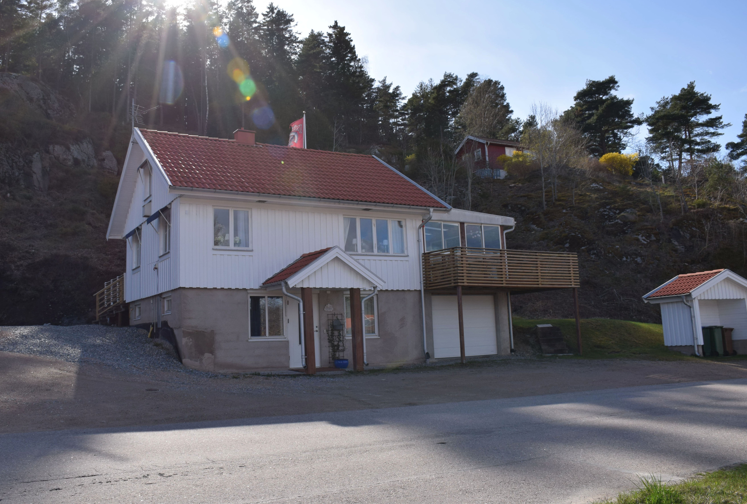 Huset är inrett för trivsel året runt och erbjuder fyra sovrum, flera sällskapsytor och ett stort inglasat uterum där hela gänget får plats. Uterummet fungerar som ett extra vardagsrum med utsikt mot altanen, som löper runt halva huset – en härlig plats för grillkvällar och långa sommarkvällar. På entréplanet finns ett sovrum med TV och tvättstuga, medan mellanvåningen rymmer vardagsrum med stor soffa, ett sovrum med dubbelsäng och TV, välutrustat kök samt badrum med dusch. På övervåningen finns ett mysigt sovloft med ståhöjd i mitten, ytterligare ett sovrum och lite havsutsikt från fönstret.