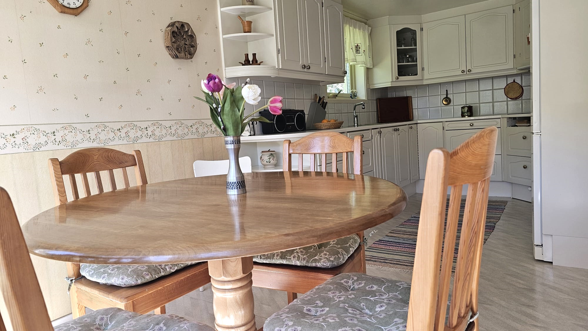 Inomhus möts ni av en hemtrevlig atmosfär. På entréplan finns ett välutrustat kök med matplats, ett rymligt vardagsrum med matsalsbord, soffgrupp och TV med basutbud samt Chromecast. Här finns även två sovrum och ett badrum med dusch. På övervåningen finns ytterligare ett sovrum, en bäddsoffa, liten arbetsplats samt en extra toalett. I källaren finns både tvättmaskin och torktumlare, perfekt för längre vistelser.