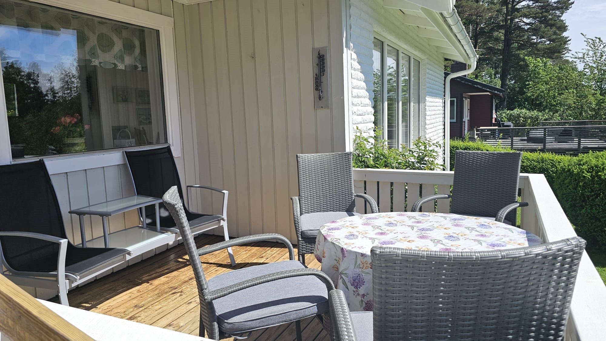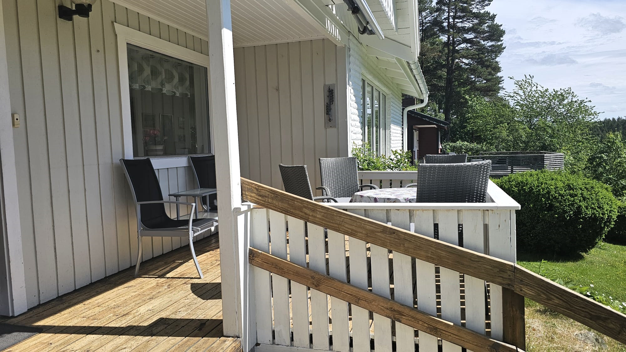 Den stora altanen i söderläge bjuder på sol från morgon till kväll, med både matgrupp, loungehörna och grill för härliga sommarkvällar.