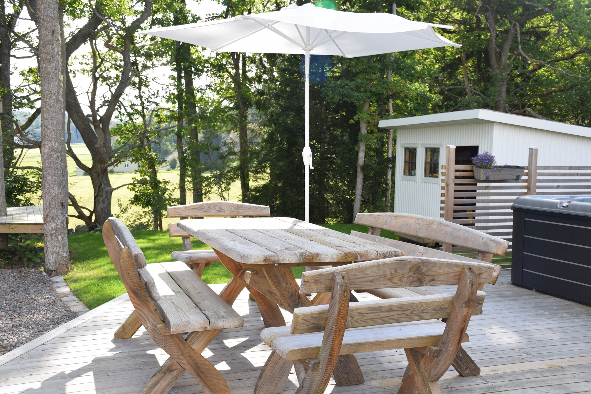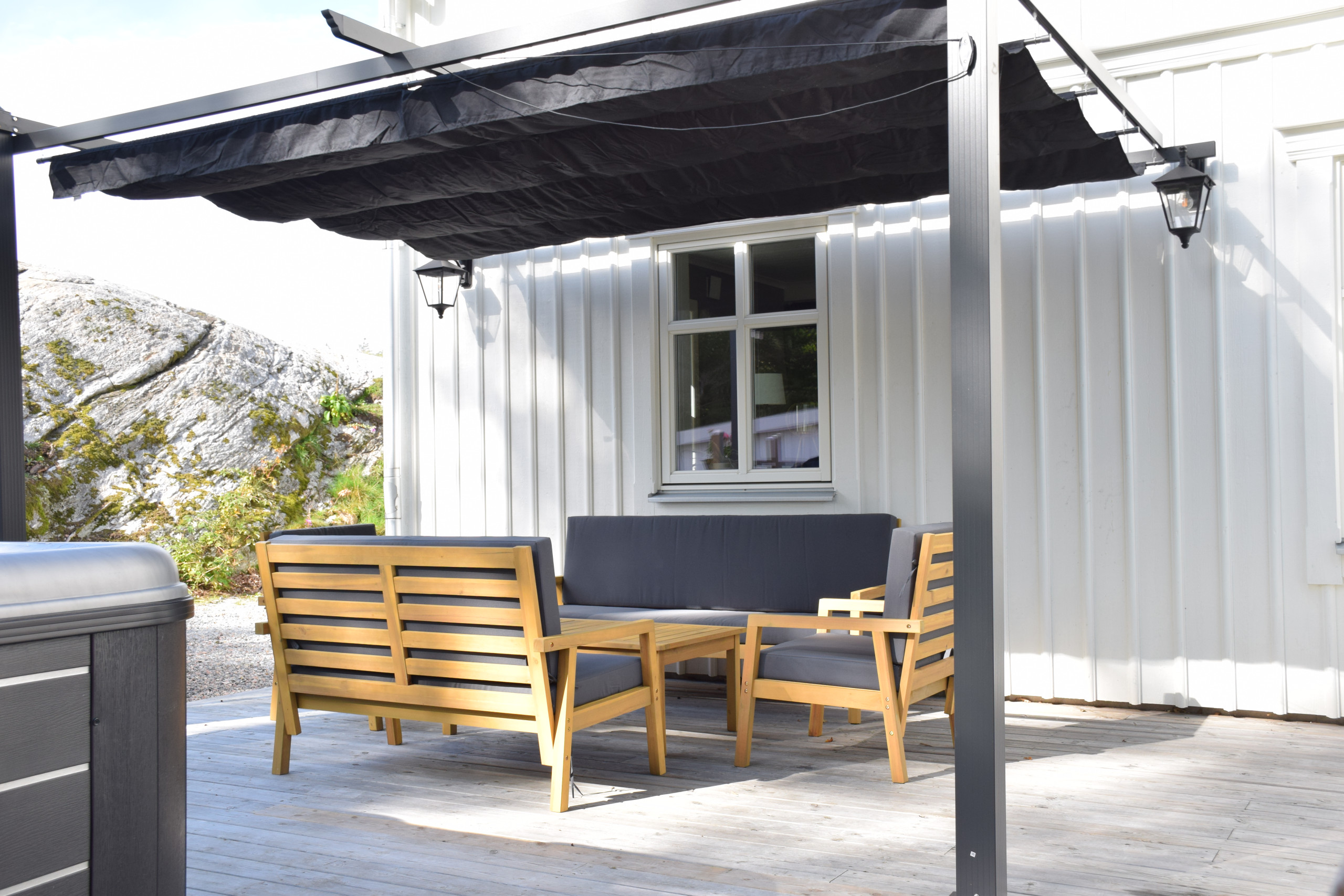På baksidan väntar er en härlig altan med gott om plats för sociala stunder. Njut av uteduschen, ta ett avkopplande dopp i jacuzzin och samla hela gänget för grillkvällar i solnedgången. Parkering finns precis utanför dörren och huset har tvättmaskin, Wi-Fi och Apple TV – allt för en smidig och bekväm vistelse.