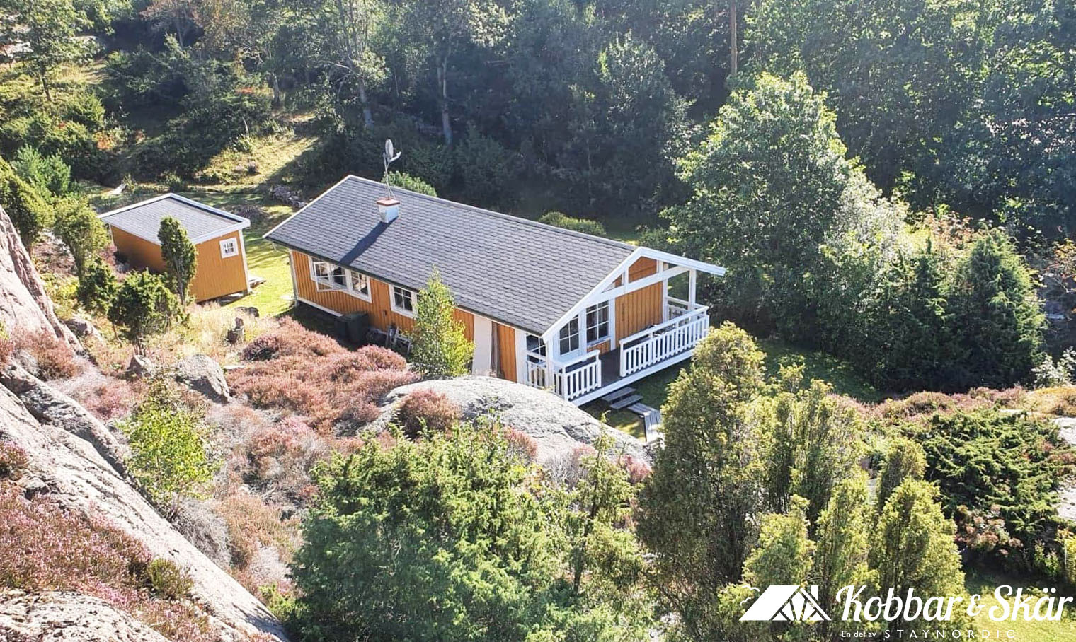 Utomhus väntar tre fina uteplatser, varav två under tak, och en liten lekstuga som barnen kommer att älska. Tomten ligger insynsskyddad och bjuder på sol större delen av dagen. För de som vill njuta av havet finns en badplats och småbåtshamn endast 800 meter bort, och möjlighet att låna båtplats för mindre båt. Här finns allt för en rofylld och härlig semester i vacker bohuslänsk natur.