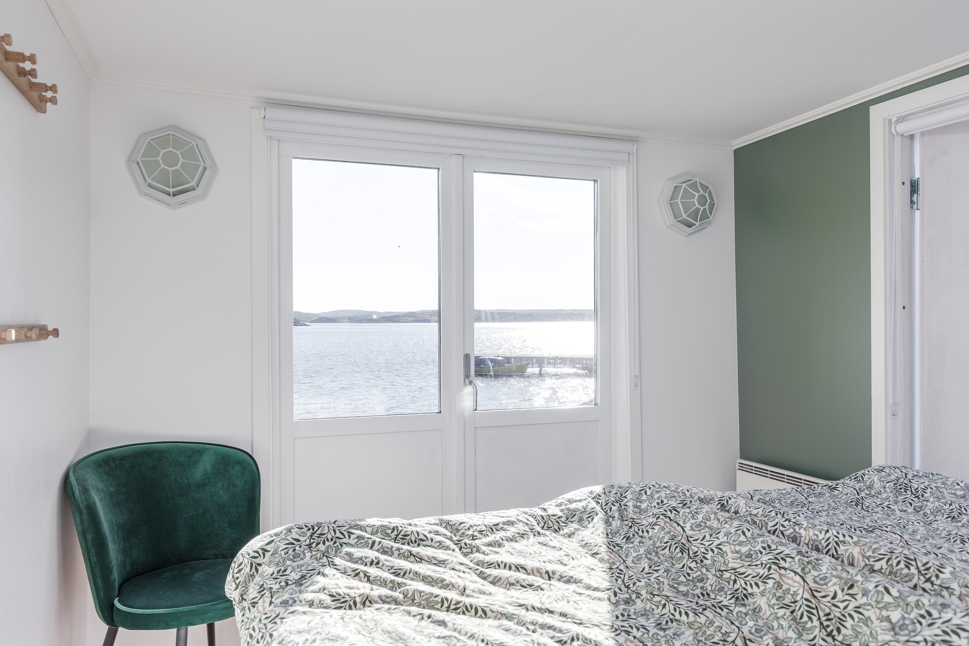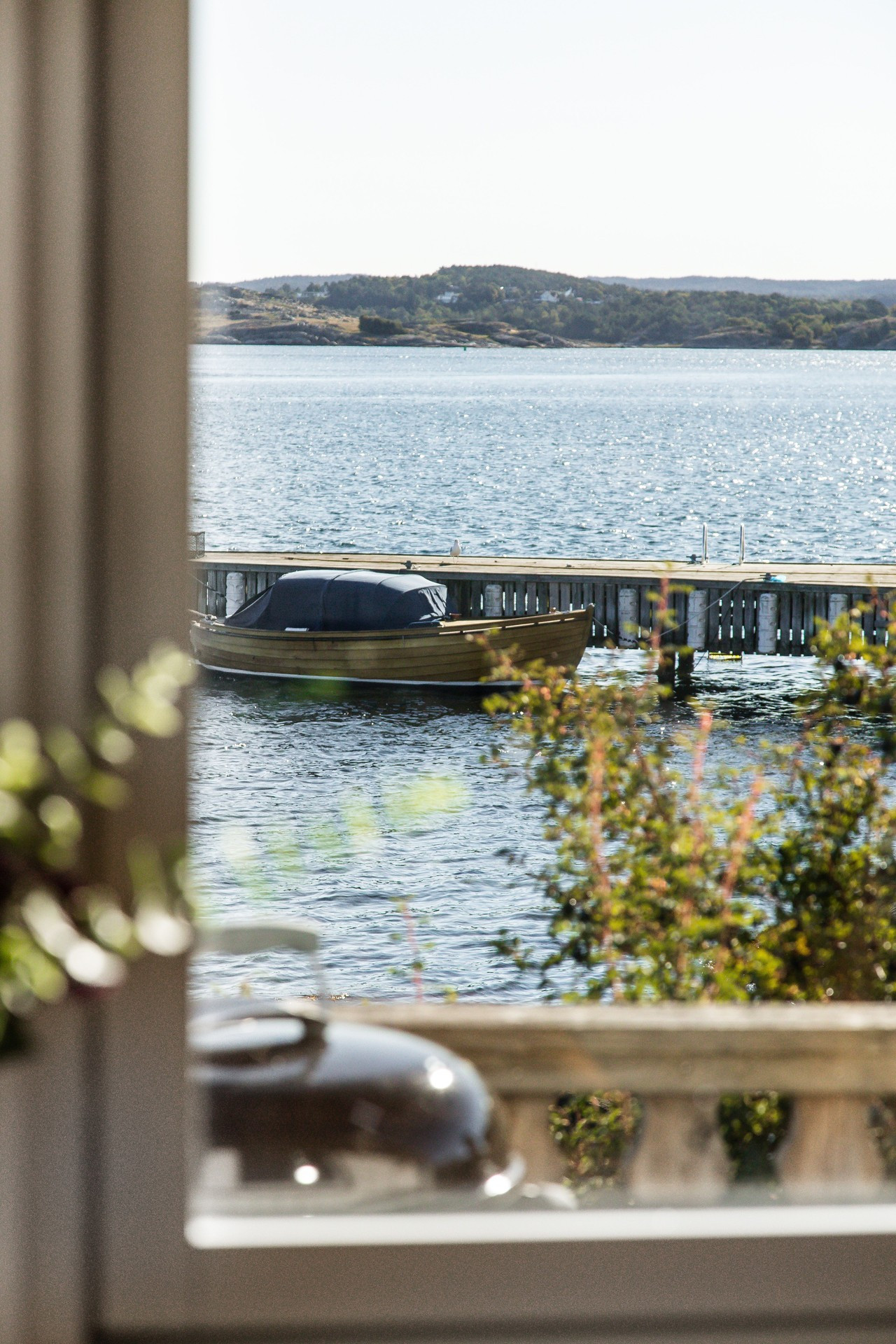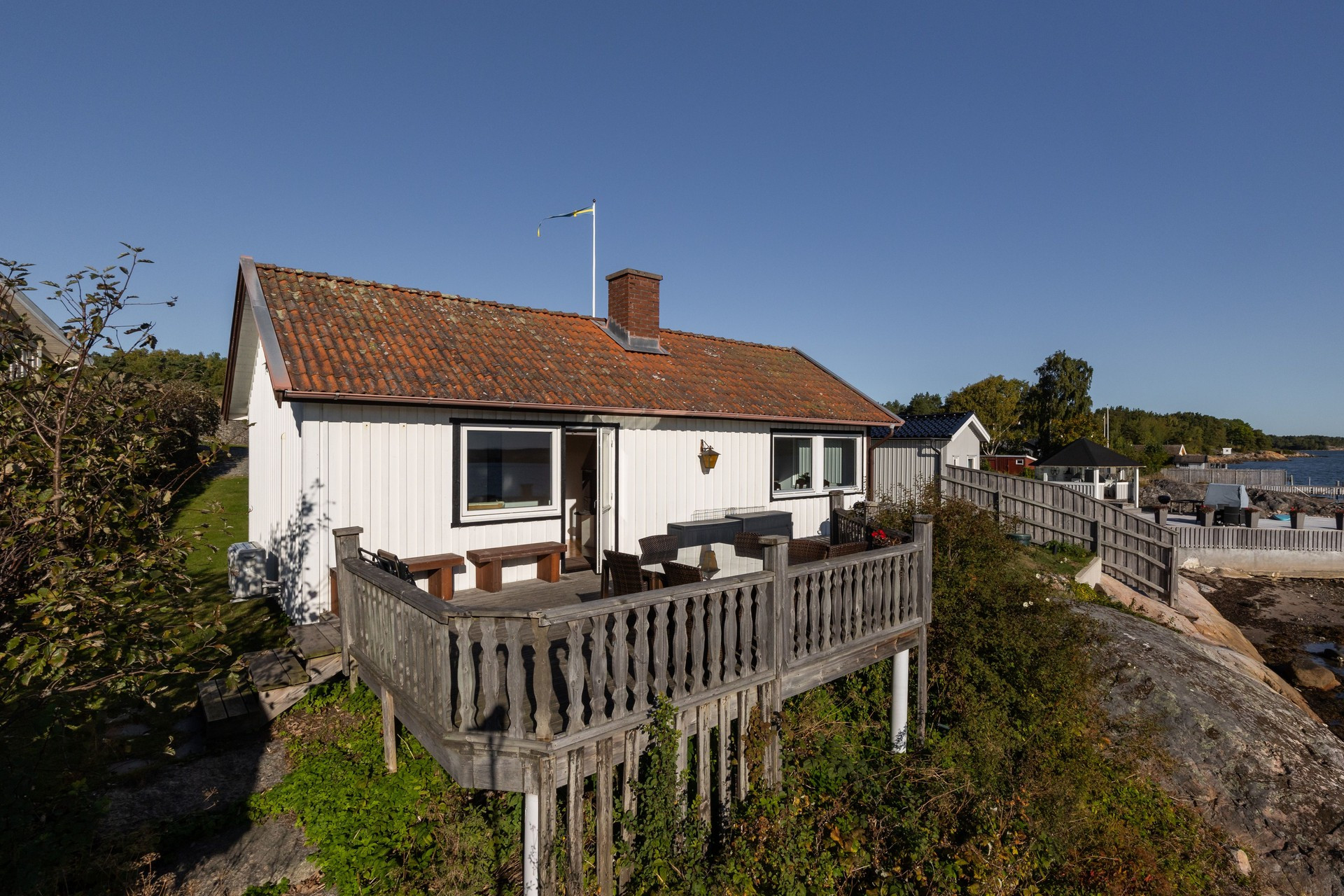 På andra sidan stugan har vi den tilltagna altanen, med ett stort bord och stolar för 6 personer, 4 solstolar och havet precis utanför. Där kan ni sitta länge och njuta av skvalpet från havet och titta på båtarna som åker förbi. Intill stugan ligger gäststugan med en stor dubbelsäng med utsikt över fjorden. Perfekt om man är tex 2 par och vill sova ostört.