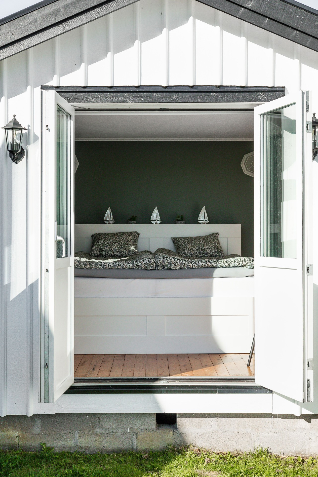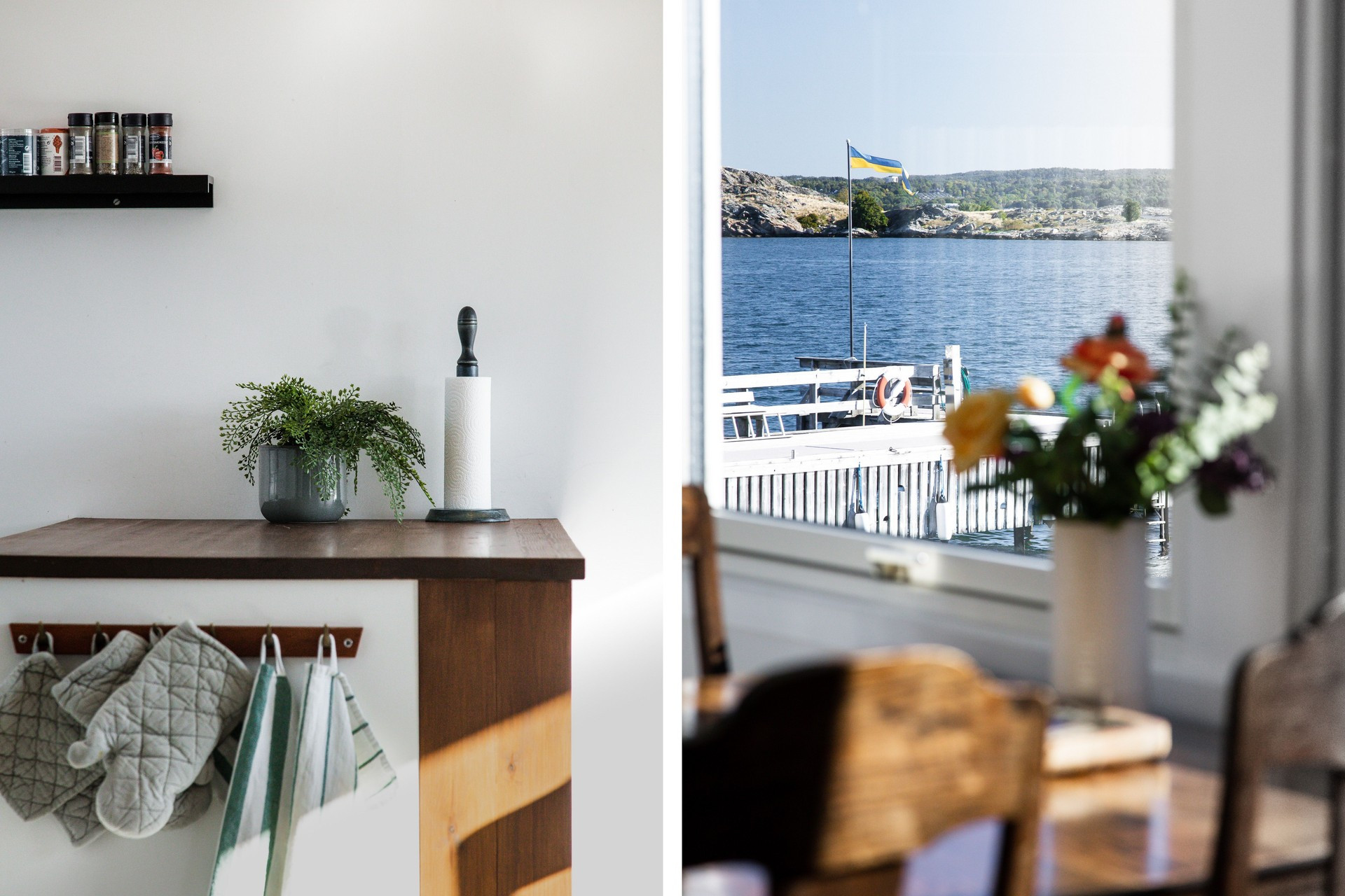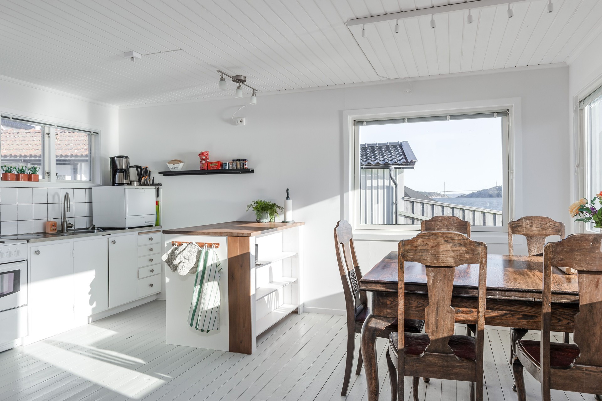 På andra sidan stugan har vi den tilltagna altanen, med ett stort bord och stolar för 6 personer, 4 solstolar och havet precis utanför. Där kan ni sitta länge och njuta av skvalpet från havet och titta på båtarna som åker förbi. Intill stugan ligger gäststugan med en stor dubbelsäng med utsikt över fjorden. Perfekt om man är tex 2 par och vill sova ostört.
