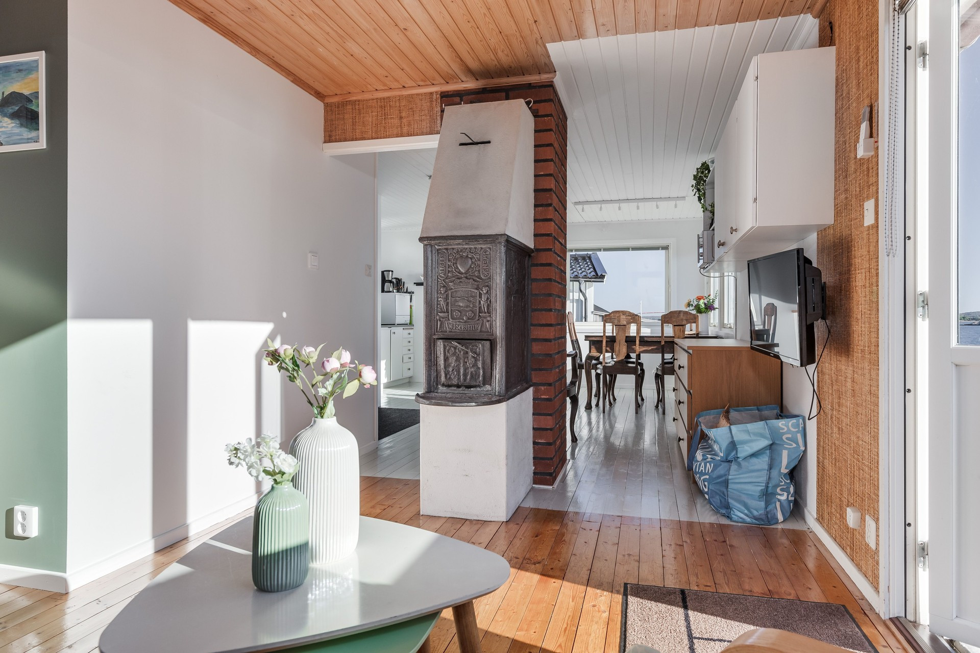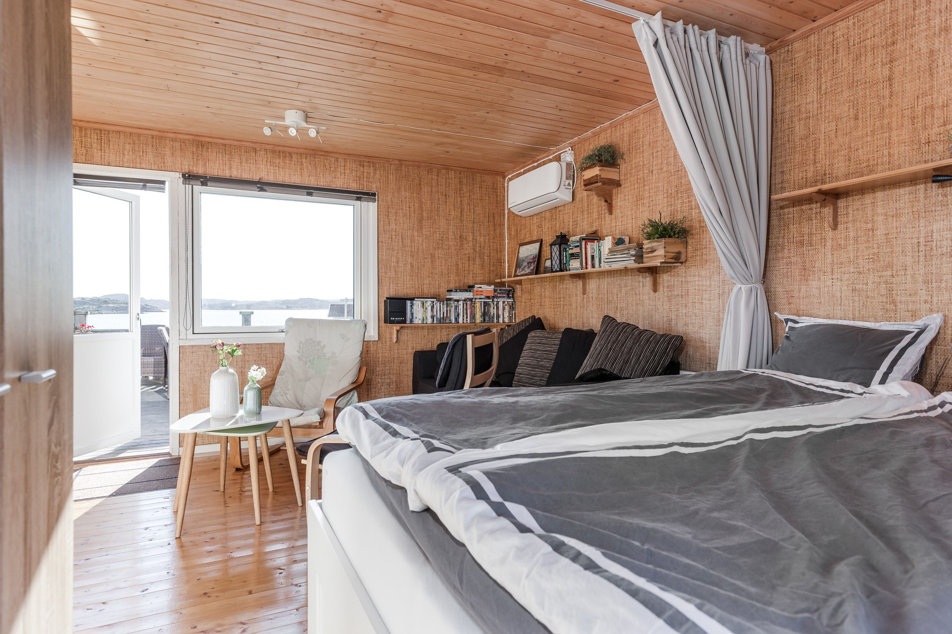 Stugan är väldigt luftig och ljus, med fönster i tre riktningar. Den öppna planlösningen gör att luften från AC/luftvärmepumpen sprider sig lätt och ger hela stugan önskad temperatur. I det stora rummet finns en bäddsoffa med möjlighet till 2 separata sängplatser och en härlig dubbelsäng som lätt skärmas av med mörkläggande draperier. Andra delen av stugan består av hall, badrum, kök med köksö och en matplats med fantastisk utsikt över havet och Tjörnbron. När ni bokar detta boende har ni också möjlighet att lägga till sängkläder och handdukar för 200 kr per person samt avresestädning för 900 kr per vistelse.