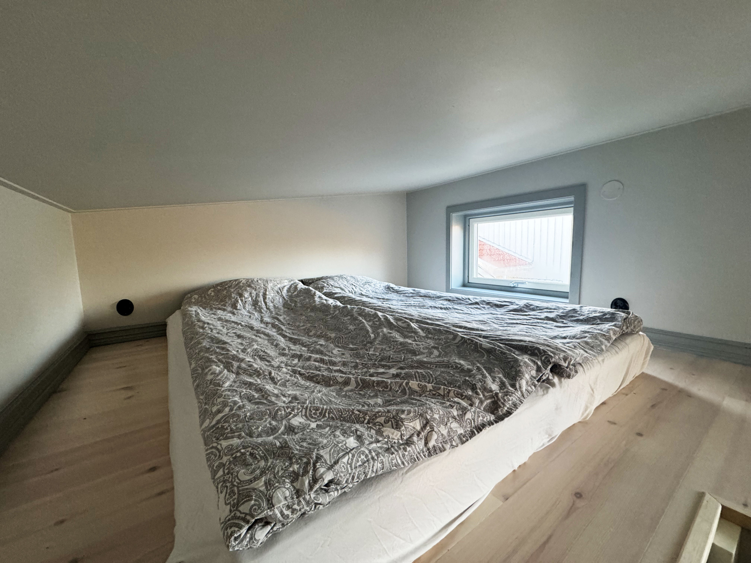 En brant trappa leder upp till ett sovloft där två enkelsängar väntar, perfekt för barn. En kort promenad bort ligger havet och inbjudande stränder för härliga dopp och spännande fiskeutflykter. Här kan du njuta av lugnet och närheten till naturen samtidigt som du har bekvämt boende i denna vackra stuga.
