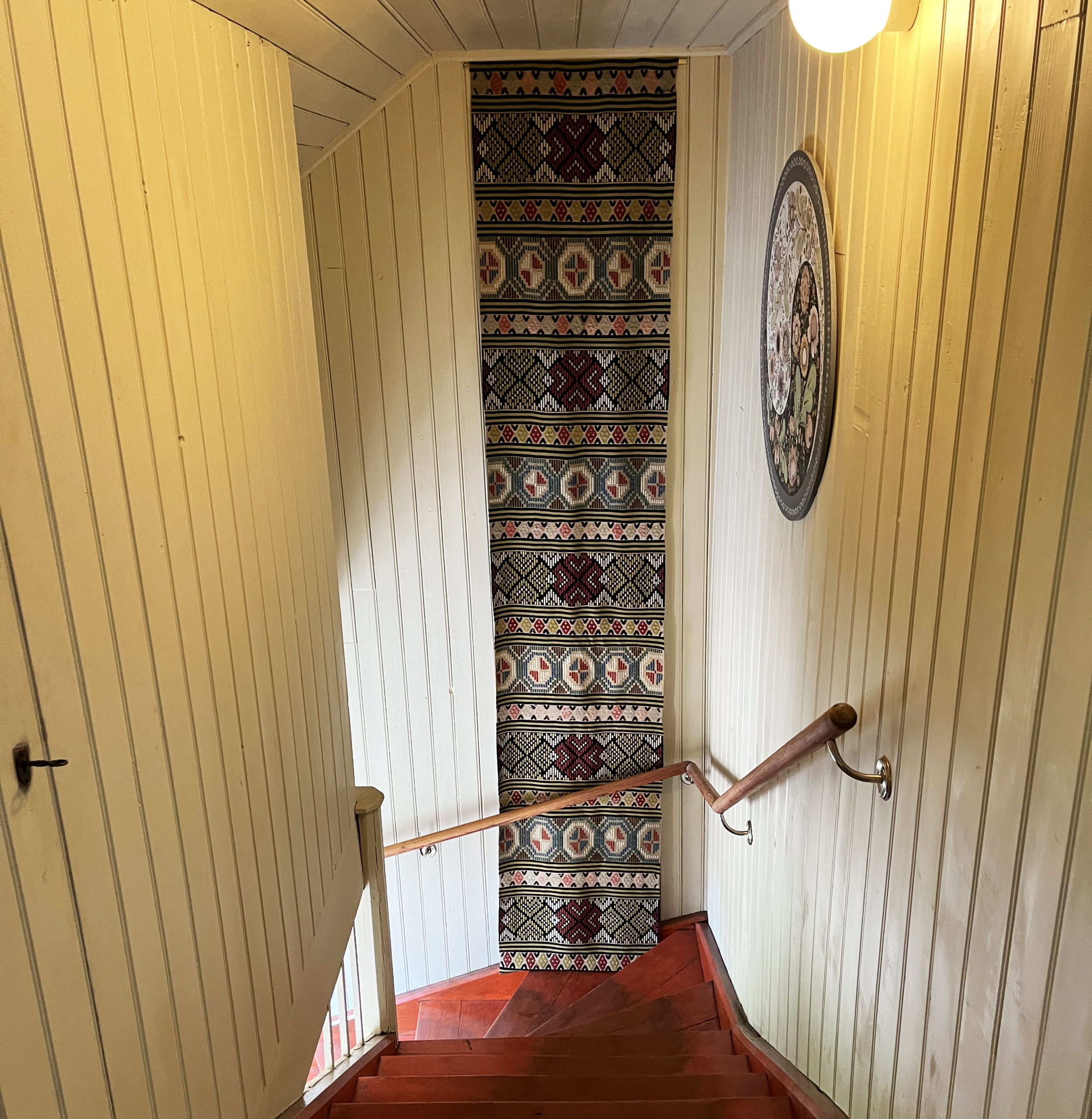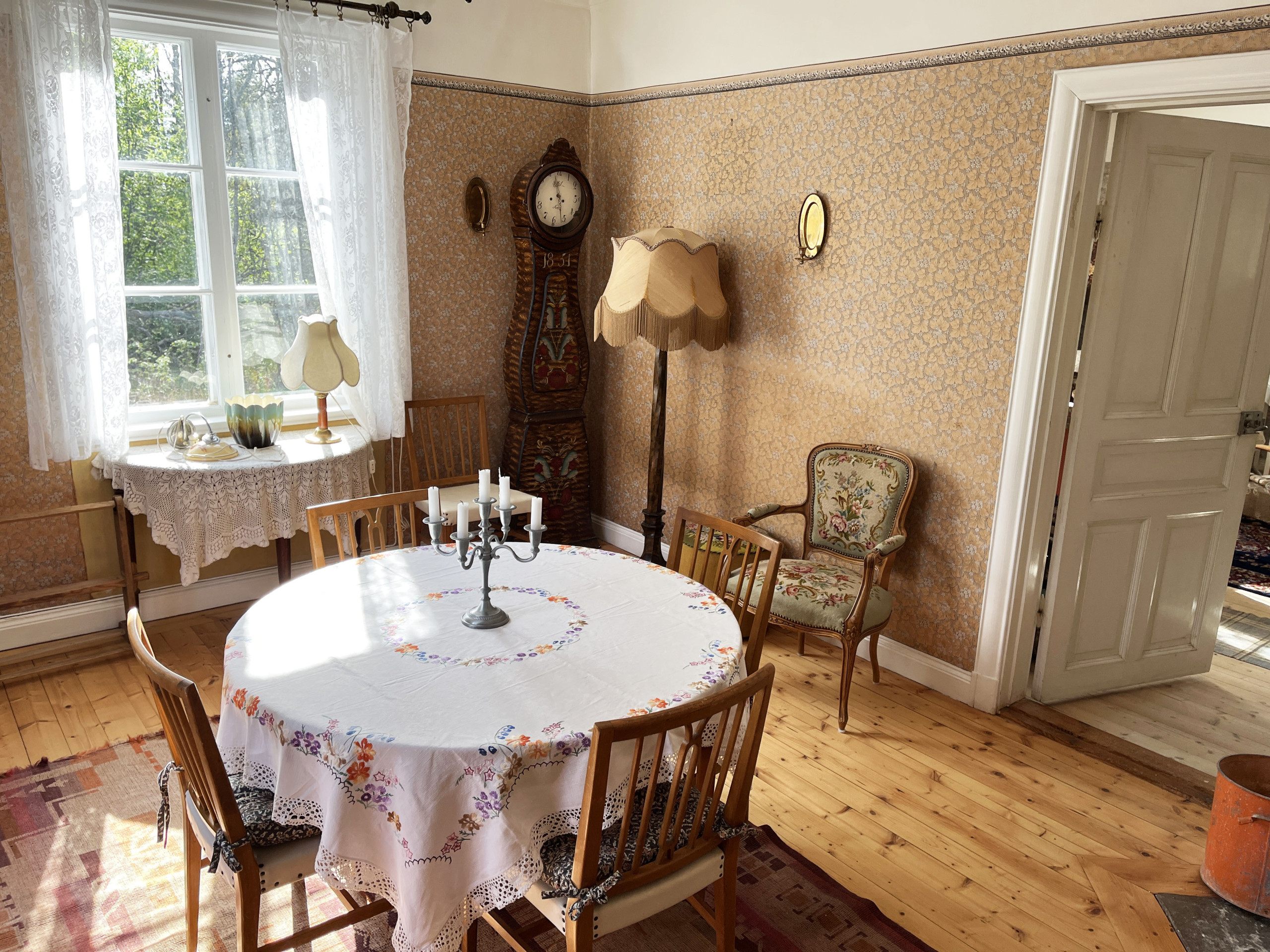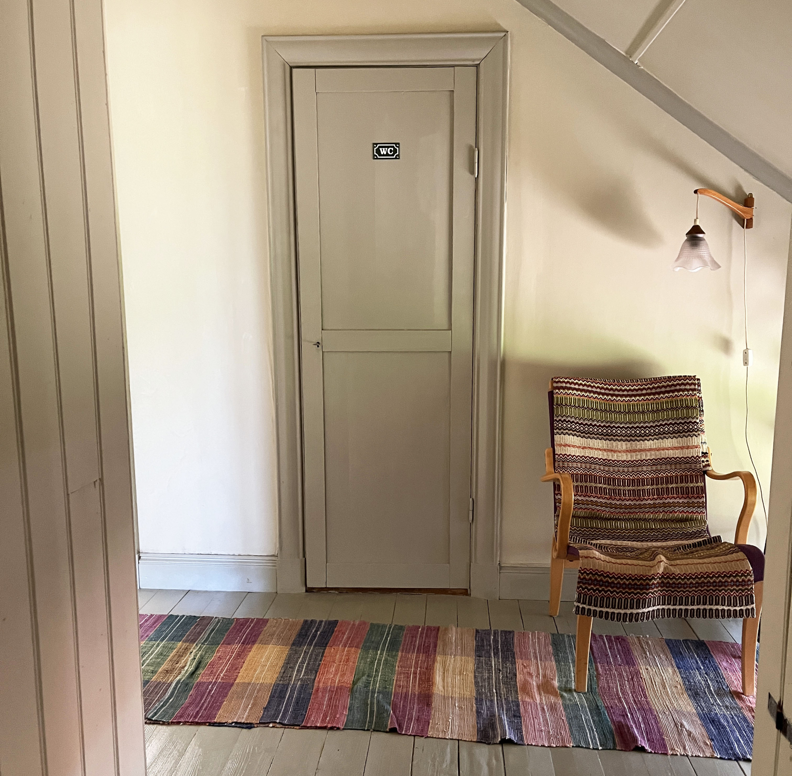 I stora huset finns 1 dubbelsäng på övervåningen och ett rum med 2 enkelsängar när du kommer upp för trappen. Detta rum behöver du passera för att nå sovrummet. En toalett i stora huset. I stora huset finns ett kök som är renoverat med tidstypiska tapeter. I köket finns en vedspis. I vardagsrummet finns en stor eldstad att njuta framför.