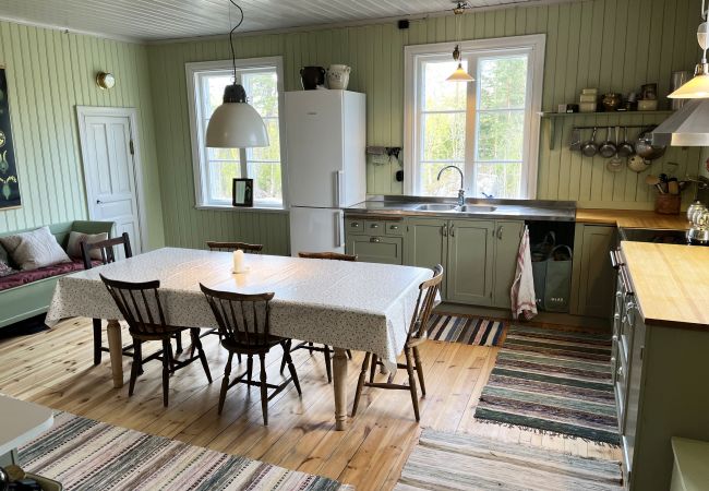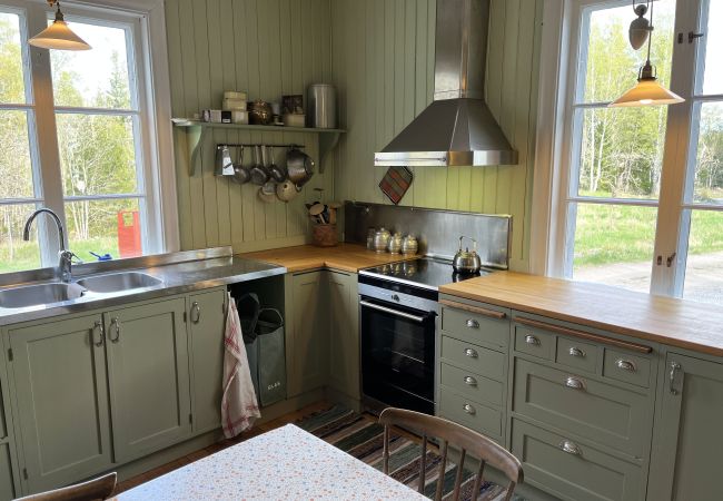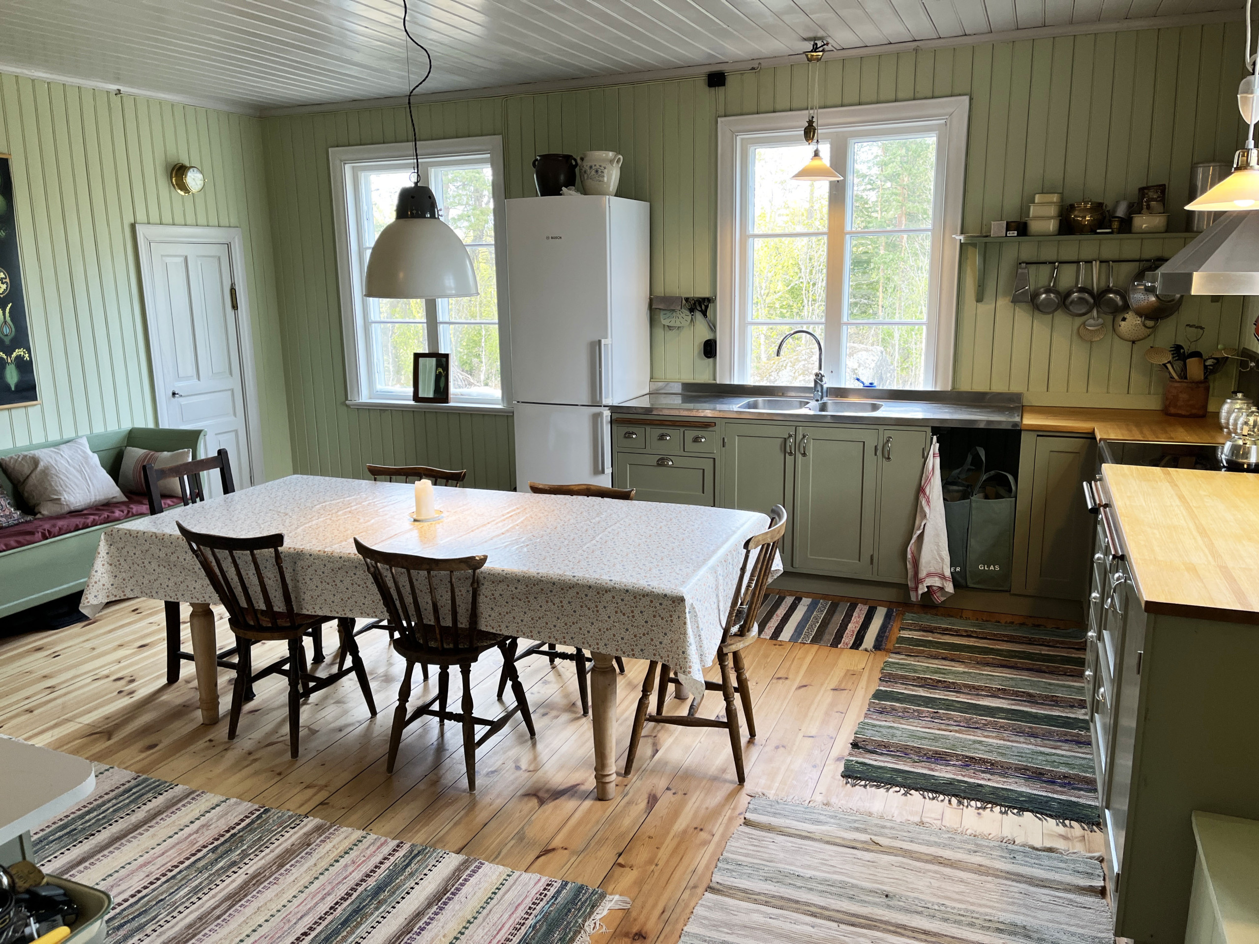 I det rejält tilltagna köket med plats för många sitter återbrukade snickerier från Lidhult, ett snickeri i Småland som tillverkar gedigna kök i trä. Förutom induktionshäll i den moderna elspisen finns möjlighet att laga mat på den ny monterade vedspisen. Förutom kyl och frys i köket kan man använda källaren för svalare förvaring och det stora skafferiet håller sval temperatur de kallare årstiderna.