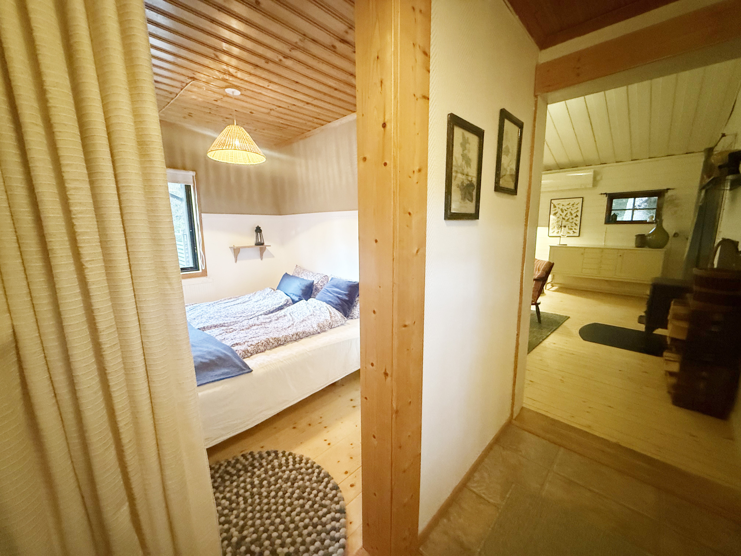 Stugan erbjuder två trivsamma sovrum – ett med en skön dubbelsäng och ett med en praktisk bäddsoffa för två personer. I vardagsrummet finns ytterligare en bäddsoffa för två personer. En fräsch toalett finns i huset, duschen är utomhus men erbjuder varmvatten. Det rymliga köket bjuder in till gemensamma måltider och långa frukostar, medan vardagsrummet skapar utrymme för lugn avkoppling eller familjespel i kvällens rofyllda sken. Här får du den perfekta basen för både avkoppling och äventyr.
