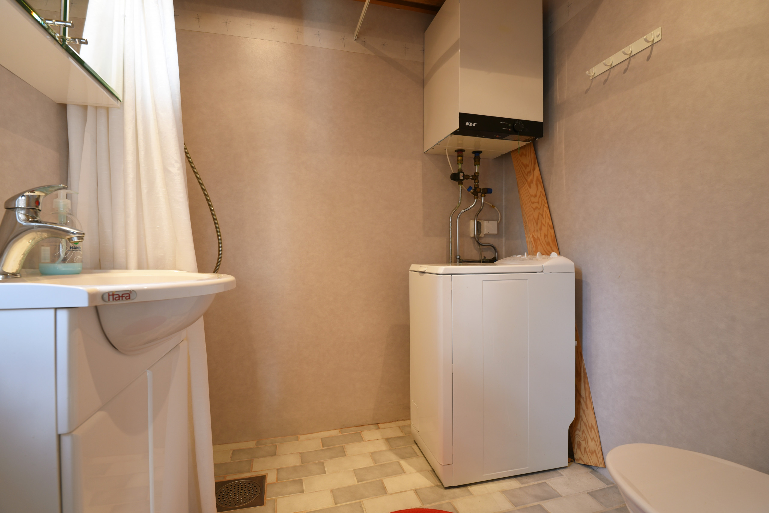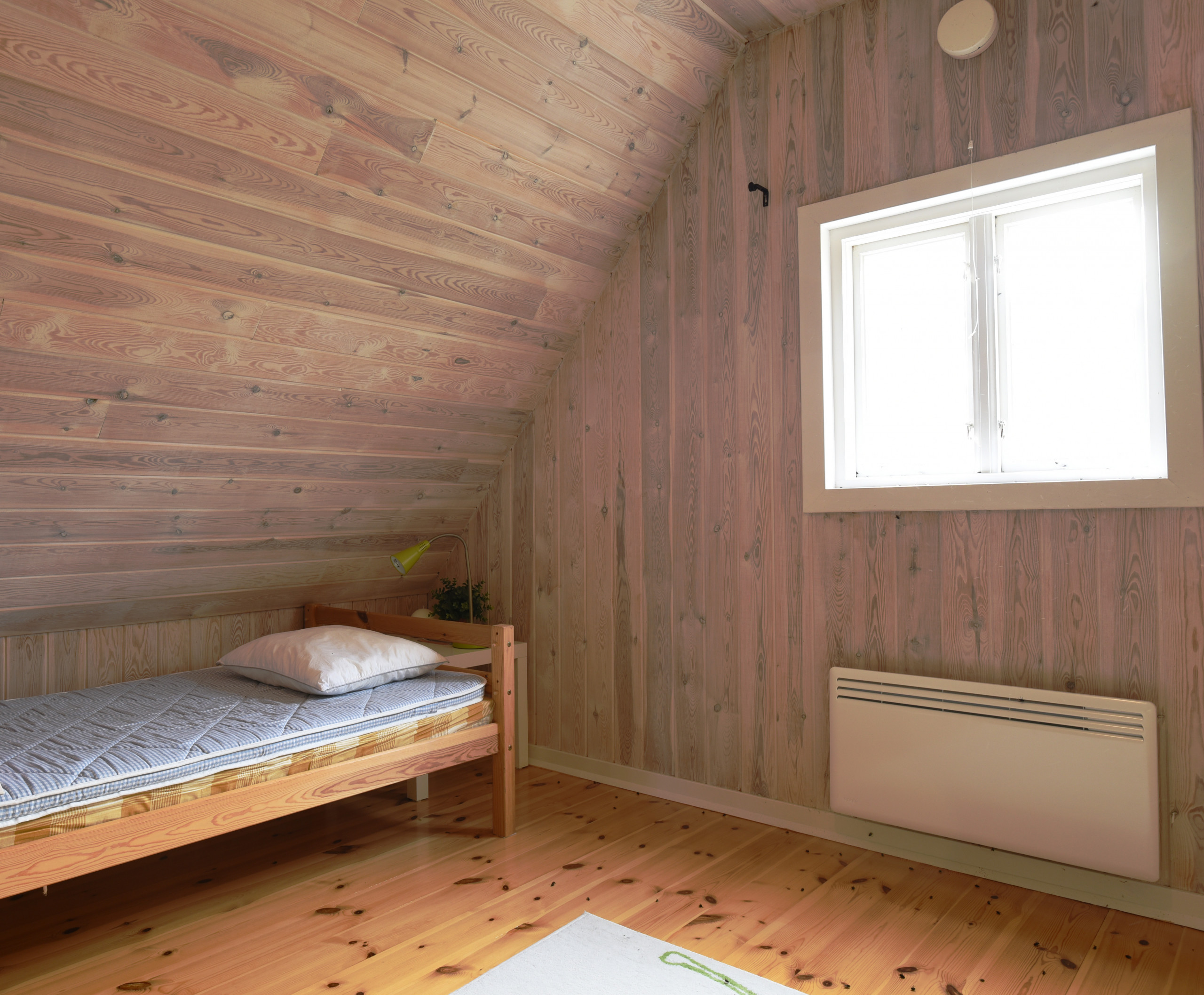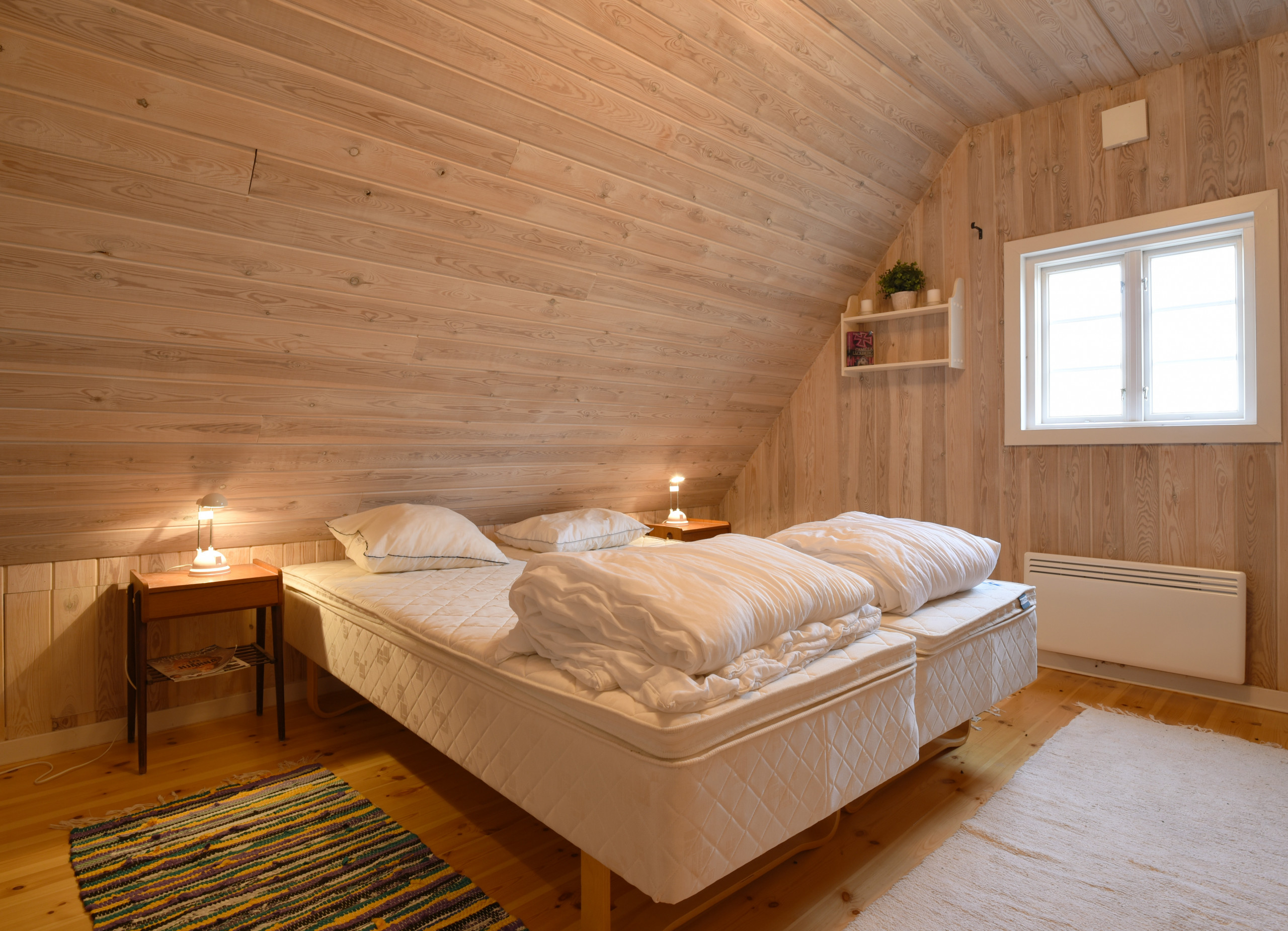 Kök och allrum har en öppen planlösning med stora ljusinsläpp. På första våning har ni ett av sovrummen med enkelsäng och här finns också ett badrum med dusch. En trappa leder er upp till andra våningen där ni här ett sovrum med en dubbelsäng och en enkelsäng. Nästa sovrum på övervåningen har tre enkelsängar.