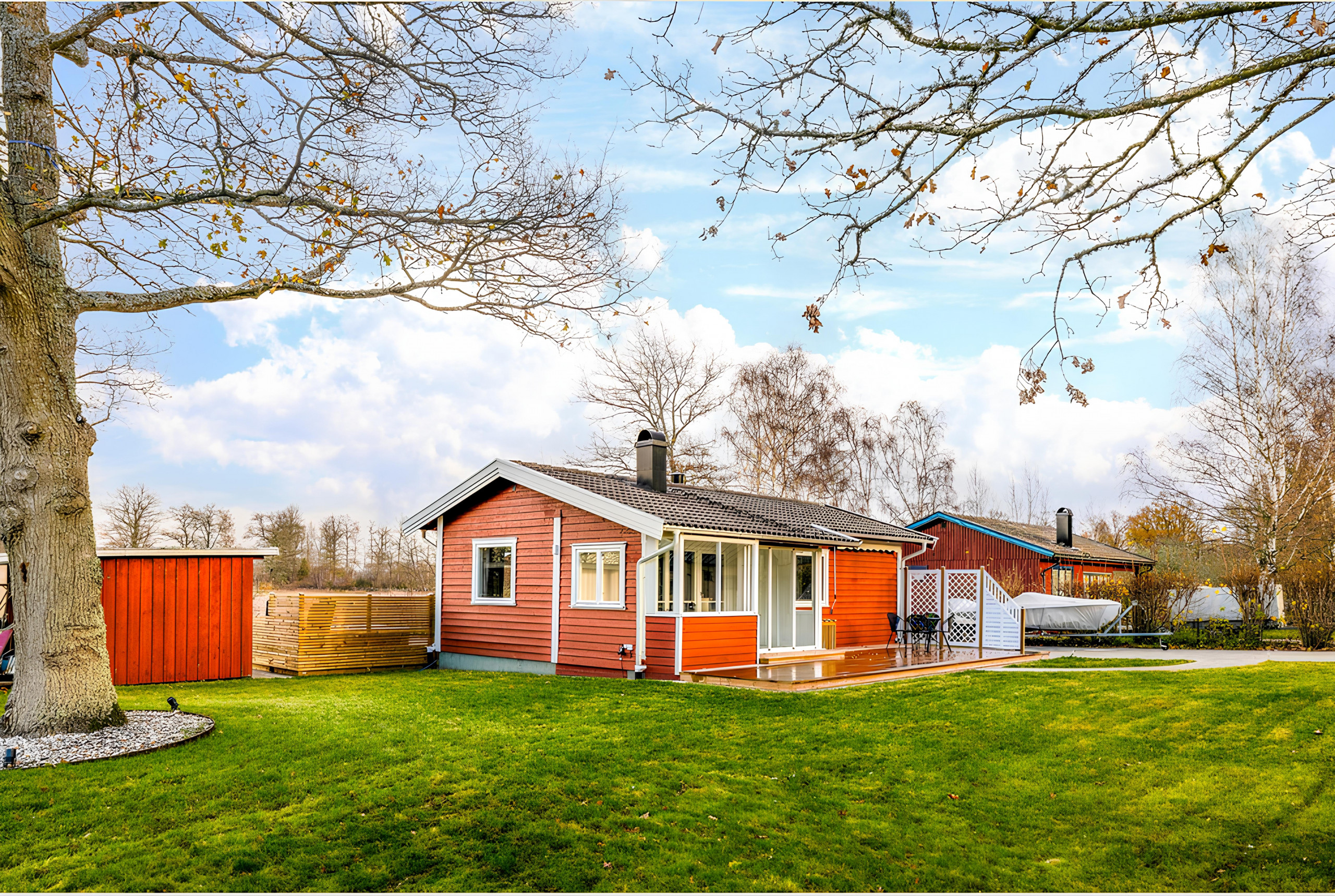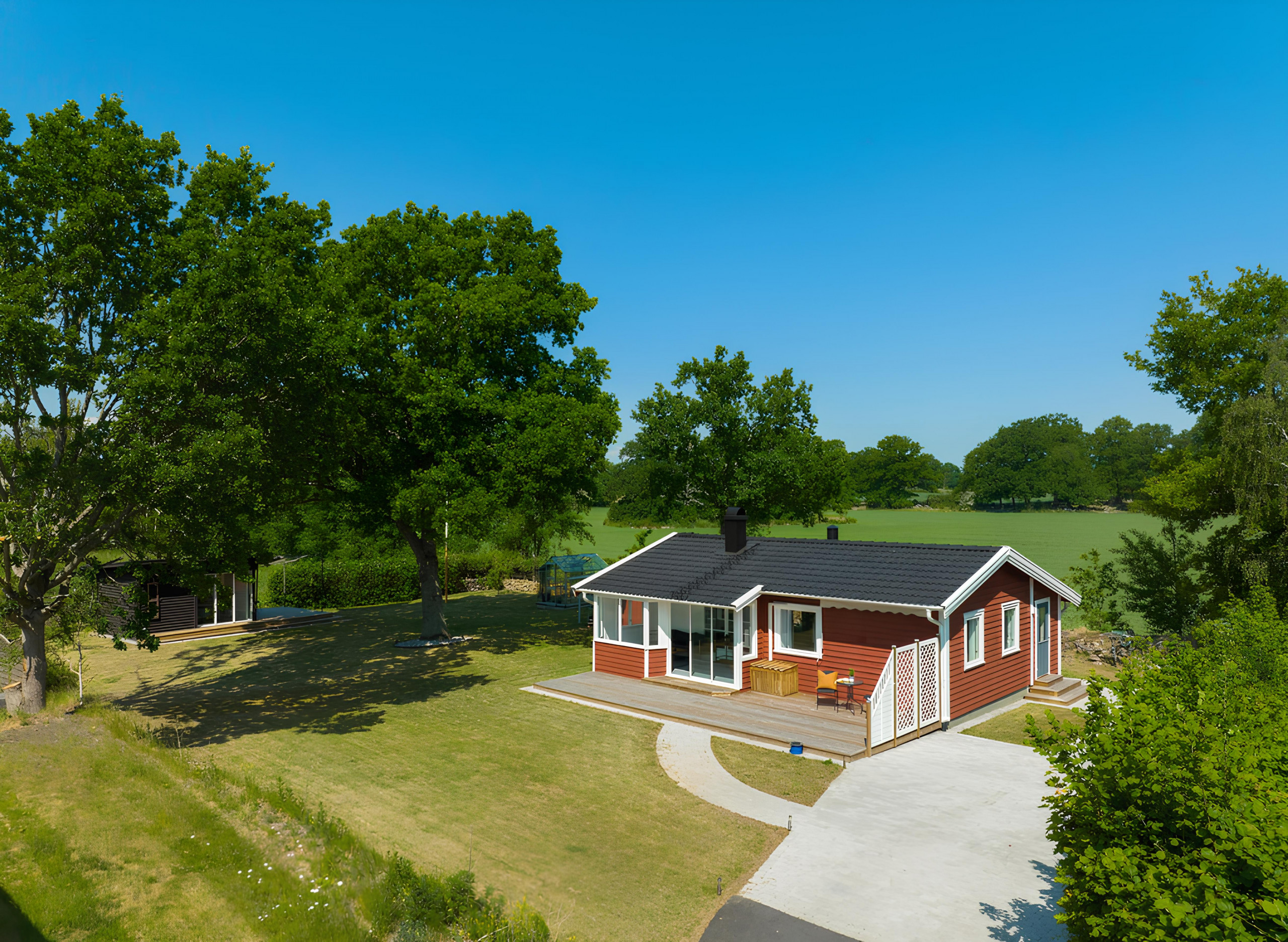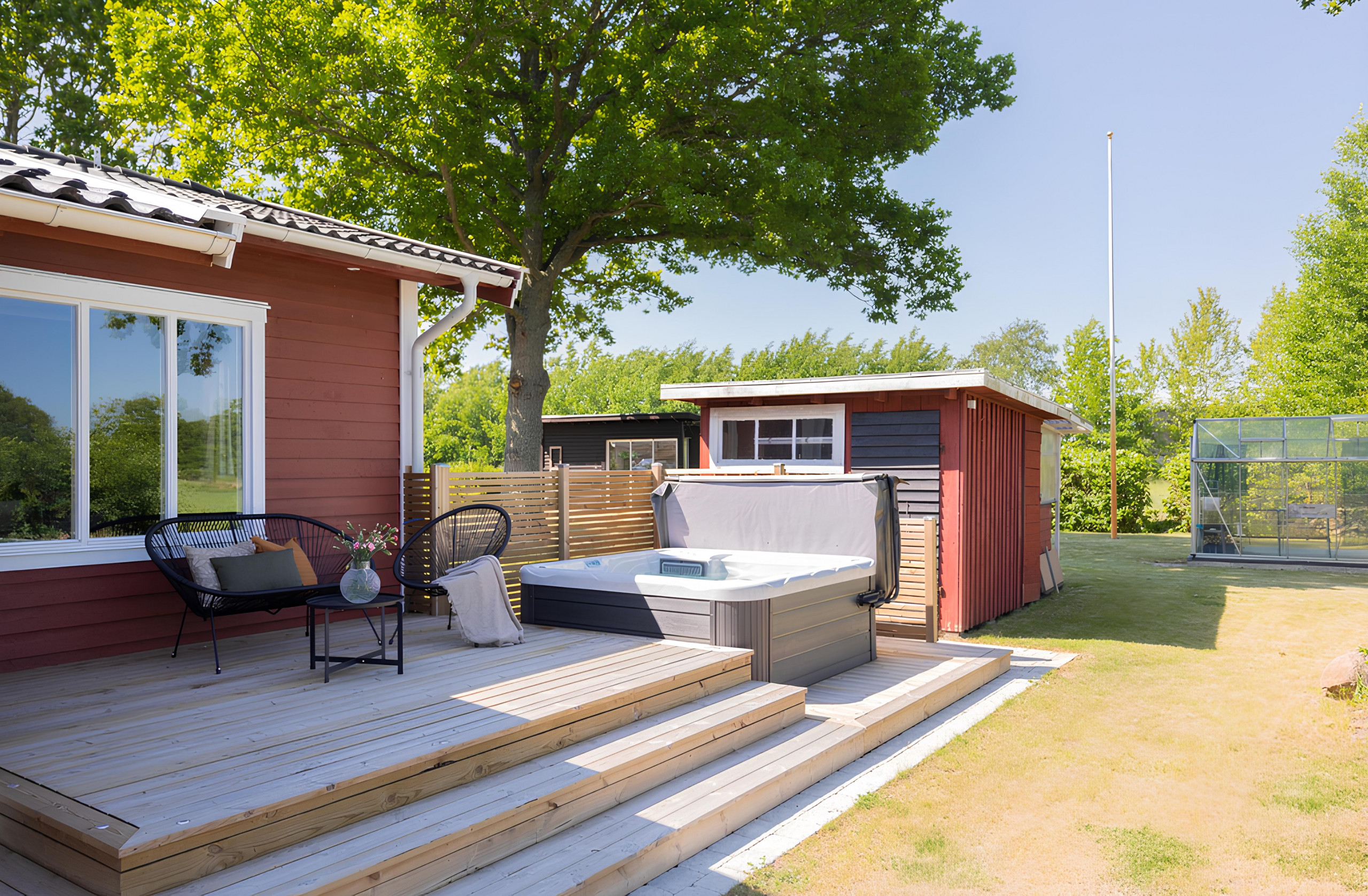 Den här stugan ligger med ett rofyllt läge med insynsskyddad baksida mot ett åkerfält. Invändigt finner ni ett vardagsrum med braskamin och en bäddsoffa, ett fint kök i öppen planlösning med vardagsrummet, två sovrum med enkelsängar samt ett badrum utrustat med både dusch och tvättmaskin. Från vardagsrummet når ni ett stort inbyggt uterum som ni kan vistas i om det är dåligt väder. På baksidan som ligger mot åkerfältet finner ni ett SPA som är kringbyggt med en terrass. Tomten är bra för olika aktiviteter, då den är plan och inte kuperad. Intill huset finner ni ett annex med en säng för två personer. På några minuter når ni den lilla havsviken.